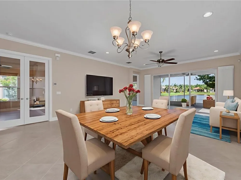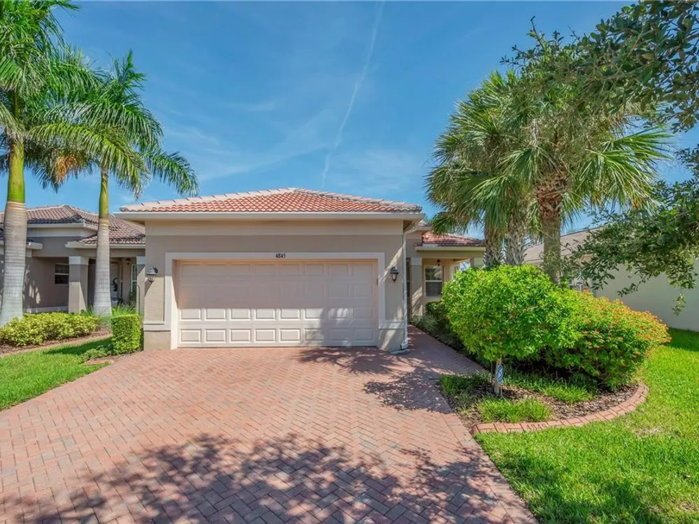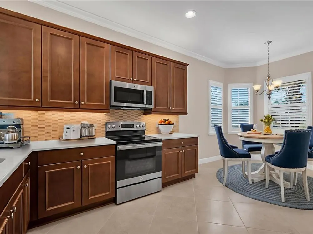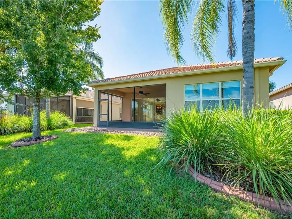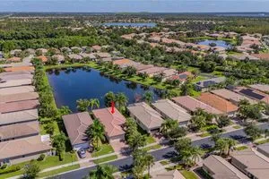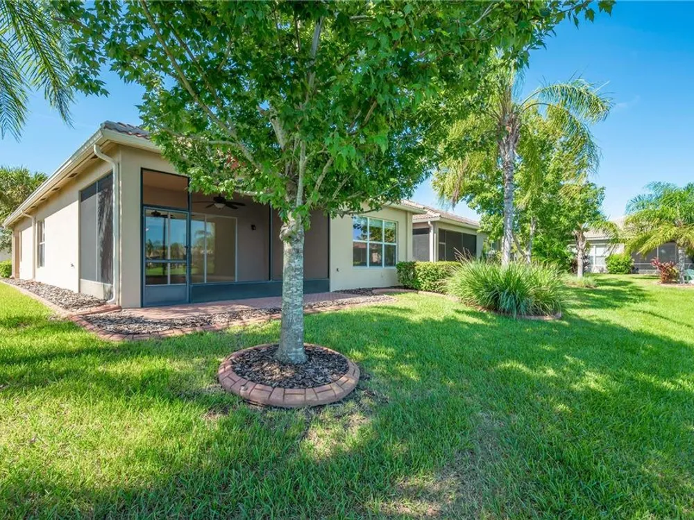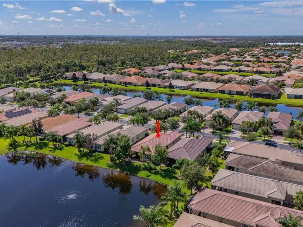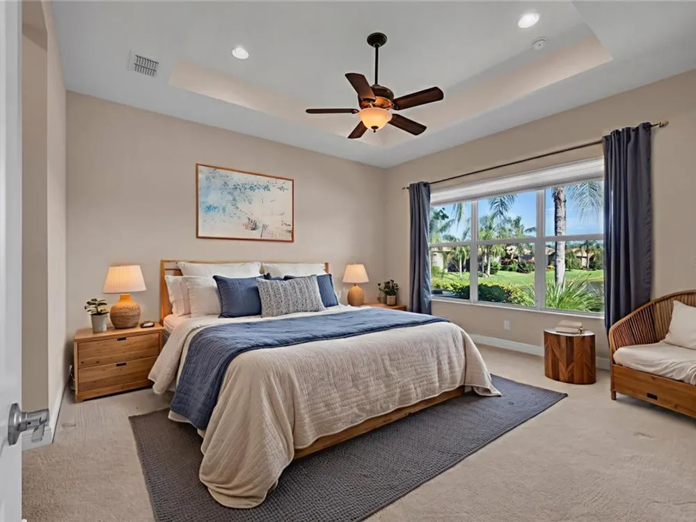 One or more photo(s) has been virtually staged. Welcome to this spectacular move-in-ready home, where elegance meets comfort in one of Tampa Bay’s premier 55+ communities, Valencia Lakes. This stunning Capri model, part of the coveted Signature Collection, offers one of the most sought-after floor plans in the community and showcases breathtaking water views from the moment you step inside. The home’s curb appeal is unmatched, featuring a brick paver driveway and walkway, a beautiful barrel tile roof, and professionally maintained landscaping. Step through the front door and you’ll be greeted by a 12-foot coffered ceiling in the foyer with crown molding, setting the tone for the open and airy design throughout. Large floor tiles, laid diagonally, span the main living areas and the spacious den, which can easily function as a third bedroom and features elegant double glass French doors. The great room is an entertainer’s dream, with triple 8-foot sliding glass doors that lead to a covered, screened lanai offering a peaceful and picturesque water view. Whether you're enjoying your morning coffee or hosting friends, this tranquil outdoor space is sure to become your favorite retreat. The gourmet kitchen is equally impressive, boasting upgraded quartz countertops, an undermount stainless steel sink with an R/O system, 42" soft-close maple cabinets with roll-out shelving, a pantry cabinet, under and over-cabinet lighting, a designer backsplash, and upgraded stainless steel appliances. A charming breakfast bay window floods the space with natural light, while the adjacent informal dining room provides a cozy spot for special meals. Retreat to the primary suite where comfort and luxury blend seamlessly. The bedroom features a coffered ceiling, newly installed plush carpet, and two large walk-in closets with custom built-ins. The en-suite bath is your private oasis, complete with dual vanities topped with quartz, maple cabinetry, a spacious walk-in shower, and a separate Roman tub for soaking. Guests will enjoy their own private space with a generously sized second bedroom and a well-appointed second bath featuring a tub/shower combo, full tile surround, quartz countertop with extended “banjo” top, and maple cabinetry. A separate laundry room adds to the home’s functionality with an upgraded GE front-load washer and dryer, utility sink, and additional cabinetry for storage. Thoughtful upgrades continue throughout the home, including luxury window treatments and plantation shutters, extra recessed lighting, an insulated garage door with epoxy flooring, a water softener system, whole-home surge protector, hurricane shutters, landscape curbing, gutters, a new water heater (2022), a brand-new HVAC system installed in 2024 and more. Valencia Lakes is known for its vibrant lifestyle and top-tier amenities, including a 40,000 square-foot clubhouse, 24-hour fitness center, resort-style pools, on-site bistro, tennis and pickleball courts, bocce ball, dozens of clubs, live entertainment, arts and crafts studios, cooking classes, walking trails, and more. This is not just a home—it’s a lifestyle. Don’t miss the opportunity to make this immaculate, move-in-ready residence your own. Come experience the best of 55+ living at Valencia Lakes today.