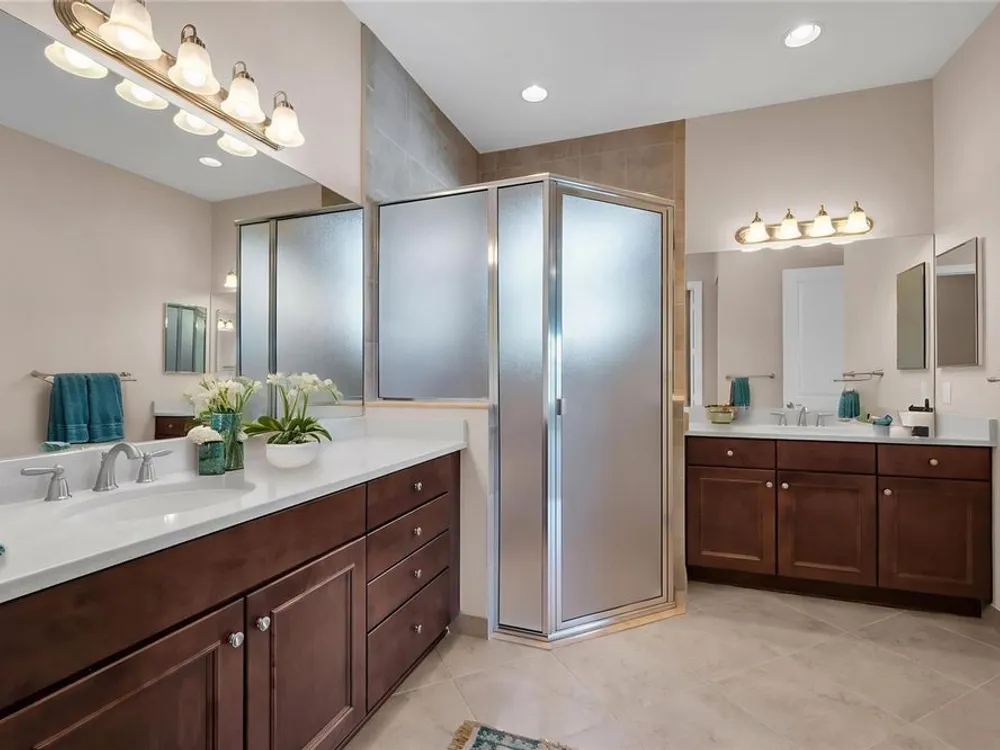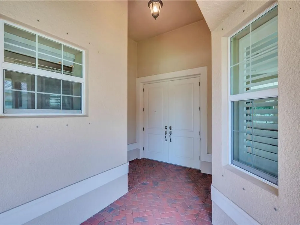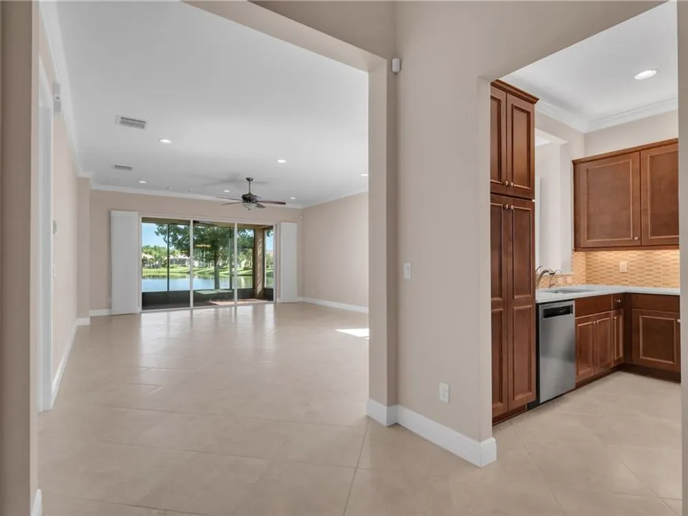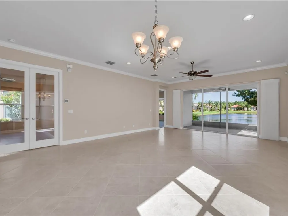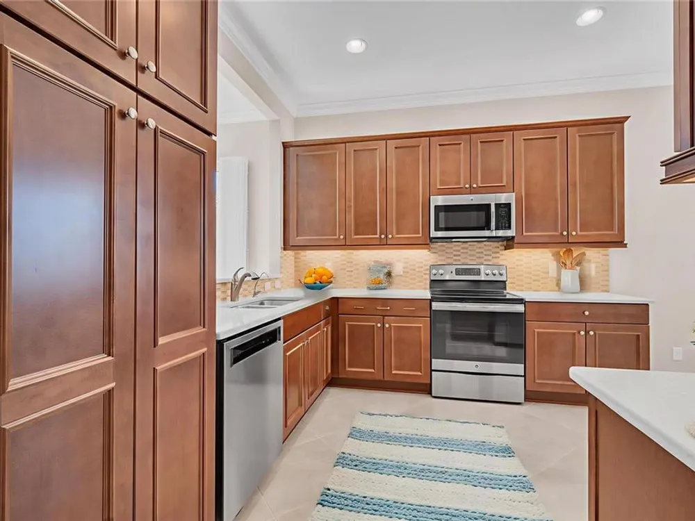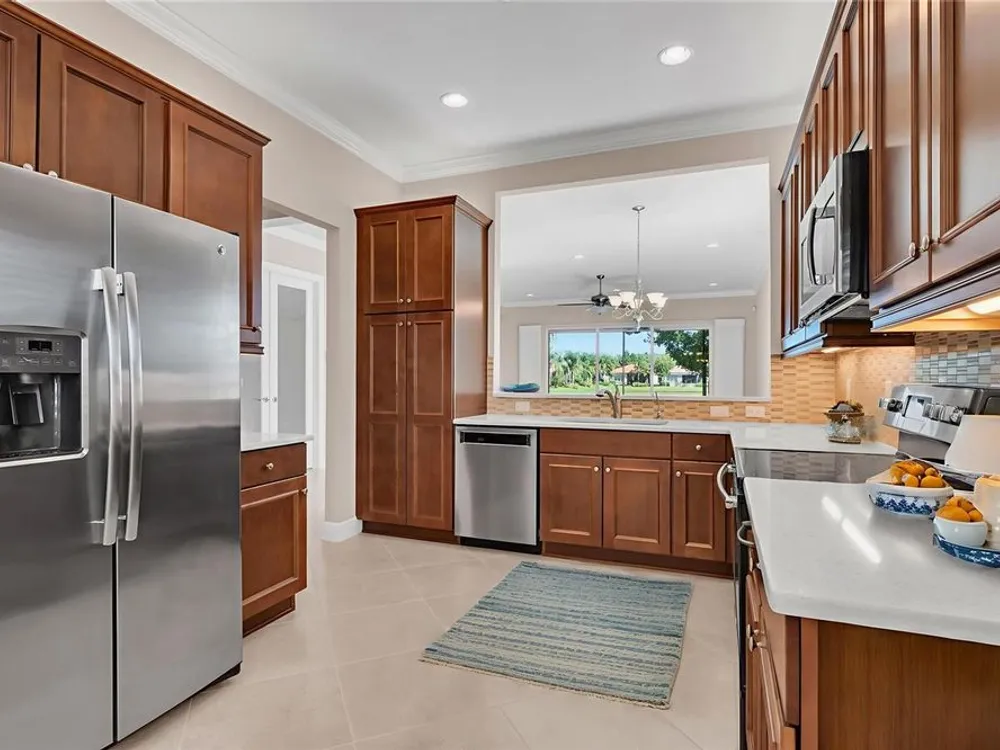 One or more photo(s) has been virtually staged. Welcome to this spectacular move-in-ready home, where elegance meets comfort in one of Tampa Bay’s premier 55+ communities, Valencia Lakes. This stunning Capri model, part of the coveted Signature Collection, offers one of the most sought-after floor plans in the community and showcases breathtaking water views from the moment you step inside. The home’s curb appeal is unmatched, featuring a brick paver driveway and walkway, a beautiful barrel tile roof, and professionally maintained landscaping. Step through the front door and you’ll be greeted by a 12-foot coffered ceiling in the foyer with crown molding, setting the tone for the open and airy design throughout. Large floor tiles, laid diagonally, span the main living areas and the spacious den, which can easily function as a third bedroom and features elegant double glass French doors. The great room is an entertainer’s dream, with triple 8-foot sliding glass doors that lead to a covered, screened lanai offering a peaceful and picturesque water view. Whether you're enjoying your morning coffee or hosting friends, this tranquil outdoor space is sure to become your favorite retreat. The gourmet kitchen is equally impressive, boasting upgraded quartz countertops, an undermount stainless steel sink with an R/O system, 42" soft-close maple cabinets with roll-out shelving, a pantry cabinet, under and over-cabinet lighting, a designer backsplash, and upgraded stainless steel appliances. A charming breakfast bay window floods the space with natural light, while the adjacent informal dining room provides a cozy spot for special meals. Retreat to the primary suite where comfort and luxury blend seamlessly. The bedroom features a coffered ceiling, newly installed plush carpet, and two large walk-in closets with custom built-ins. The en-suite bath is your private oasis, complete with dual vanities topped with quartz, maple cabinetry, a spacious walk-in shower, and a separate Roman tub for soaking. Guests will enjoy their own private space with a generously sized second bedroom and a well-appointed second bath featuring a tub/shower combo, full tile surround, quartz countertop with extended “banjo” top, and maple cabinetry. A separate laundry room adds to the home’s functionality with an upgraded GE front-load washer and dryer, utility sink, and additional cabinetry for storage. Thoughtful upgrades continue throughout the home, including luxury window treatments and plantation shutters, extra recessed lighting, an insulated garage door with epoxy flooring, a water softener system, whole-home surge protector, hurricane shutters, landscape curbing, gutters, a new water heater (2022), a brand-new HVAC system installed in 2024 and more. Valencia Lakes is known for its vibrant lifestyle and top-tier amenities, including a 40,000 square-foot clubhouse, 24-hour fitness center, resort-style pools, on-site bistro, tennis and pickleball courts, bocce ball, dozens of clubs, live entertainment, arts and crafts studios, cooking classes, walking trails, and more. This is not just a home—it’s a lifestyle. Don’t miss the opportunity to make this immaculate, move-in-ready residence your own. Come experience the best of 55+ living at Valencia Lakes today.