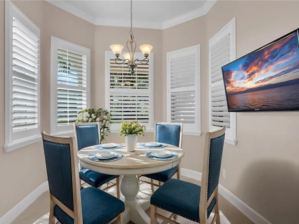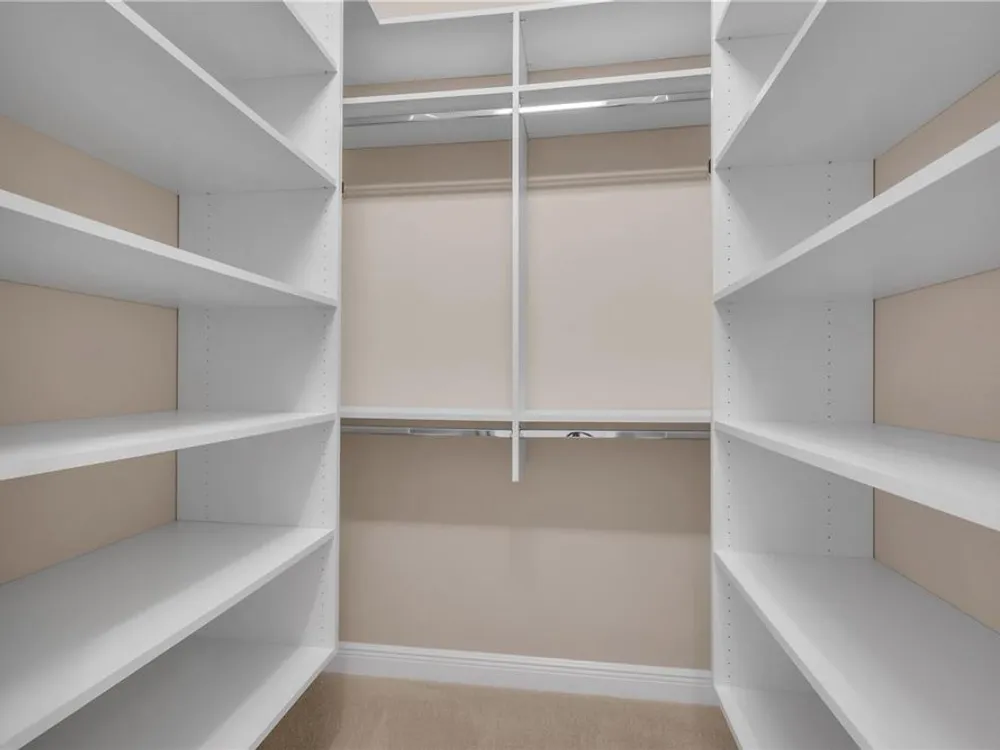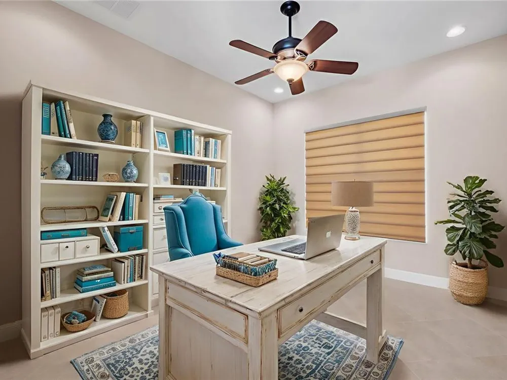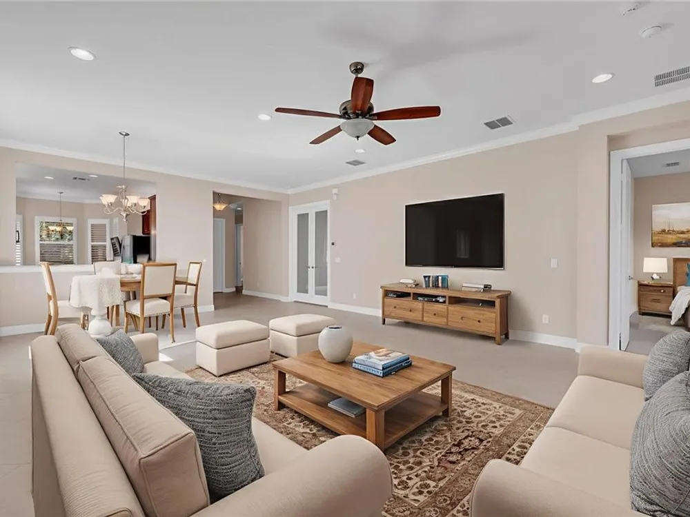 - Ceiling Fan(s), Crown Molding, Eat-in Kitchen, High Ceilings, Open Floorplan, Main Level Primary, Solid Surface Counters, Thermostat, Walk-In Closet(s), Window Treatments