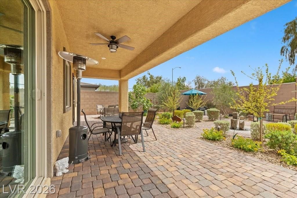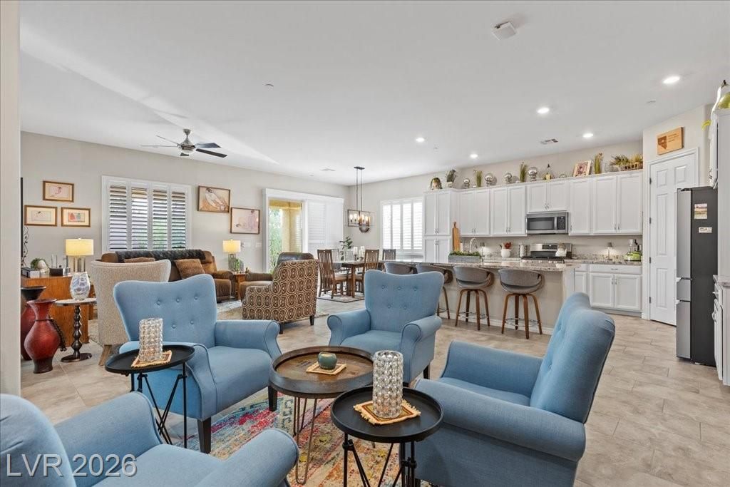 Welcome to the resort style living, guard gated, 55+ community: Heritage at Cadence. You will finds tons of upgrades: a new pantry/cabinet installed at end of cabinets in kitchen, roll out drawers in all cabinets throughout the home, plantation shutters, front and back security doors, cafe style fridge, water softener, new irrigation with a fertilizer system, beautifully landscaped back yard with water fountain and firepit, kitchen, landscaping lights, outdoor speakers and a dog run, linen cabinet in primary closet, and cabinets in laundry room totalling $54,500. 3 fruit trees in the backyard, 1 lime and 1 meyer lemon on the west side and 1 fig on the east side. 3rd bedroom was turned into a den. Bosch dishwasher. Enjoy world class amenities with a robust social calendar, pool, fitness center, tennis and pickleball courts and 2 dog parks. Furniture is negotiable and can be sold outside of escrow.