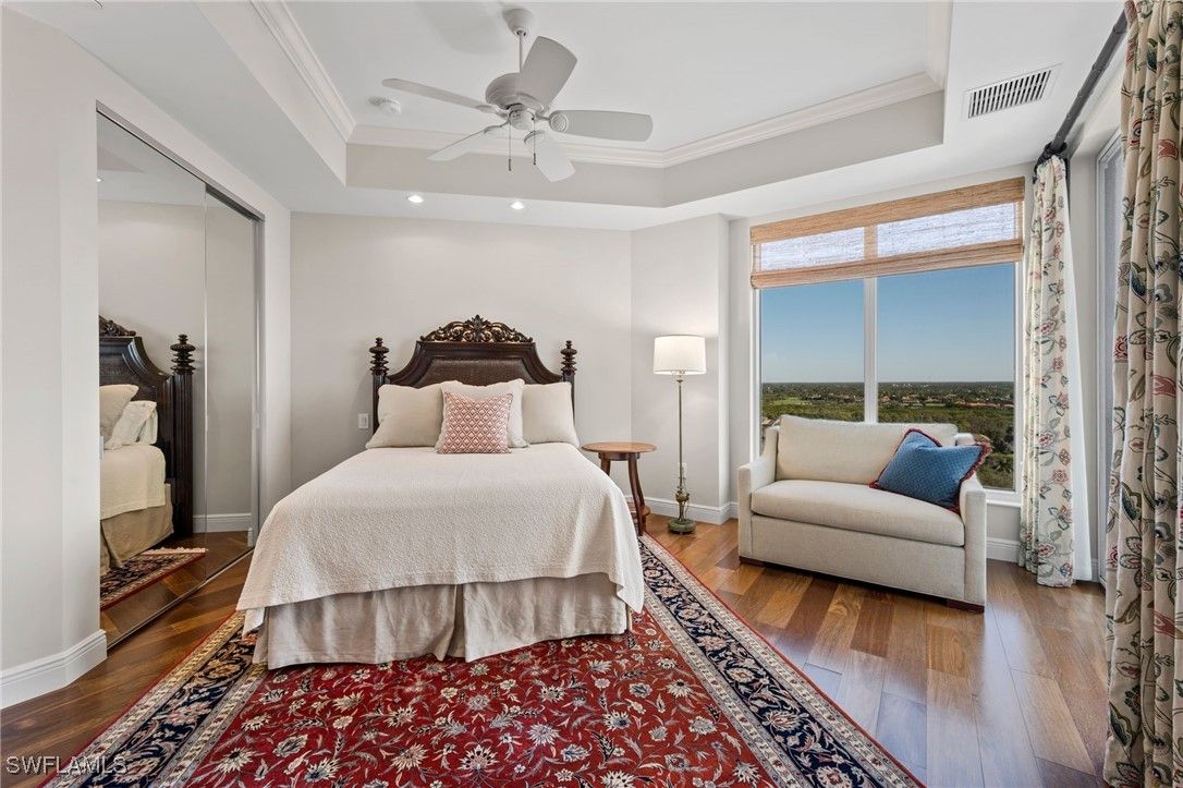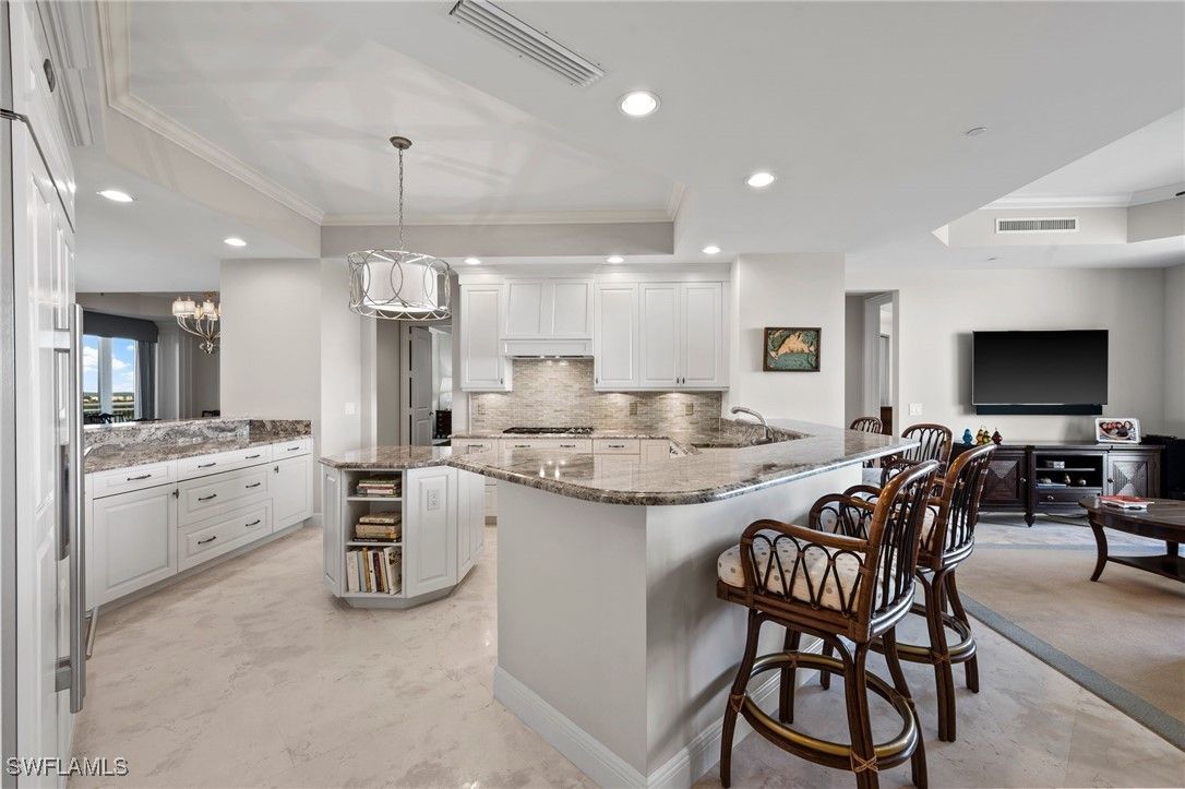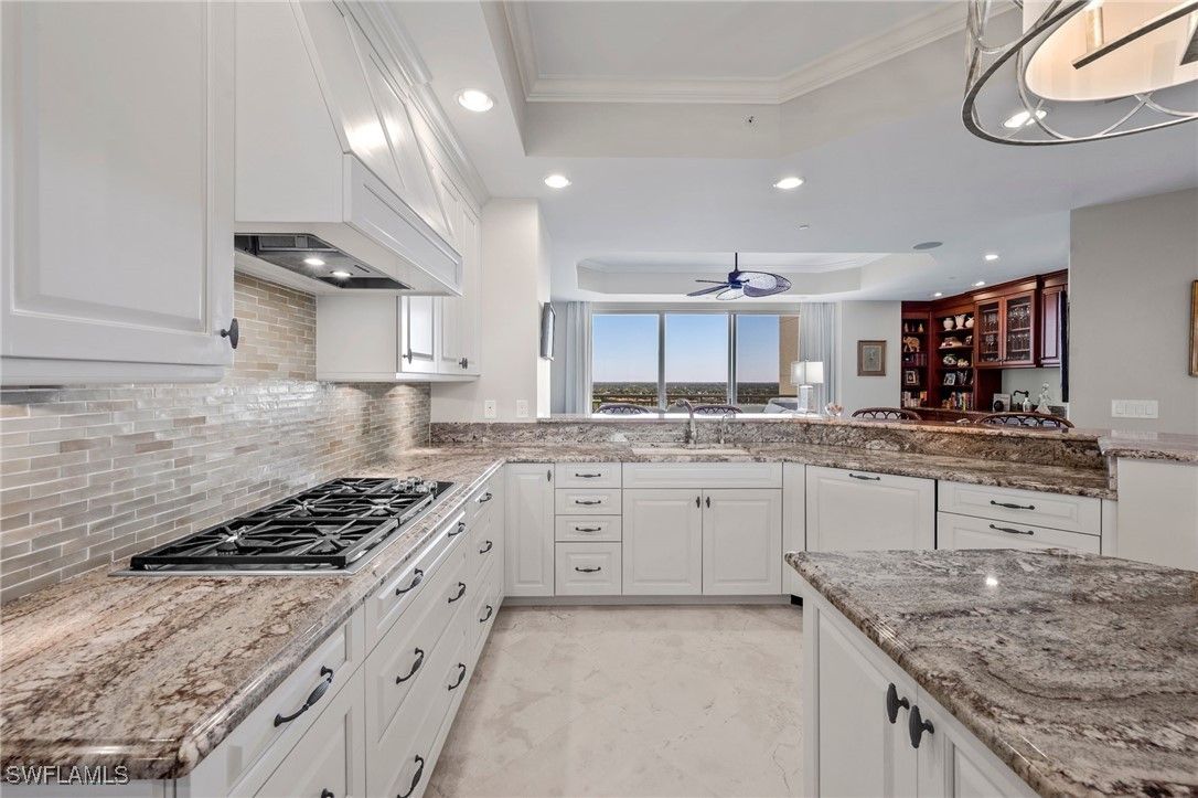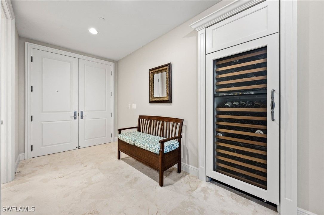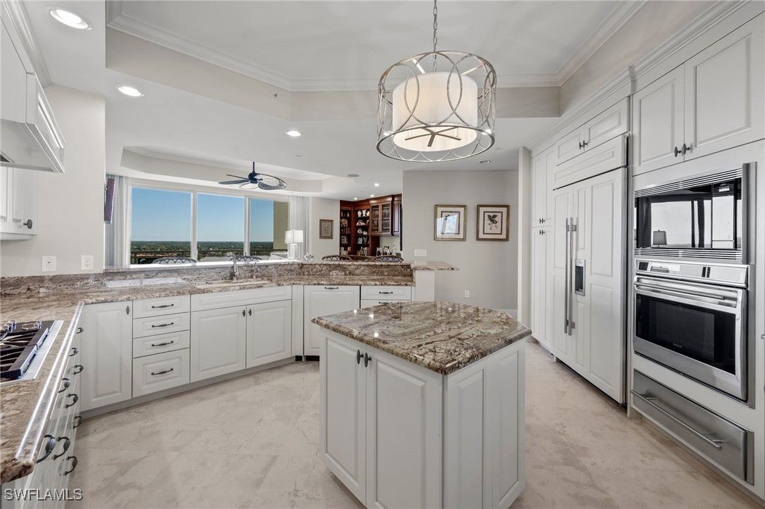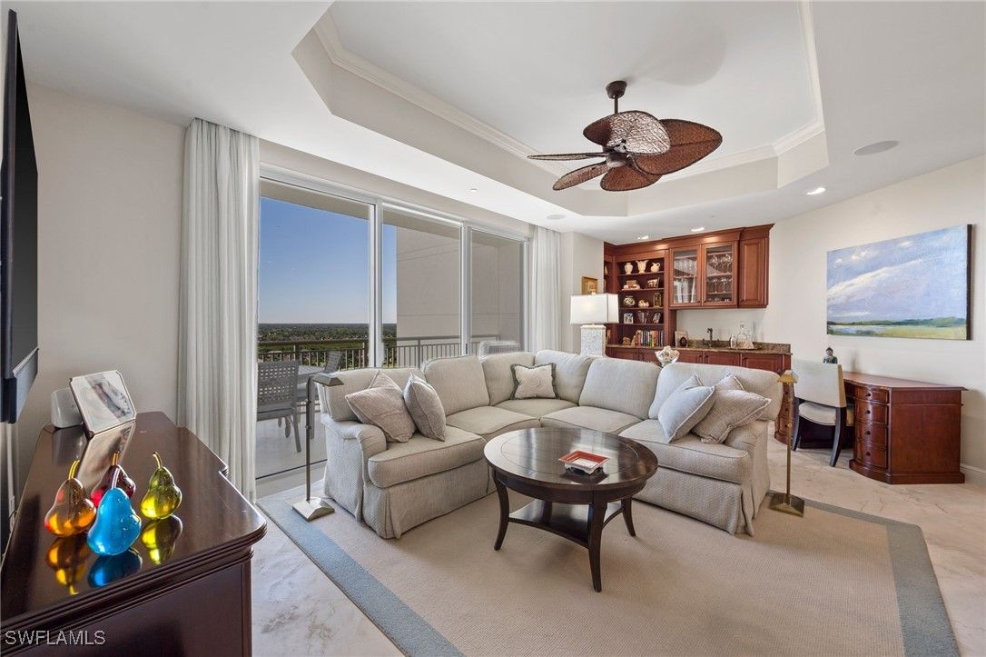 Experience refined high rise living in this beautifully appointed 15th floor residence in Tavira, one of Bonita Bay’s most coveted luxury towers. With sweeping, unobstructed views of the Gulf, Estero Bay, and the lush preserve canopy of the golf course below, this sanctuary offers a daily panorama of sunrises, sunsets, and shimmering water. A private elevator opens to an elegant foyer that leads into a spacious, light-filled great room framed by floor to ceiling glass and electric shades. The home features limestone flooring throughout all the main living areas. The open layout flows effortlessly to an expansive screened terrace—perfect for morning coffee or evening cocktails and grilling out. The gourmet kitchen features premium cabinetry, stone countertops, a large island, top tier appliances including a gas cooktop, warming oven, oversized refrigerator, and a large wine vault creating an ideal space for both everyday living and entertaining. The owner’s suite is a serene retreat with terrace access, dual closets and a spa inspired bath with separate vanities, soaking tub, and oversized shower. Two additional guest suites provide comfort and privacy, while a versatile family room offers space for an office, media room, or quiet escape. Residents of Tavira enjoy resort style amenities, including a rooftop terrace with breathtaking views, a resort pool and spa, state of the art fitness center, steam, sauna and massage rooms, theater, billiards, golf simulator room, guest suites, and an elegant club room for gatherings. Bonita Bay’s award winning community enhances the lifestyle with five championship golf courses, a private beach park, full service marina, pickleball, tennis, miles of walking and biking paths, and a vibrant social scene. A rare opportunity to own a high floor residence in Tavira—where luxury, nature, and coastal serenity come together in perfect harmony.