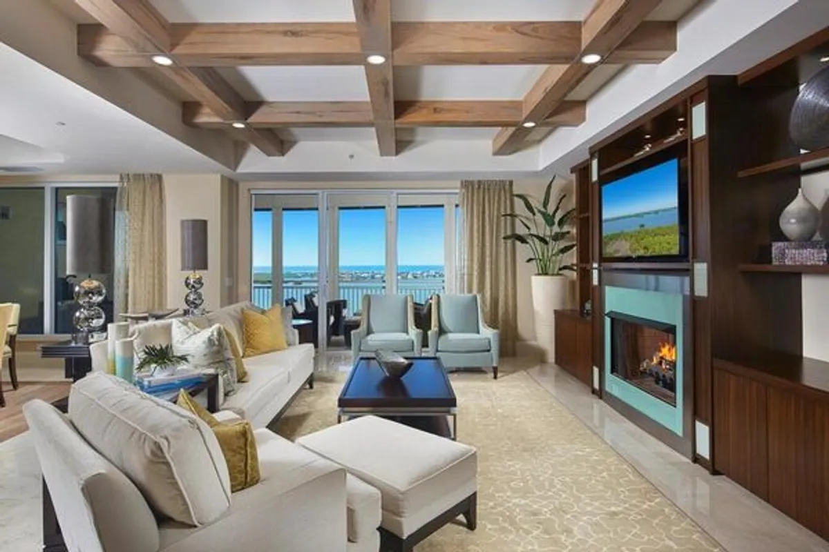 Refined coastal living awaits in this beautifully designed Tavira residence, where the Sun, Sand, and Sea theme is carried throughout with award-winning detail. Beautifully designed—recognized as “Best in Class” and featured in a Florida design magazine for its exceptional coastal elegance and craftsmanship—this home offers elevated style from the moment the private elevator opens directly into a serene foyer framed by custom pillars, muted sea-inspired tones, and soft accents intentionally selected to evoke an effortless “exhale” moment upon entry. The elegant living and dining areas showcase custom cabinetry and ceiling beams, custom draperies, curated artwork, and custom furnishings. Wood floor inlays and LED lighting further enhance the space, while the screened Gulf-side lanai with Brown Jordan furniture provides a peaceful setting for daily sunsets. The chef’s kitchen is outfitted with Wolf appliances, a Sub-Zero refrigerator/freezer (compressor replaced 2025), matte-finish granite countertops, stainless backsplash, a walk-in pantry, Culligan RO system, and a nicely equipped kitchen setup. The family room features bright Golf-side sunrise views and includes custom drapery, custom blinds, and a six-speed Casablanca fan. The expanded bar area is ideal for entertaining, offering custom cabinetry, a Sub-Zero dual-zone wine cooler, Sub-Zero refrigerator drawers, U-Line ice maker, granite counters, and shimmering backsplash accents. The primary suite offers extraordinary Bay and Gulf views—including a rare Gulf view from the bathroom found only in the coveted “03” stack. Features include Restoration Hardware furniture, a walk-in closet with custom built-ins, and an upgraded ensuite bath with his and her vanities, whirlpool tub, walk-in shower, and private lanai. Bedroom 2 serves as a second primary suite with Golf-side sunrise views, custom bedding and drapery, a large walk-in closet, and a private bath with dual sinks and a walk-in shower. Bedroom 3 (or office) offers vibrant coastal décor, custom drapery, and lanai access. Additional features include a third full bath with floor-to-ceiling glass-weave wall, custom cabinetry with vessel sink, walk-in shower, a laundry room with Whirlpool appliances and utility sink, two HVAC systems with dual-zone configuration, a Culligan soft-water system, and wood flooring throughout the main corridor. This residence blends exceptional craftsmanship, magazine-featured design, coastal elegance, and panoramic views—delivering a luxurious lifestyle in Tavira, one of Bonita Bay’s premier high-rise communities.