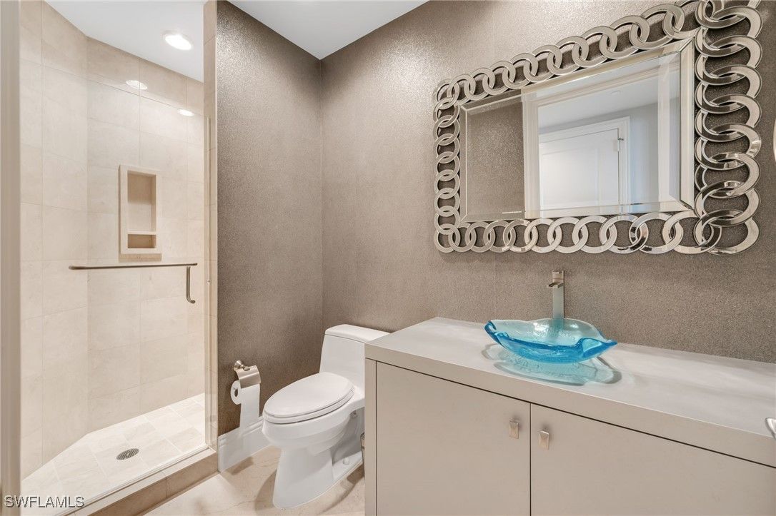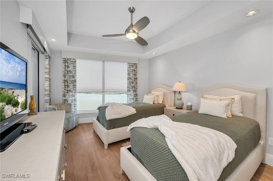 Price reduced. Oversized 2 car private garage. Like new furnishings included. There is nothing like these stunning sunset views over the bay and the Gulf of Mexico from the 22nd floor in Tavira, the sophisticated high-rise in Bonita Bay. This beautifully updated three-bedroom, three-bath home has been professionally decorated by a high-end designer and meticulously maintained. With more than 4,400 total square feet, including a large screened lanai and open balcony, this luxury condominium lives like a single-family home. Expansive living spaces are ideal for both everyday comfort and elegant entertaining, all framed by breathtaking water views. Exit the elevator to enter the residence through your own private entry foyer. One of the reasons this floor plan is so sought after is that it provides incredible sunrise views and sunset views from the kitchen and main living areas. At the heart of the home, the gourmet island kitchen enjoys both sunrise and sunset vistas and features Wolf and Sub-Zero appliances, abundant counter space, a walk-in pantry, and bar seating. The kitchen opens seamlessly to the living, dining, and family rooms, creating a welcoming open-concept layout. Remarkable fireplace in the living room adds to the ambiance. A custom bar with a full-size wine cooler enhances the living area, while the oversized screened lanai—spanning more than thirty feet—provides a front-row seat to mesmerizing bay and Gulf views. The primary suite is a true retreat, featuring an additional sitting area ideal for a home office or casual TV viewing, two exceptionally large walk-in closets, and a luxurious bath with dual vanities, a soaking tub, and a separate shower. Two guest bedrooms and two additional full baths provide comfort and flexibility for family and visitors. Tavira also offers guest suites available to reserve for overflow guests. Highly regarded Tavira offers an impressive collection of resort-style amenities, including a resort pool and cabana, fitness center, movie theater, golf simulator, social and meeting rooms, and outstanding on-site management. All of this is set within gated Bonita Bay, featuring a private Gulf-front beach, 12 miles of walking and biking trails, a full-service 400-slip marina, and an award-winning golf and lifestyle club with five championship golf courses, 16 tennis courts, 15 pickleball courts, and a 29,000-square-foot fitness center and spa. And don't drive to the beach, Bonita Bay provides a shuttle from your neighborhood to the brand new beach house on the Gulf. Now at a reduced price, this is an excellent value for a high floor residence in all of Southwest Florida.