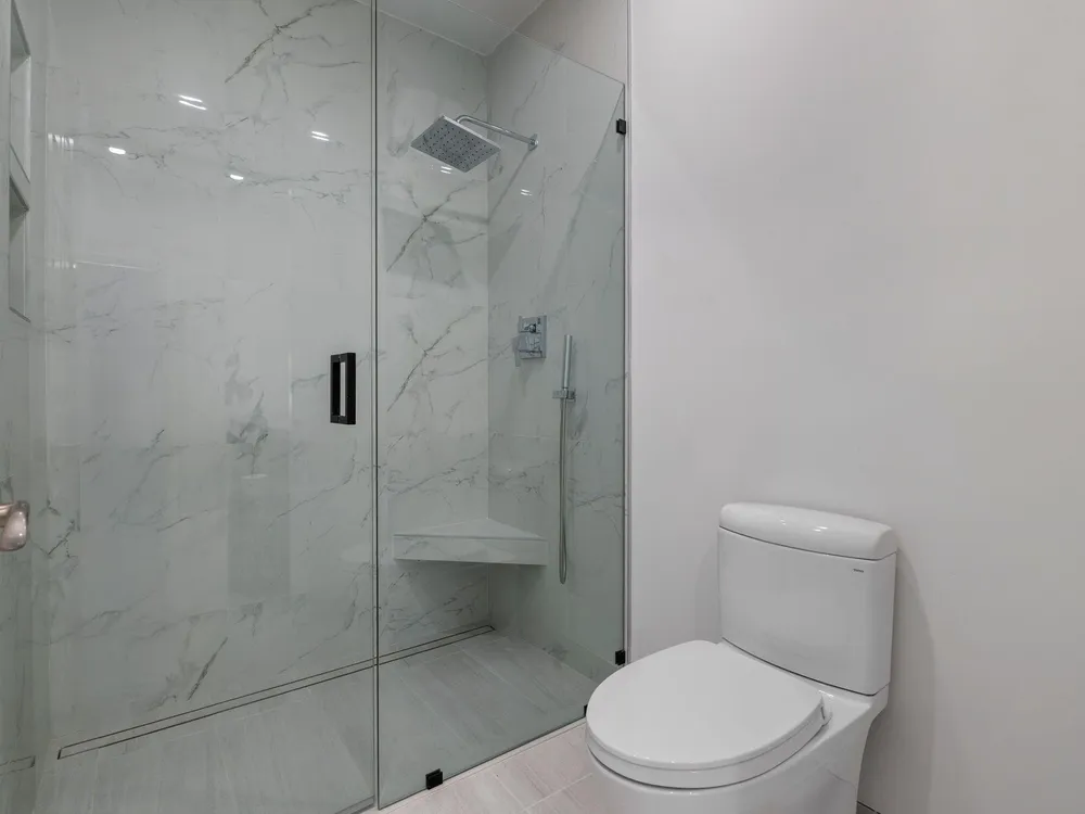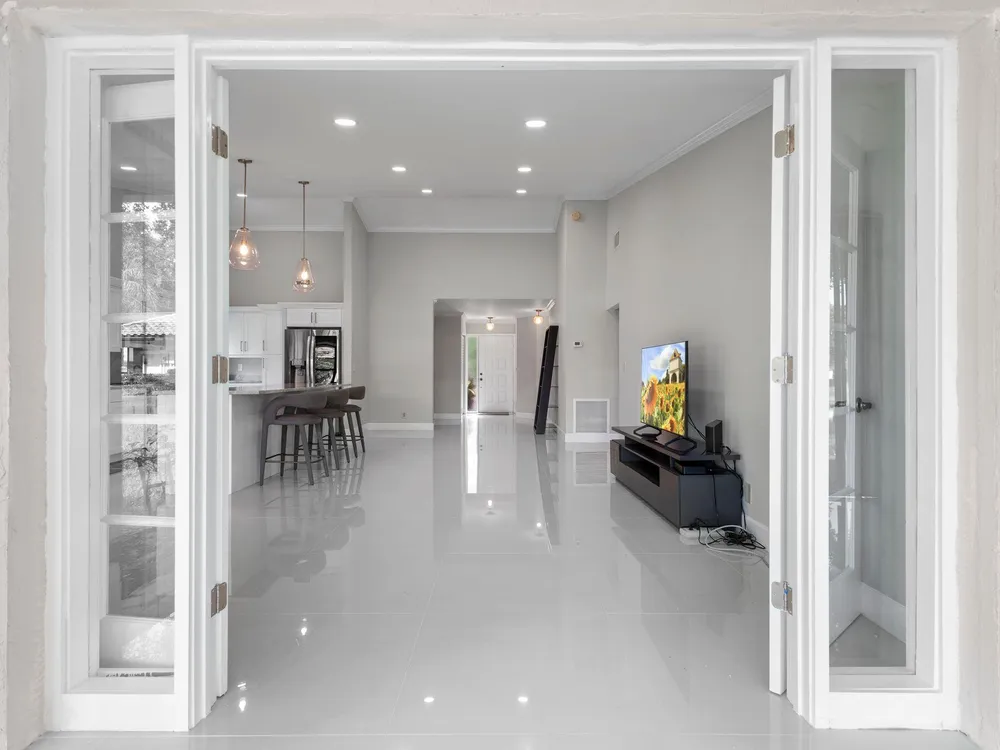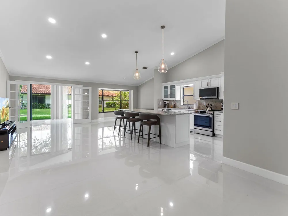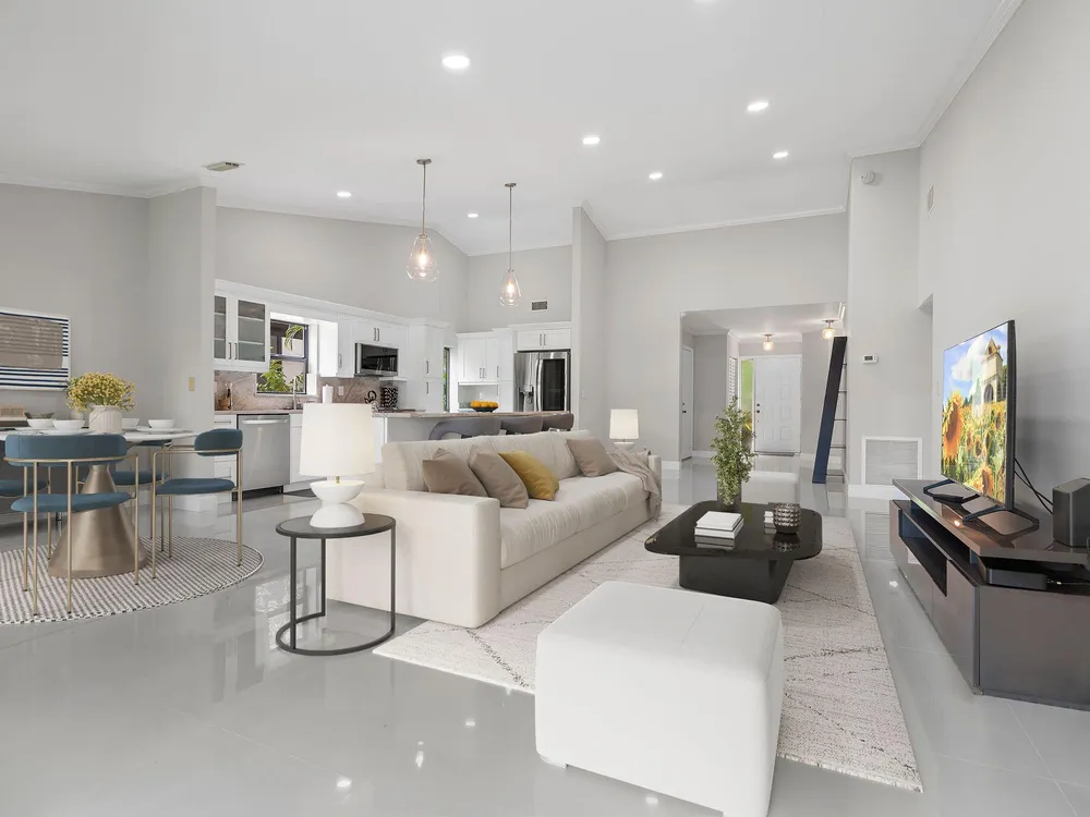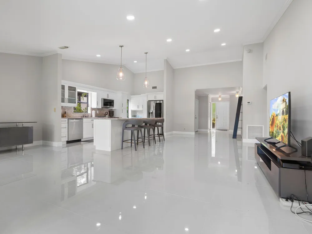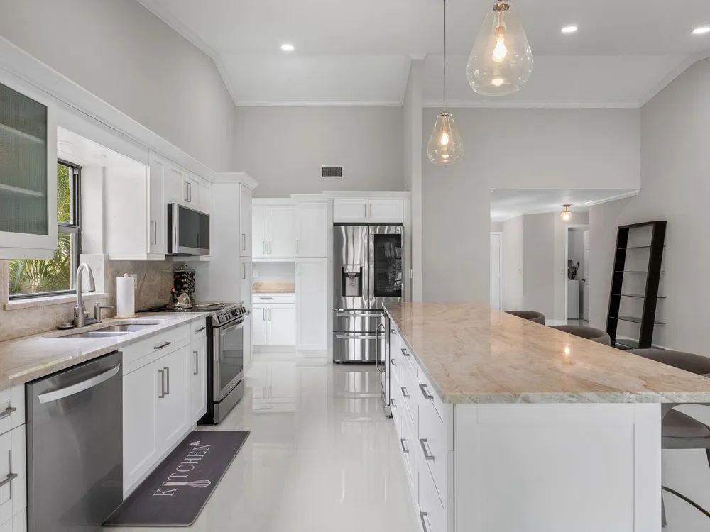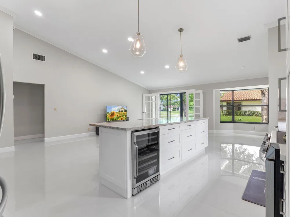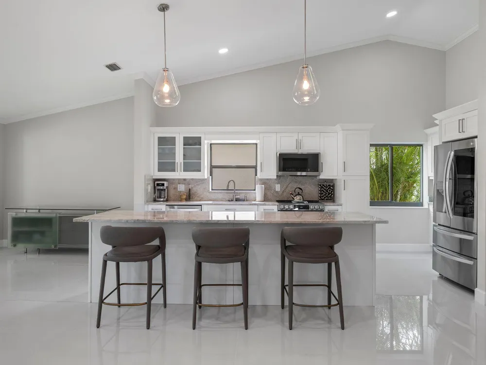 Upon entering this exceptional home, one is immediately impressed by an HGTV-inspired renovation that incorporates numerous modern conveniences and aesthetic enhancements. The open concept living space boasts a stunning kitchen island with pendant lighting, white shaker cabinets offering ample storage, and exquisite quartz countertops and backsplash. The kitchen is equipped with new LG Thin Q smart appliances featuring touch screen technology operable via smartphone, as well as a wine fridge and a motion sensor-operated kitchen faucet. The main areas are adorned with large format white porcelain tiles, while both spacious bedrooms are carpeted.