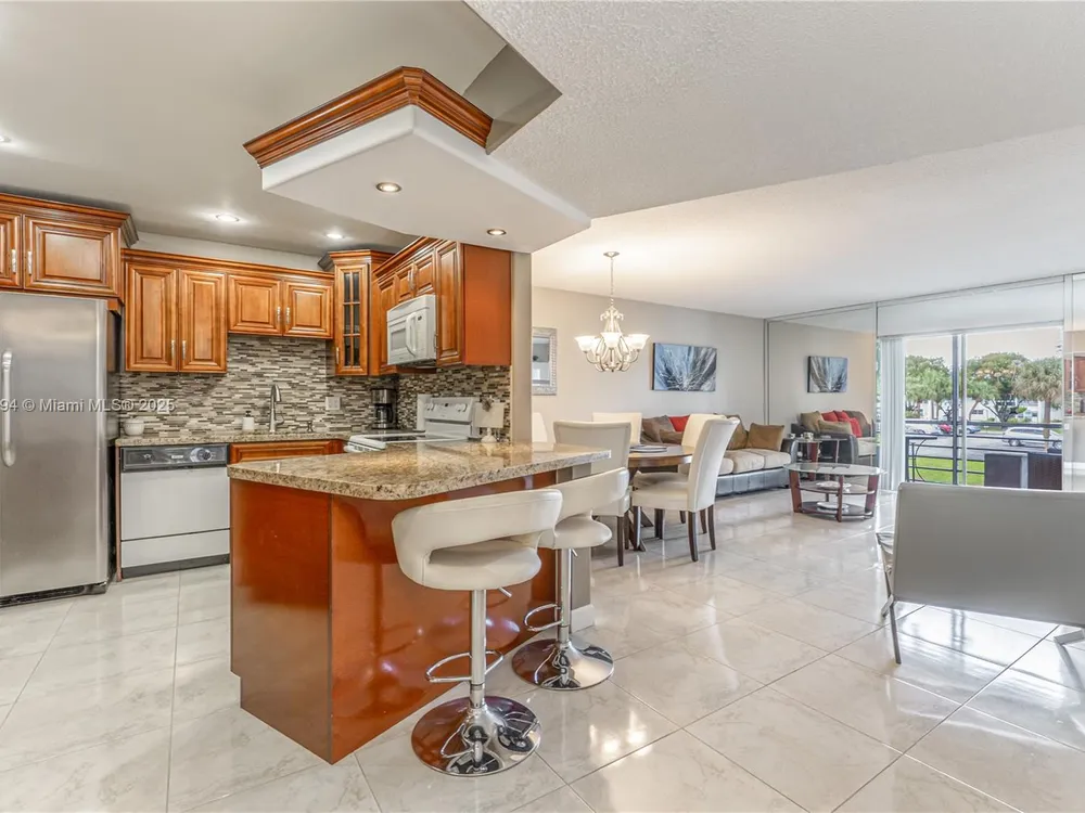 Welcome Home! This beautifully remodeled 1 bedroom 1.5 bathroom condo, featuring seamless tile flooring throughout and a bright, open-concept design is being sold fully furnished, and is truly turn-key, ready for you to enjoy from day 1. The kitchen has real wood cabinetry, granite countertops, stainless steel appliances, recessed lighting, and a sit-at counter that opens to the main living space. Meticulously maintained and gently used, this condo offers a tranquil screened-in balcony with relaxing lake views, providing the perfect space to unwind. Located in a quiet 55+ community with multiple pools, clubhouse, small fitness center, sauna, billiard room, library, and more this is a rare opportunity to own a move-in-ready, stylish retreat. Don't miss out—schedule your showing today!