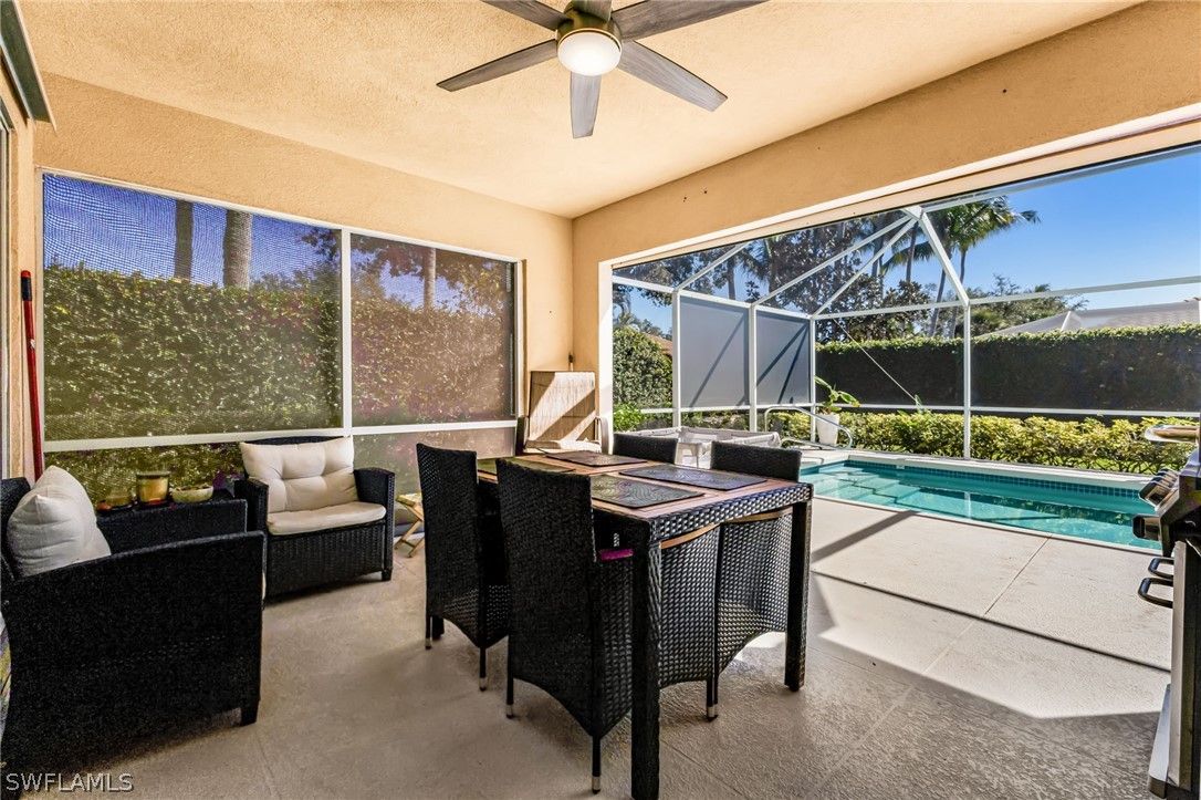 Secure this poured-concrete DiVosta "Capri" villa, a model distinguished by its structural resilience and insurance desirability. The residence showcases a seamless, low-maintenance interior anchored by high-gloss, large-format tile flooring that amplifies natural light throughout the open-concept Great Room. The kitchen is optimized for modern living with crisp white cabinetry, stainless steel appliances, and a functional breakfast bar, while the dedicated laundry room adds significant value with a premium Samsung washer/dryer suite, utility sink, and ample storage. Step outside to the expansive screened lanai, where a covered dining area with a ceiling fan transitions to your private saltwater pool—a health-conscious upgrade requiring less chemical maintenance. Framed by a stucco privacy wall and lush hedging, the Southeast-facing pool deck offers total seclusion and optimal sun exposure without the harsh late-day heat. Complete with a newer water heater, central vacuum, and an attached 2-car garage, this asset is mechanically sound and ready for immediate occupancy. Secure your position in Island Walk, a master-planned community that serves as the benchmark for North Naples resort-style efficiency and low-fee value. The newly renovated Town Center is the operational heartbeat of the neighborhood, anchoring a suite of amenities that rivals exclusive country clubs without the exorbitant buy-in. Residents enjoy exclusive access to a state-of-the-art fitness center, a resort-style pool plus a dedicated lap pool, and a comprehensive sports complex featuring Har-Tru tennis courts, pickleball, bocce, and a putting green. Unique to this development is its hyper-convenient infrastructure, including an on-site gas station, car wash, post office, hair and nail salon, and a full-service restaurant, allowing you to handle daily logistics without leaving the gates. With miles of scenic walking bridges and biking paths interlaced with canals, the community offers an active, connected lifestyle. Best of all, reasonable HOA fees cover lawn maintenance, irrigation, and high-speed internet/HDTV, ensuring your carrying costs remain as attractive as the location itself.