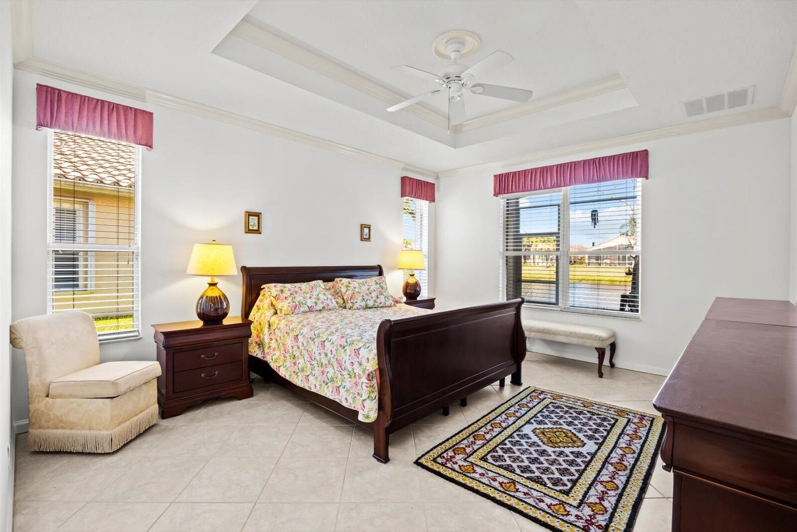 Highly popular lakefront Cabernet Model 3/2 plus den located in the heart of St Lucie West Cascades Community. This well-appointed home highlights crown molding, gorgeous privacy textured glass double door entry, volume ceilings and tile throughout. Feel at ease with a full house generator, accordion shutters and security system. The eat-in kitchen features SS appliances, granite countertops, large pantry, 42'' upper cabinets, and separate formal dining with tray ceiling. Primary bedroom and bath include tray ceiling, his and her custom closets, double separate vanities, roman tub and walk in shower. Guest bedrooms both include custom closets as well. The inside laundry room offers upper cabinets for your storage needs with a wash tub basin located in the garage. Then delight in your lakefront views from your charming, screened patio. Cascades offers a spectacular 26,000 sq ft clubhouse full of amenities for an active 55+ lifestyle. Indulge in the resort pool. Make the most out of the fitness center, billiards room, card room, library, pickleball, bocce, shuffleboard, craft center, media room, 9-hole golf and all the monthly activities this community has available to enjoy. Come experience the vibrant way of living that the Cascades community has to offer.