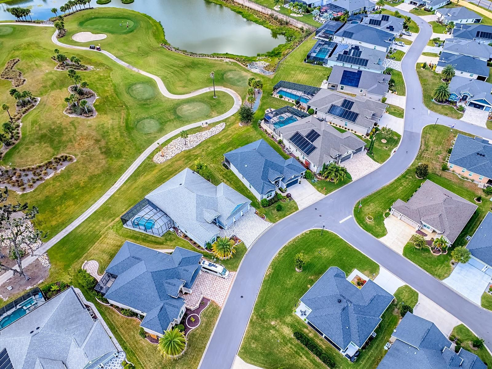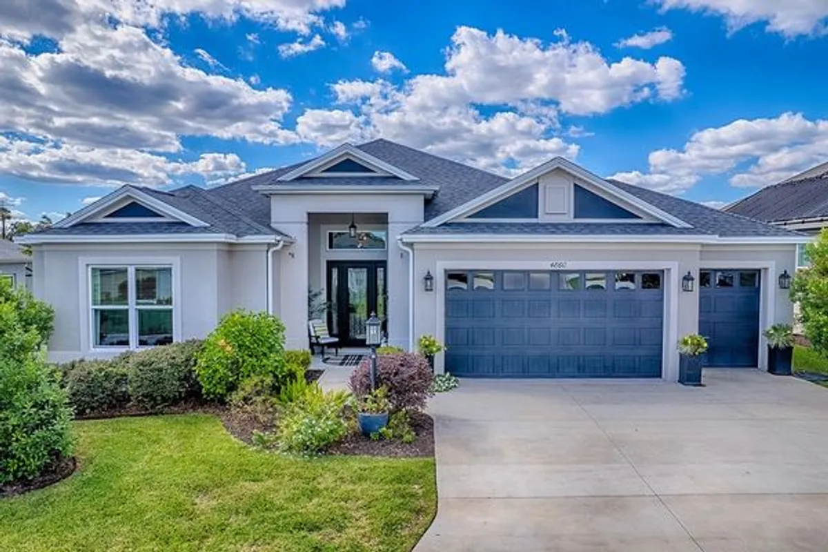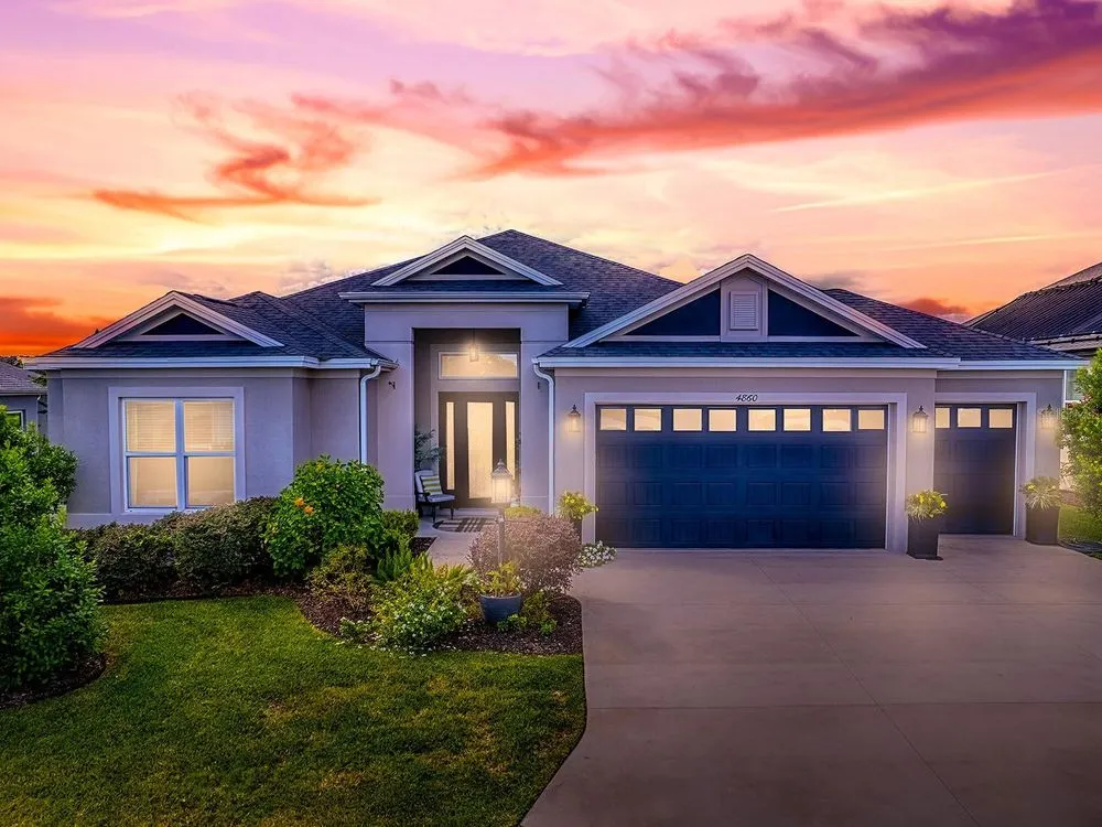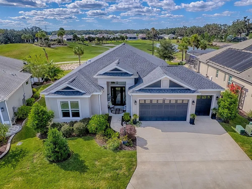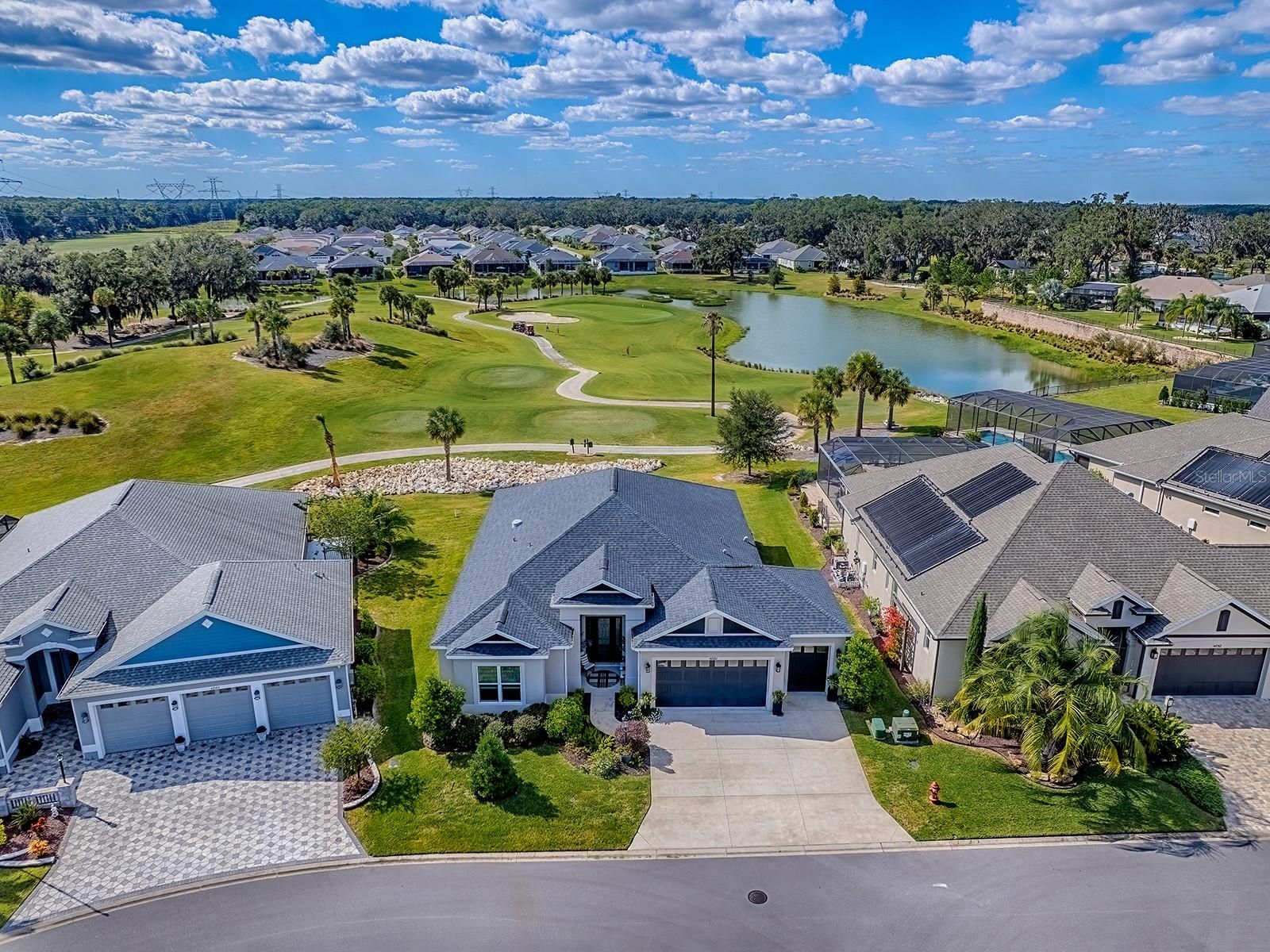 SPECTACULAR GOLF COURSE and WATER VIEW on this CUSTOM “10” HOME COMPARABLE to the EGRET PREMIER plan offering 10 ft. CEILINGS and 8 ft DOORS throughout! Located in the popular enclave known as “Little DeLuna” surrounded with beautiful premier and designer homes and positioned on hole 4 of the Lowlands Executive Golf Course with plenty of room for a POOL! This LOVELY home has so much to offer from the STUNNING LEADED GLASS front door with sidelites to the 12 x 46 lanai encompassing the entire width of the home accessible through STACKABLE SLIDING GLASS DOORS! WOOD LOOK PORCELAIN TILE flooring runs throughout the home. The amazing kitchen has mossy gray cabinetry, a unique but very neutral color, enhanced with an impressive matte black and champagne bronze hardware. Other kitchen features include custom windows offering more natural lighting, HERRINGBONE-GLAZED tile backsplash, WATERFALL GRANITE island, GAS COOKTOP with vent hood, and DOUBLE OVENS. Impeccable features throughout includes custom ARCHITECTURAL walls, exceptional enhanced lighting, remote controlled blinds, granite in both baths, solar tube, and the list goes on. The spacious 745 sf garage with golf cart garage has a ceiling fan, epoxy flooring, and plenty of room for all your needs! Located minutes away from Hogeye Preserve walking path, Water Lily Recreation Center, Everglades Recreation Center, Magnolia Plaza, Ednas on the Green, Brownwood Square, Sawgrass and Eastport! This truly is a great location! THIS IS AN AMAZING HOME WITH ONE OF THE BESTS VIEWS YOU’LL FIND IN THE VILLAGES!