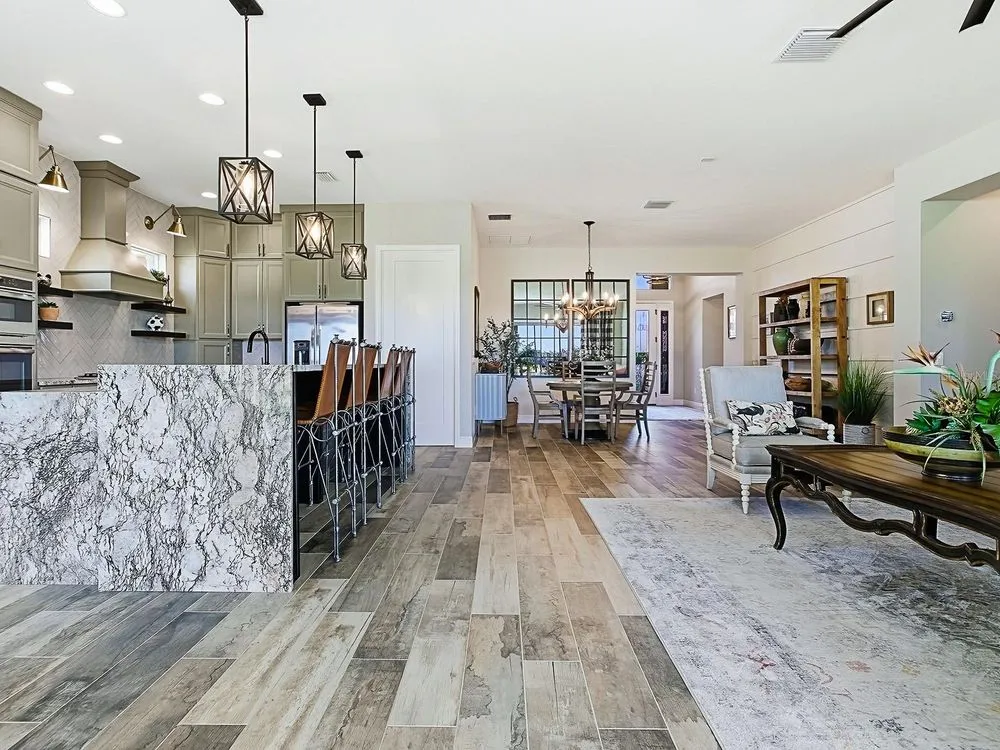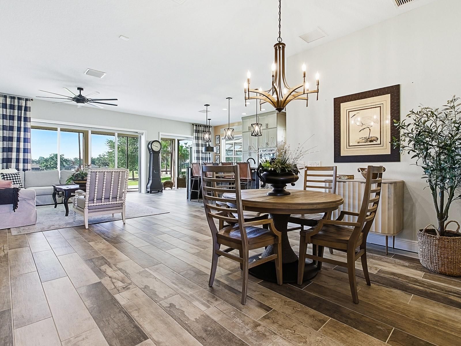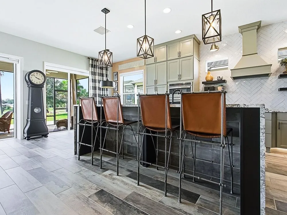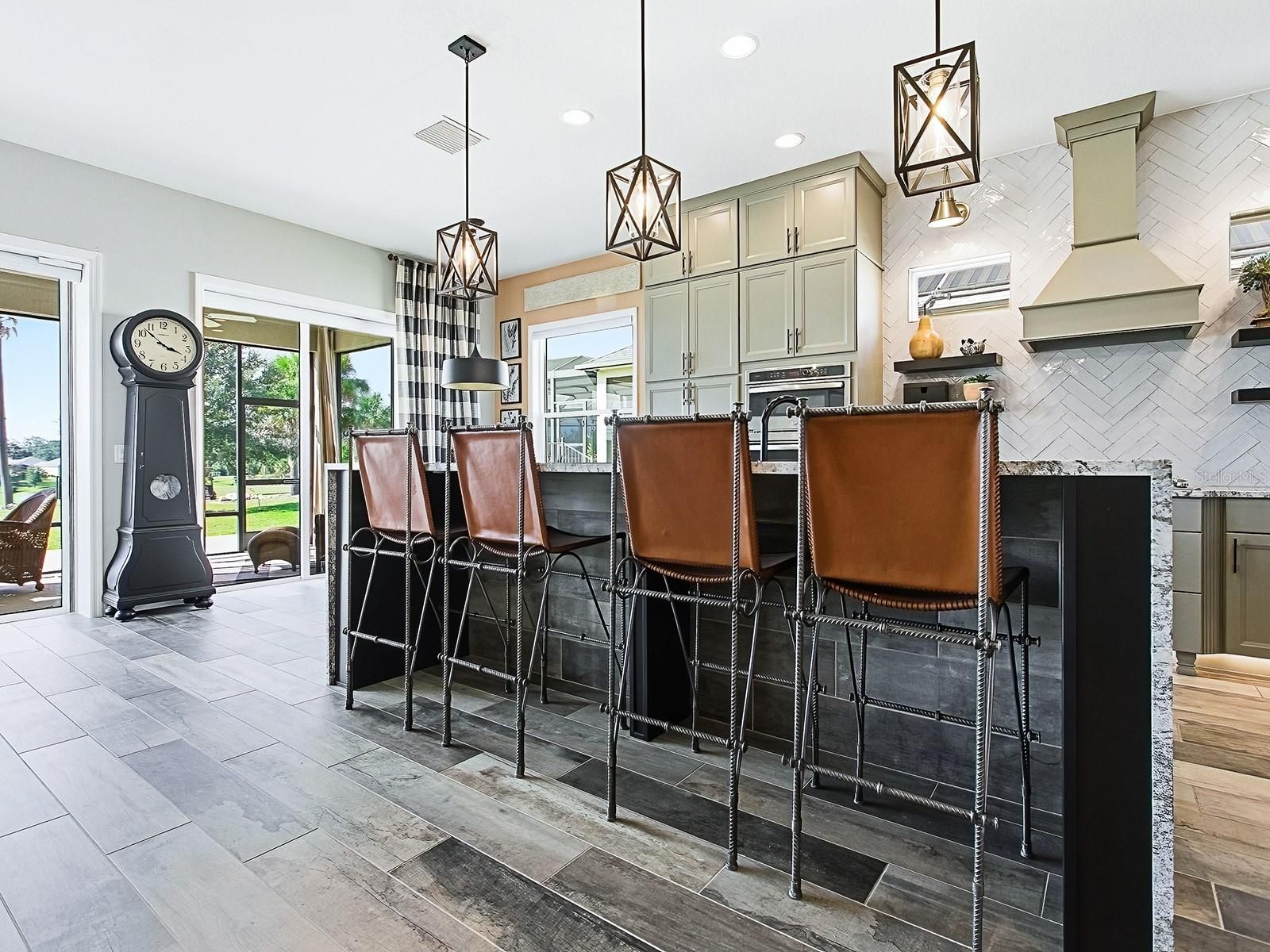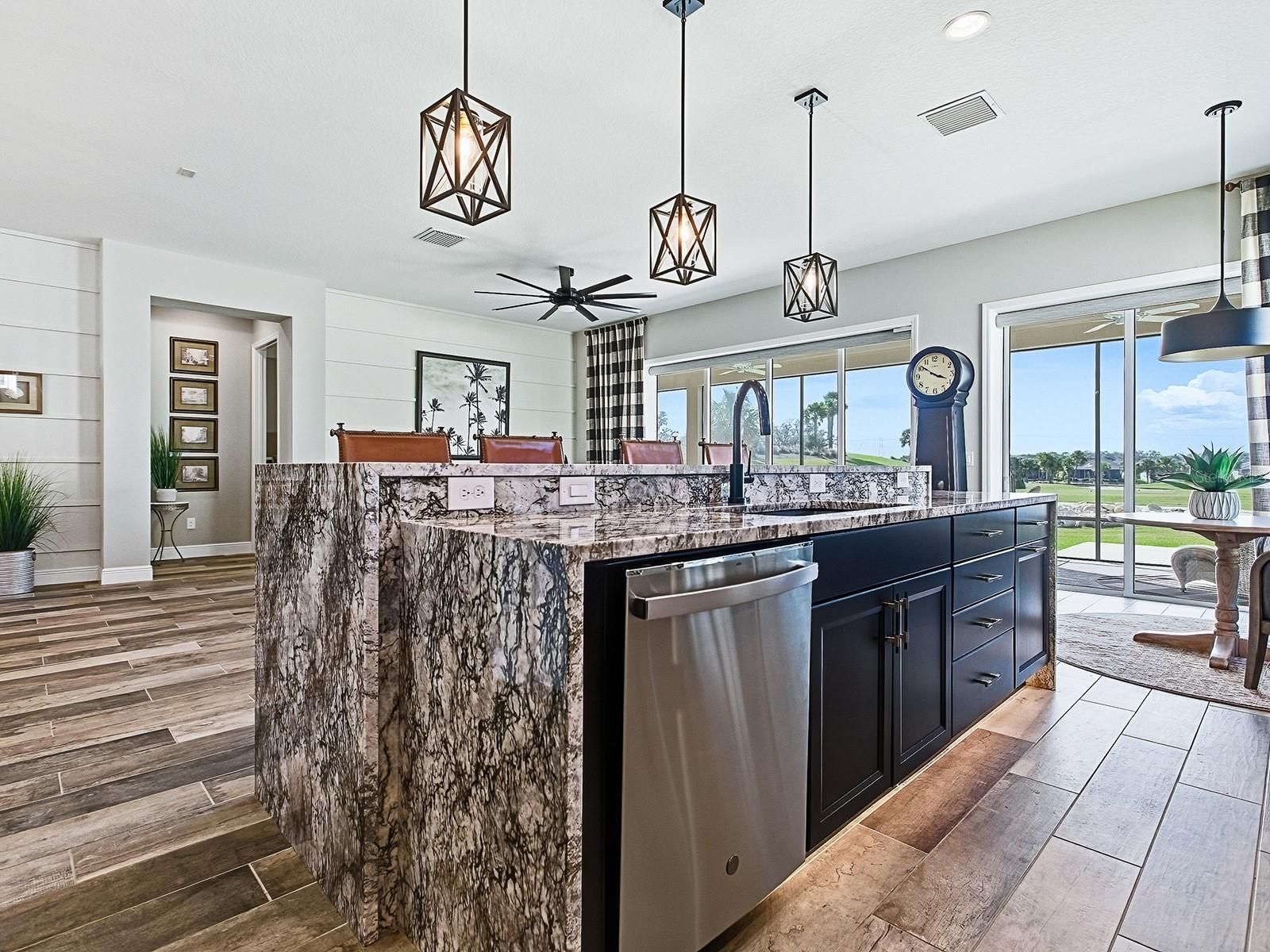 SPECTACULAR GOLF COURSE and WATER VIEW on this CUSTOM “10” HOME COMPARABLE to the EGRET PREMIER plan offering 10 ft. CEILINGS and 8 ft DOORS throughout! Located in the popular enclave known as “Little DeLuna” surrounded with beautiful premier and designer homes and positioned on hole 4 of the Lowlands Executive Golf Course with plenty of room for a POOL! This LOVELY home has so much to offer from the STUNNING LEADED GLASS front door with sidelites to the 12 x 46 lanai encompassing the entire width of the home accessible through STACKABLE SLIDING GLASS DOORS! WOOD LOOK PORCELAIN TILE flooring runs throughout the home. The amazing kitchen has mossy gray cabinetry, a unique but very neutral color, enhanced with an impressive matte black and champagne bronze hardware. Other kitchen features include custom windows offering more natural lighting, HERRINGBONE-GLAZED tile backsplash, WATERFALL GRANITE island, GAS COOKTOP with vent hood, and DOUBLE OVENS. Impeccable features throughout includes custom ARCHITECTURAL walls, exceptional enhanced lighting, remote controlled blinds, granite in both baths, solar tube, and the list goes on. The spacious 745 sf garage with golf cart garage has a ceiling fan, epoxy flooring, and plenty of room for all your needs! Located minutes away from Hogeye Preserve walking path, Water Lily Recreation Center, Everglades Recreation Center, Magnolia Plaza, Ednas on the Green, Brownwood Square, Sawgrass and Eastport! This truly is a great location! THIS IS AN AMAZING HOME WITH ONE OF THE BESTS VIEWS YOU’LL FIND IN THE VILLAGES!