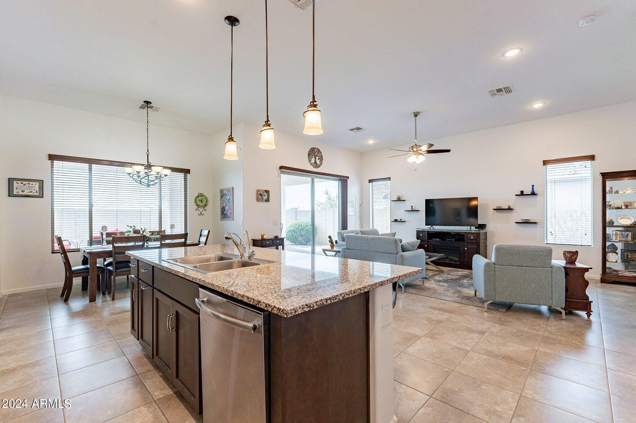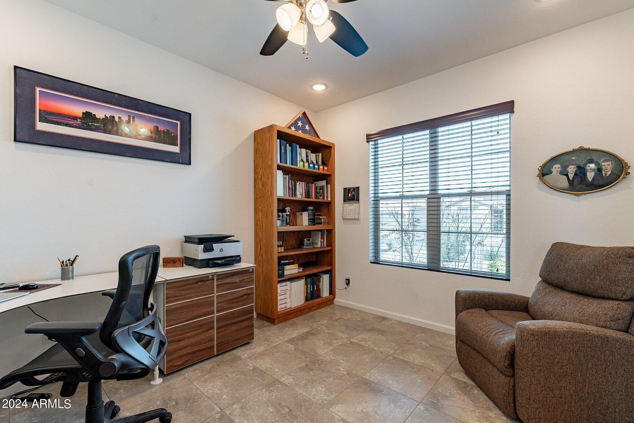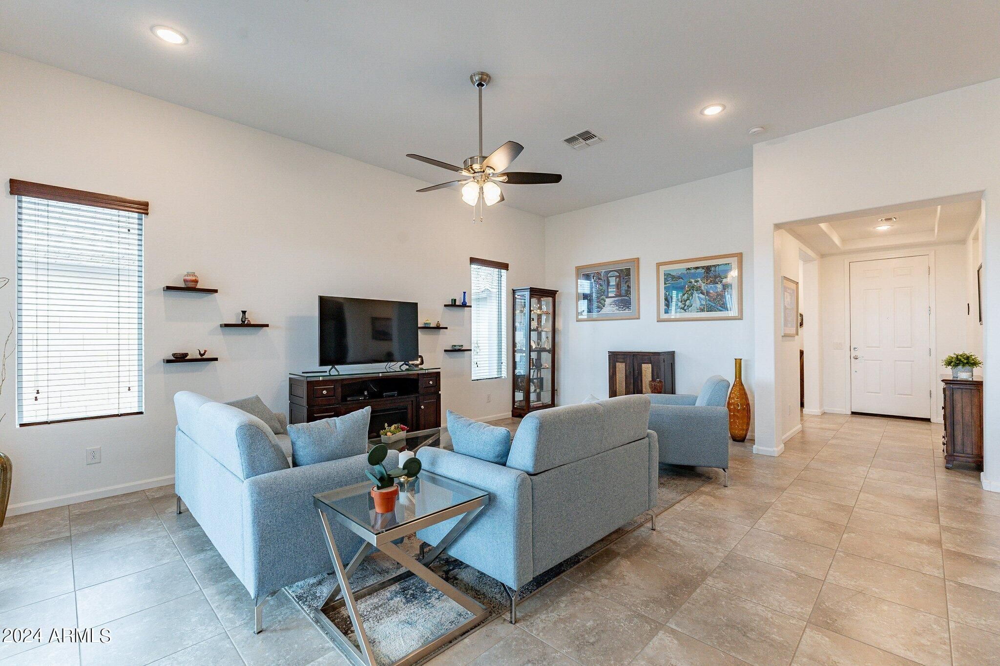 Welcome Home to this very popular and sought after Mandera model in Robson Ranch! This partially furnished 2-bed, 2.5-bath home with a den/office spans 1884 sq ft with 18'' tile flooring throughout. Enjoy the airy feel with 11' ceilings in the main living areas and 10' ceilings in the master bedroom. The kitchen is a chef's dream, the dining area includes a built in China hutch and the master suite offers a luxurious retreat. Enjoy the warm Arizona sun in your private backyard oasis, which includes a covered paver patio with a ceiling fan, Pre-wired for a patio TV and Pre-wired electrical for a Hot Tub. Robson Ranch's Gated Community amenities, include an 18 hole championship golf course, pickleball courts, clubhouse, restaurant, heated pool, indoor lap pool, fitness center and more add