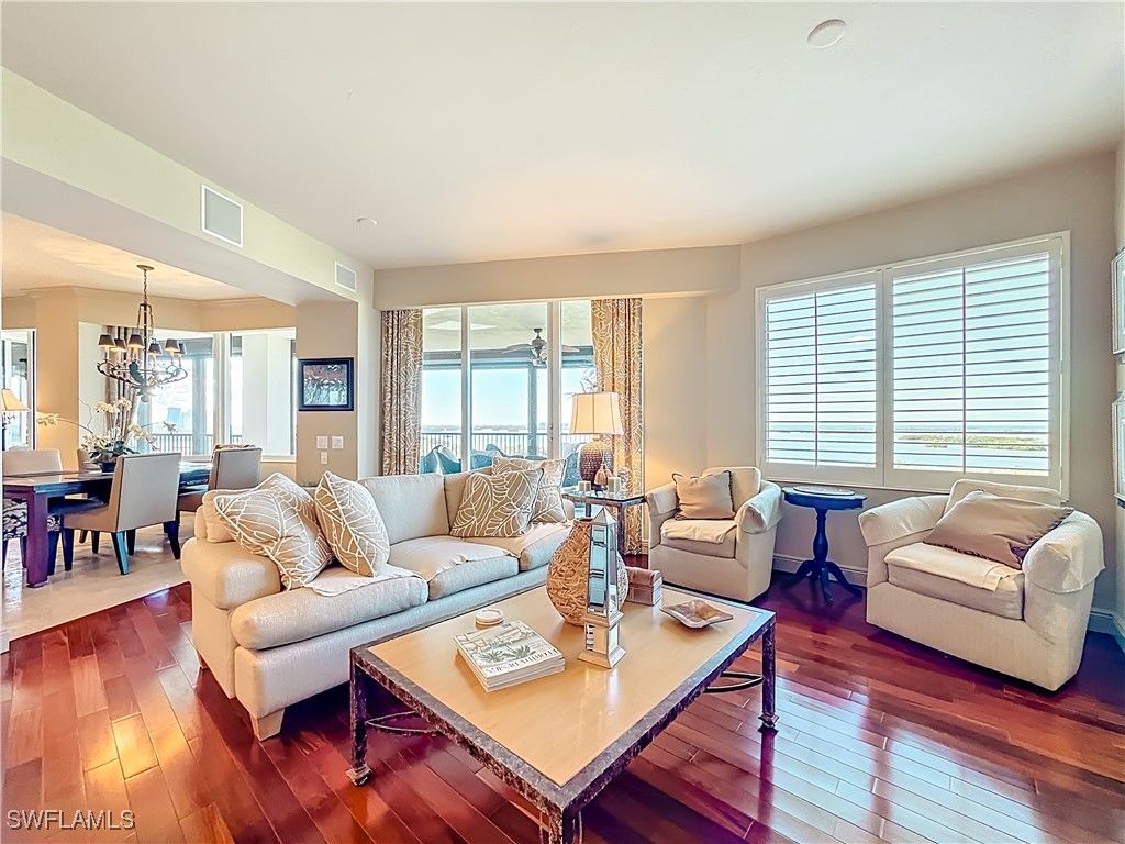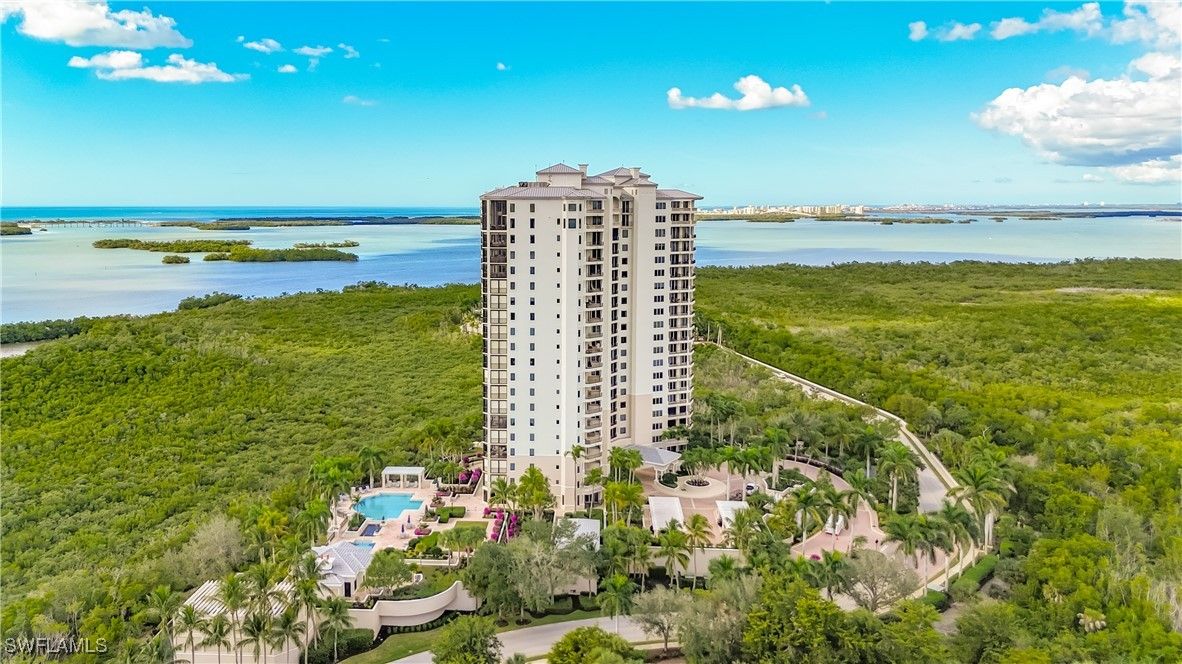 Spectacular panoramic views of the Gulf and Bay await you from this 10th floor professionally designed residence in the highly desirable Palermo at Pelican Colony. The balcony is very spacious and includes electric hurricane shutters. There are beautiful travertine and Brazilian cherry hardwood floors in the main living areas. This unit also includes a rarely available oversized private two-car garage conveniently located directly outside of the garage lobby. Private elevator entry from the unit. Large laundry room with storage cabinets. Great floor plan with 3 bedrooms and 3 full baths. This property is offered as turnkey furnished and is move-in ready! Palermo features a resort-style pool with spa, fitness center, recently renovated social pavilion with full kitchen, two guest suites and a theater. The building is immaculately maintained and recent improvements include a new roof, new exterior paint and remodeled elevator lobbies. Your private membership at Pelican Colony includes access to the Bay Club where you can enjoy both casual and formal waterfront dining on two levels as well as many social events. Another featured amenity is boat shuttle access across the bay to the pristine 34-acre beach park. The community also offers many other activities including a Kayak and canoe park, pickleball, tennis, bocce, a fitness center and so much more. The Colony Golf Club also has optional golf and sports memberships available. Palermo is in a great location just 1.5 miles from Coconut Point Mall and close to many excellent dining, shopping and entertainment options.