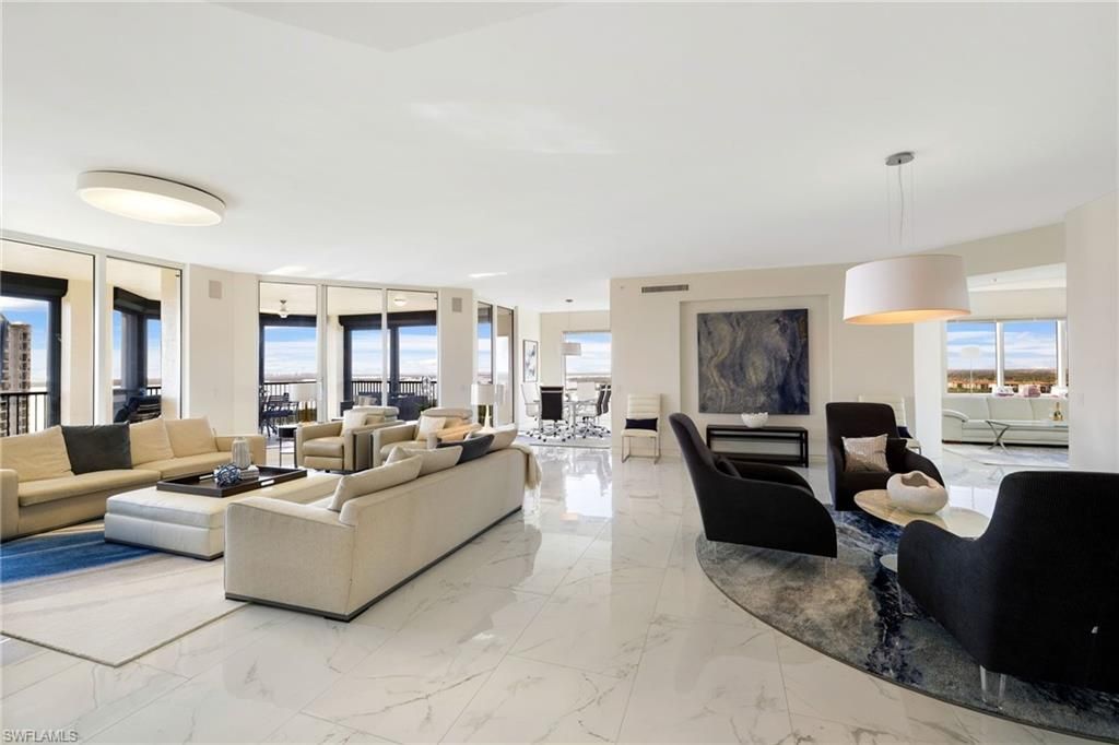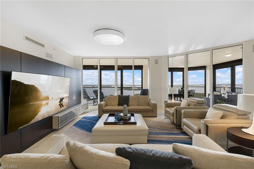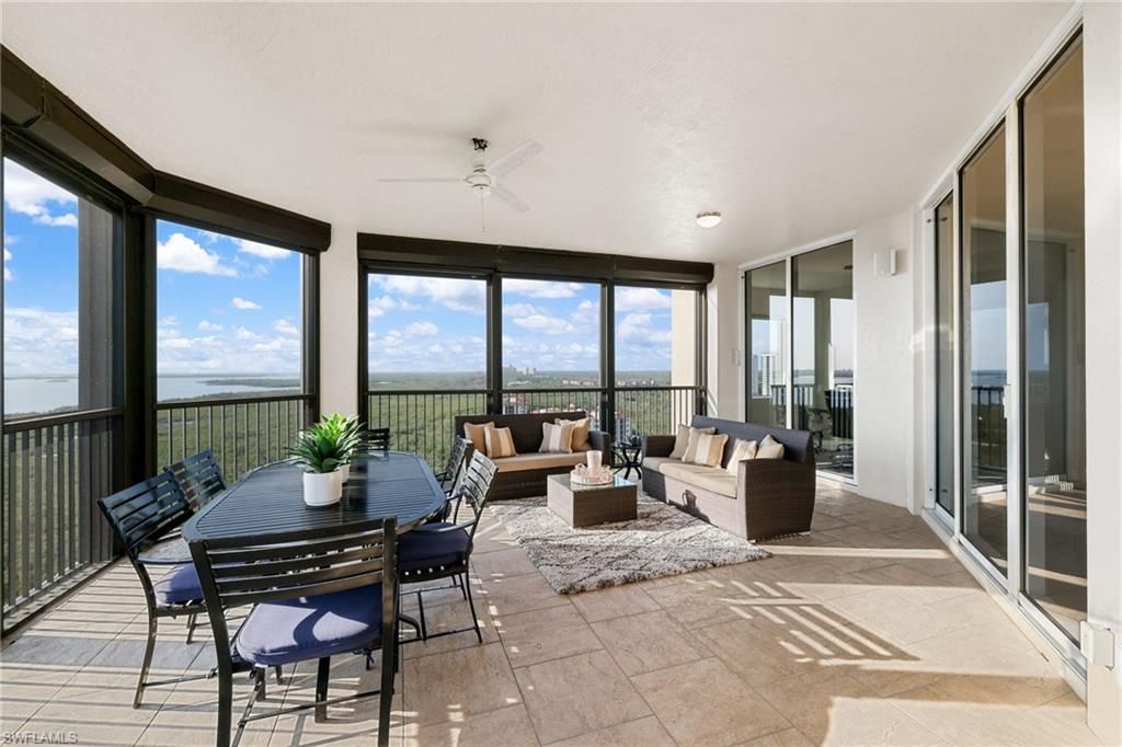High above the natural beauty of Southwest Florida, this stunning sky residence on the 17th floor of The Colony at Pelican Landing offers breathtaking panoramic views of Estero Bay, the sparkling Gulf of Mexico, and the surrounding protected nature preserves. This beautifully appointed three bedroom, three and a half bathroom home welcomes you through a private elevator entry into expansive living spaces filled with natural light and framed by walls of glass that showcase the remarkable scenery from nearly every room.The open floor plan is designed for both comfort and entertaining, featuring a spacious great room, an elegant dining area, and a gourmet kitchen thoughtfully equipped with premium appliances, granite countertops, custom cabinetry, a generous breakfast bar, and a full size wine refrigerator that is perfect for storing and serving your collection.The primary suite offers a peaceful retreat with floor to ceiling windows, direct balcony access, and a luxurious ensuite bath with dual vanities, a soaking tub, and a walk in shower. Two additional guest suites provide privacy and comfort for visiting family and friends, each with its own ensuite bathroom.Step outside to the expansive screened terrace, an ideal setting to enjoy morning coffee as the sun rises or relax in the evening with sweeping water and sky views. Additional features include a separate den that works beautifully as a home office or reading space, a powder room, and a dedicated laundry room.Residents of The Colony enjoy an exceptional collection of amenities including a private beach park, tennis and pickleball courts, a fitness center and spa, resort style pool, kayak park, and full service concierge services. The private The Bay Club at The Colony offers waterfront dining exclusively for residents, where beautiful views complement an elegant dining experience. Golf enthusiasts also have the opportunity to join The Colony Golf & Country Club.Ideally located just minutes from shopping, dining, and entertainment at Coconut Point, this residence offers an exceptional opportunity to enjoy refined high rise coastal living surrounded by breathtaking natural beauty.