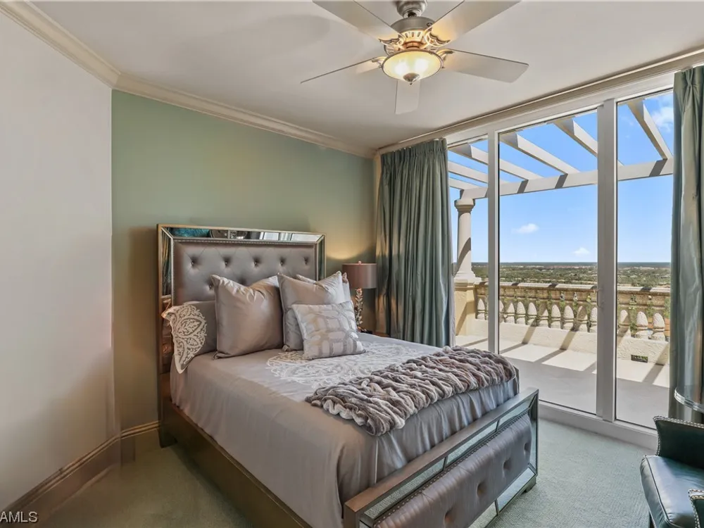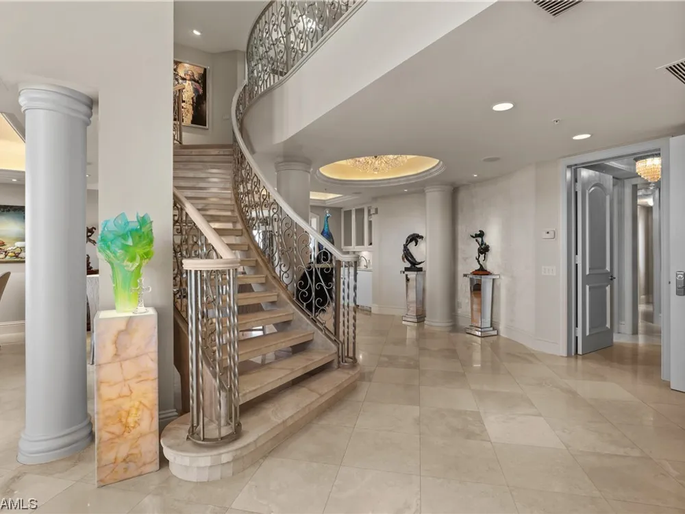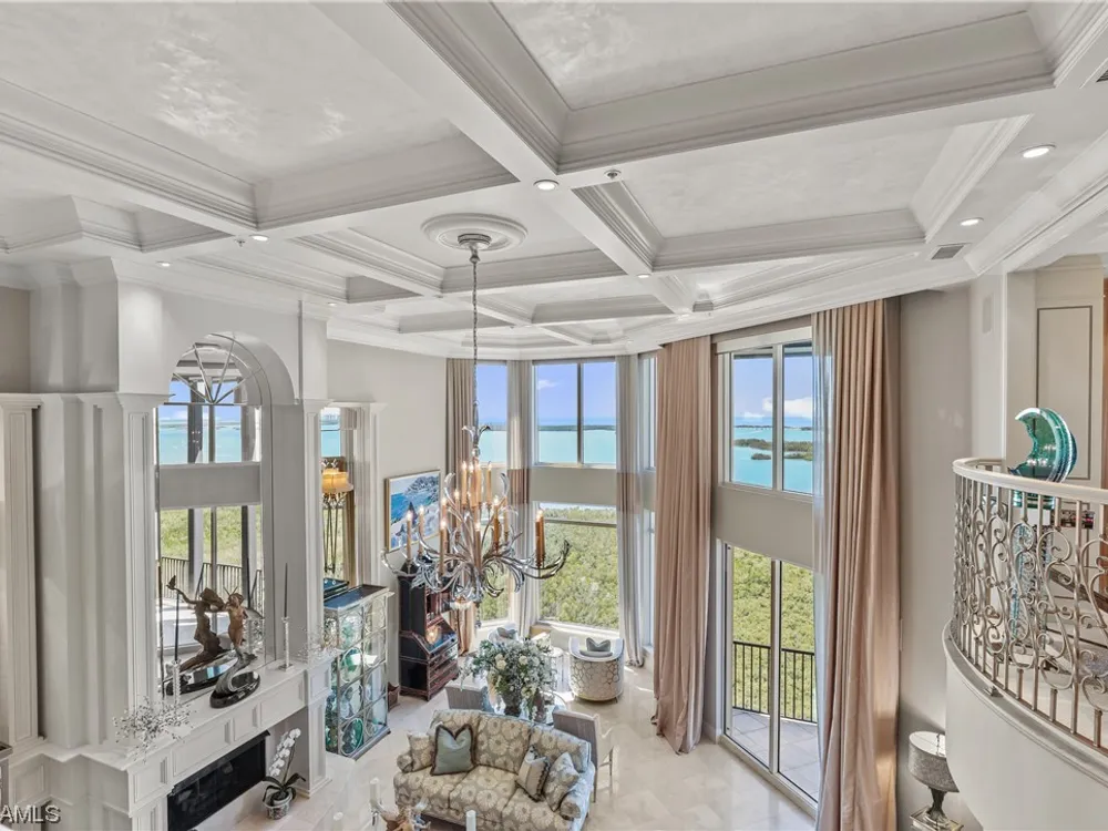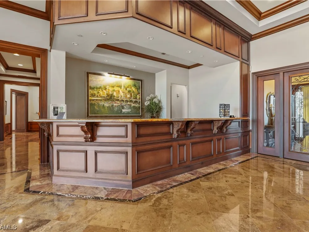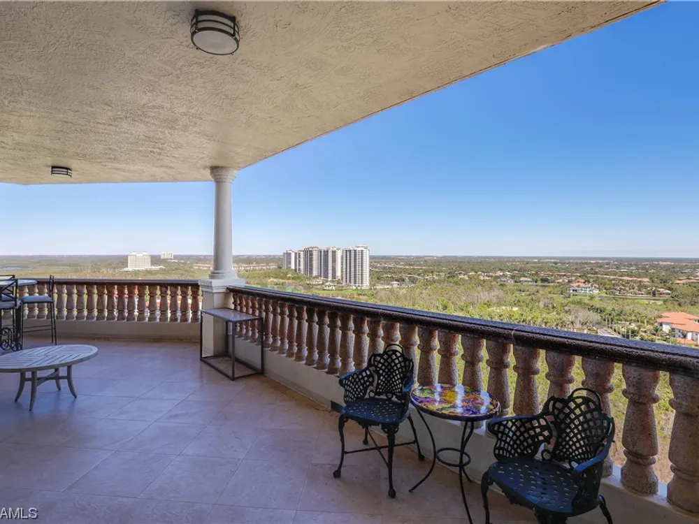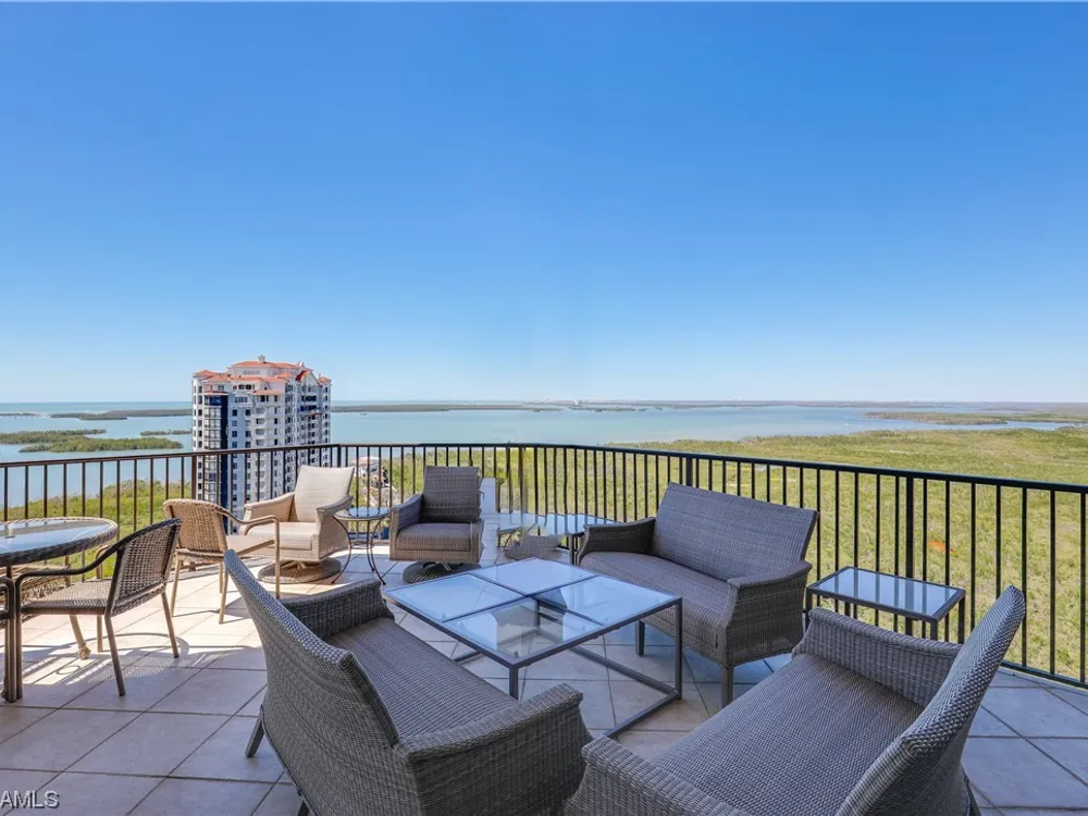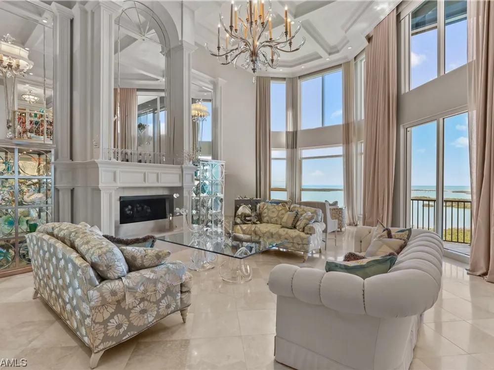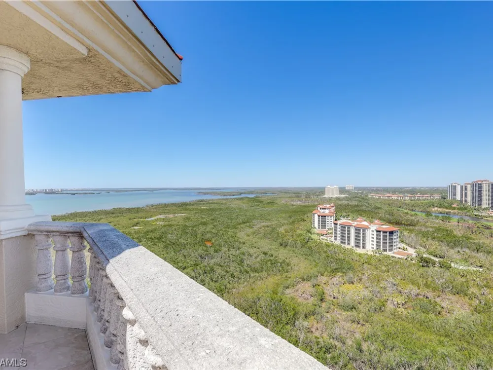 This luxurious two-story penthouse offers sweeping views of Estero Bay and the Gulf of Mexico. Polished marble tile flooring in a beautiful neutral tone creates a luxurious and timeless look. A custom-made curved staircase with wrought iron balusters adds a dramatic touch to the entryway. Soaring windows in the living room with a gas fireplace set the tone for entertaining. Subzero-built-in wine locker with temperature and humidity control to store and age your favorite wines. Top-of-the-line appliances, 6 burner gas range, and center island with additional dishwasher. Custom cabinets in the den, family room, library, upgraded lighting, laundry on both floors, and private enclosed 2-car garage with storage. Your most discerning buyers will fall in love. Palermo has 2 guest suites, a theater, billiards, a pool/spa, a BBQ pavilion, a fitness center, front desk staff, and an on-site building manager. Residents of The Colony enjoy private membership to a waterfront dining facility, The Bay Club, with exceptional views with sunset dining/entertainment. Experience a full array of amenities such as kayaking, canoeing, sailing, bocce, tennis, pickleball, and the private beach park accessed by water taxi. 15 minutes to the airport.