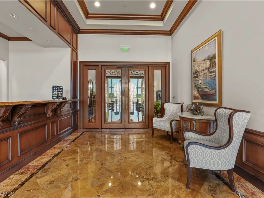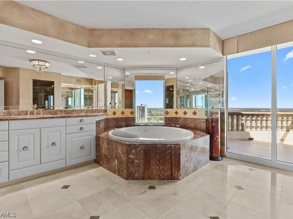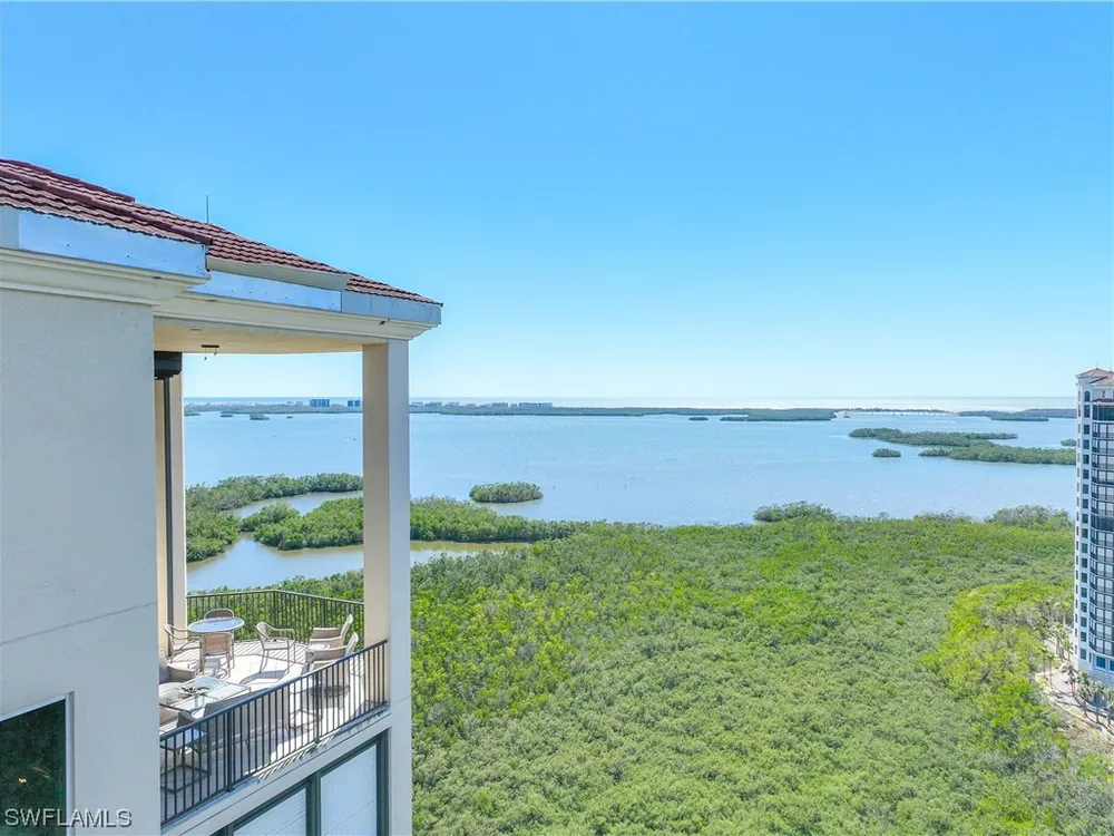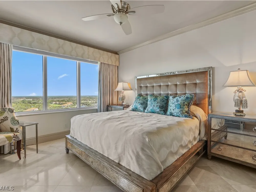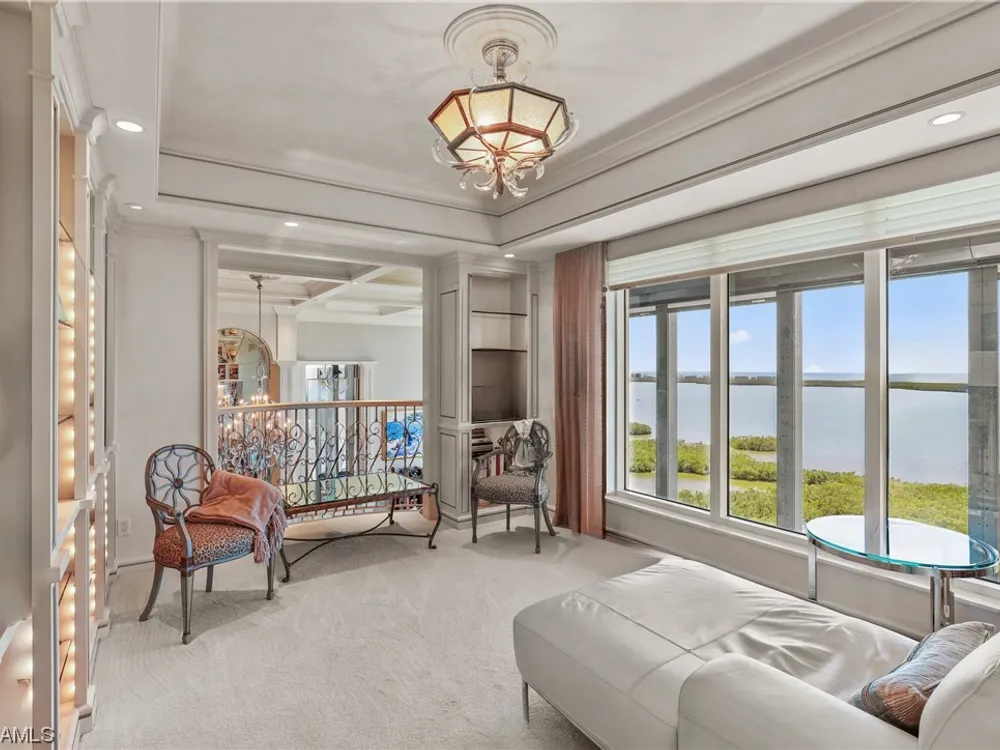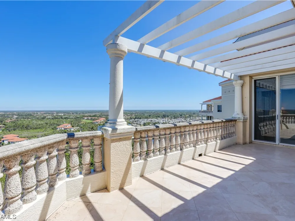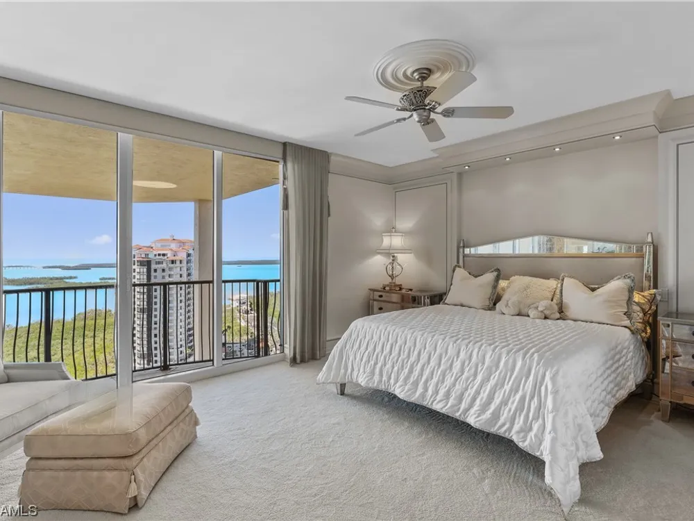 This luxurious two-story penthouse offers sweeping views of Estero Bay and the Gulf of Mexico. Polished marble tile flooring in a beautiful neutral tone creates a luxurious and timeless look. A custom-made curved staircase with wrought iron balusters adds a dramatic touch to the entryway. Soaring windows in the living room with a gas fireplace set the tone for entertaining. Subzero-built-in wine locker with temperature and humidity control to store and age your favorite wines. Top-of-the-line appliances, 6 burner gas range, and center island with additional dishwasher. Custom cabinets in the den, family room, library, upgraded lighting, laundry on both floors, and private enclosed 2-car garage with storage. Your most discerning buyers will fall in love. Palermo has 2 guest suites, a theater, billiards, a pool/spa, a BBQ pavilion, a fitness center, front desk staff, and an on-site building manager. Residents of The Colony enjoy private membership to a waterfront dining facility, The Bay Club, with exceptional views with sunset dining/entertainment. Experience a full array of amenities such as kayaking, canoeing, sailing, bocce, tennis, pickleball, and the private beach park accessed by water taxi. 15 minutes to the airport.