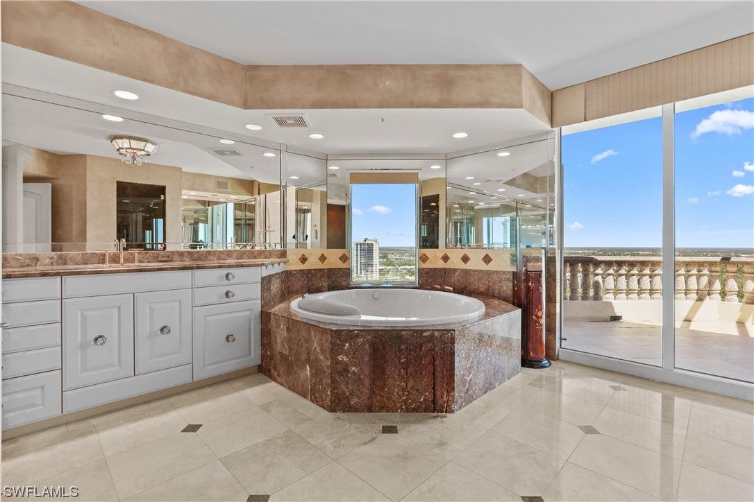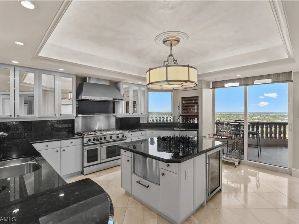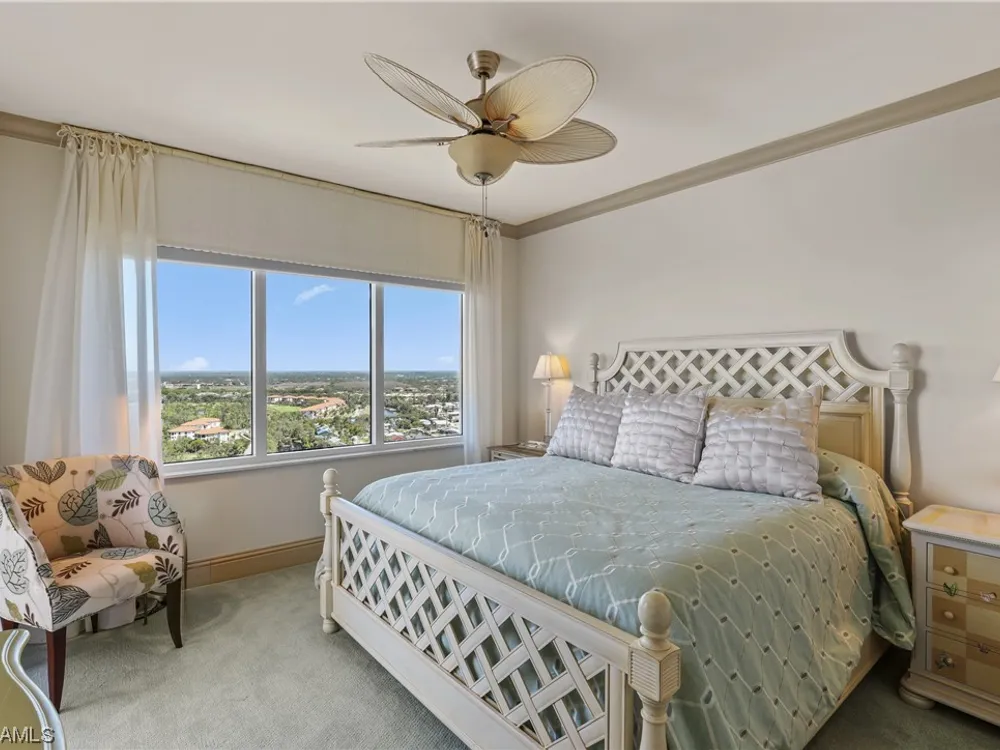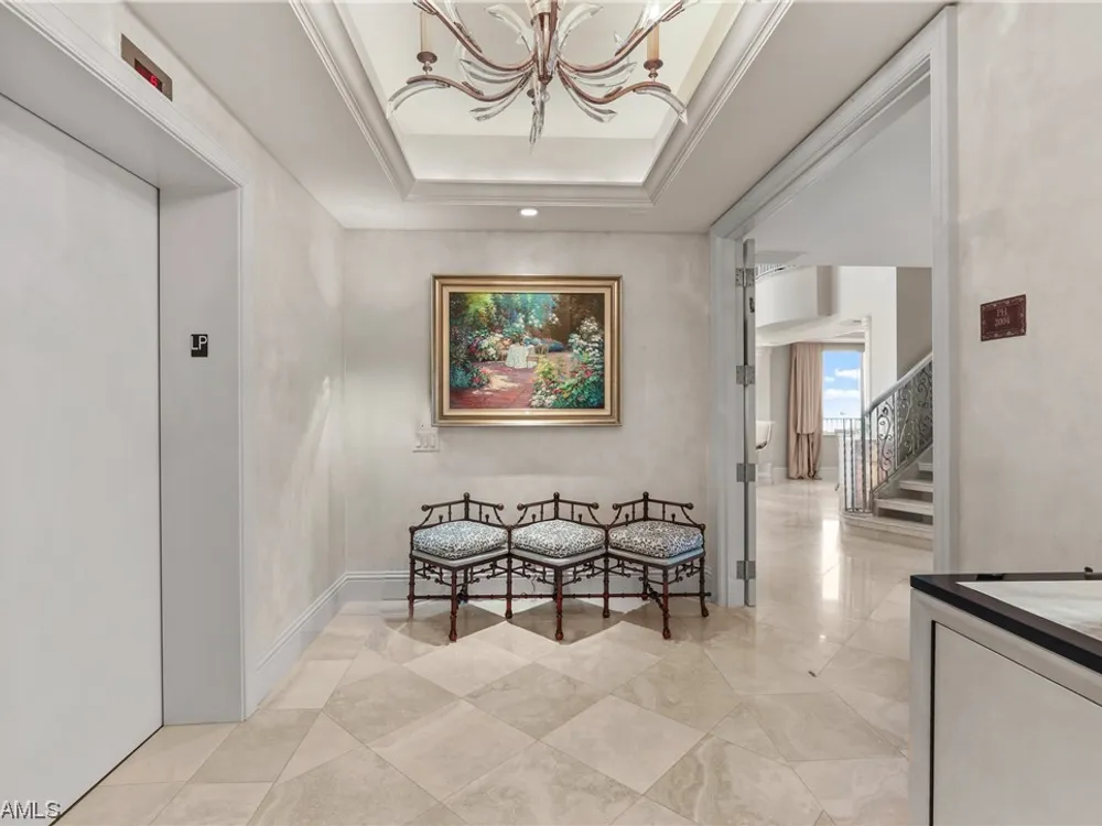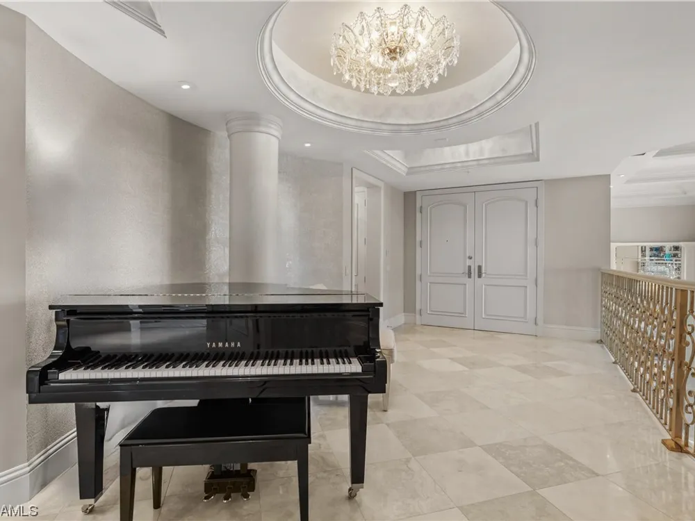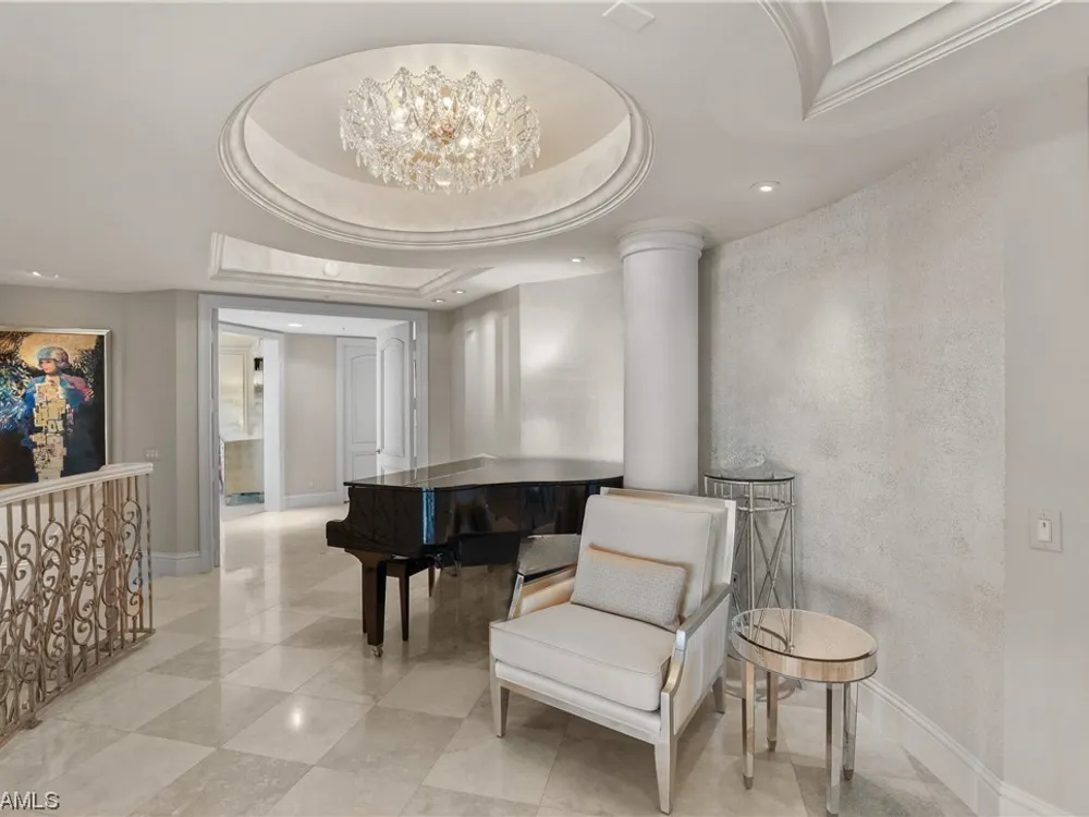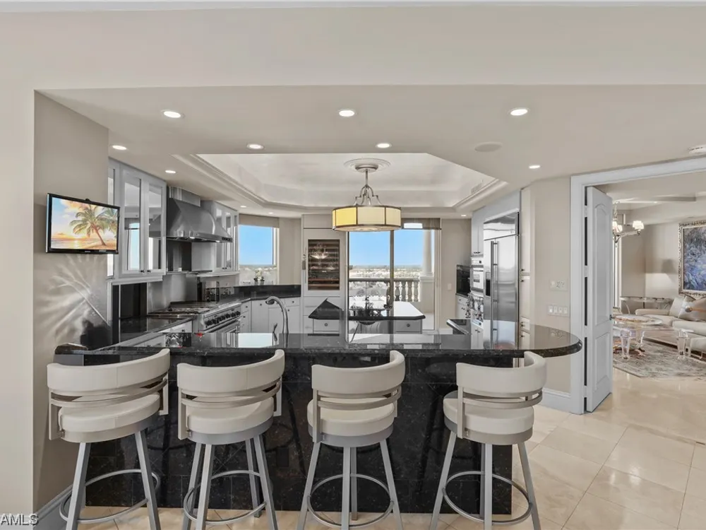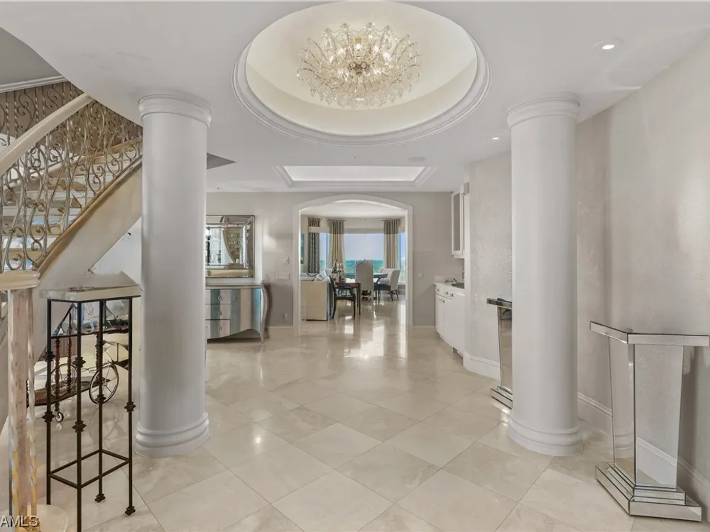 This luxurious two-story penthouse offers sweeping views of Estero Bay and the Gulf of Mexico. Polished marble tile flooring in a beautiful neutral tone creates a luxurious and timeless look. A custom-made curved staircase with wrought iron balusters adds a dramatic touch to the entryway. Soaring windows in the living room with a gas fireplace set the tone for entertaining. Subzero-built-in wine locker with temperature and humidity control to store and age your favorite wines. Top-of-the-line appliances, 6 burner gas range, and center island with additional dishwasher. Custom cabinets in the den, family room, library, upgraded lighting, laundry on both floors, and private enclosed 2-car garage with storage. Your most discerning buyers will fall in love. Palermo has 2 guest suites, a theater, billiards, a pool/spa, a BBQ pavilion, a fitness center, front desk staff, and an on-site building manager. Residents of The Colony enjoy private membership to a waterfront dining facility, The Bay Club, with exceptional views with sunset dining/entertainment. Experience a full array of amenities such as kayaking, canoeing, sailing, bocce, tennis, pickleball, and the private beach park accessed by water taxi. 15 minutes to the airport.