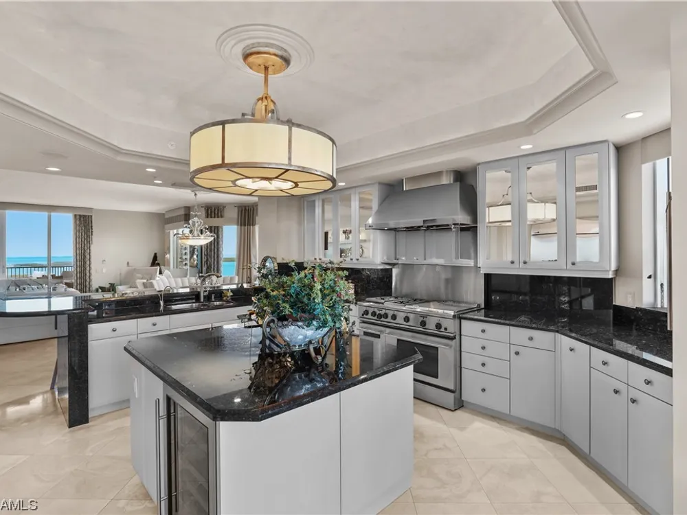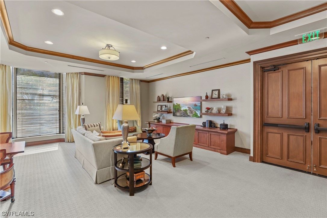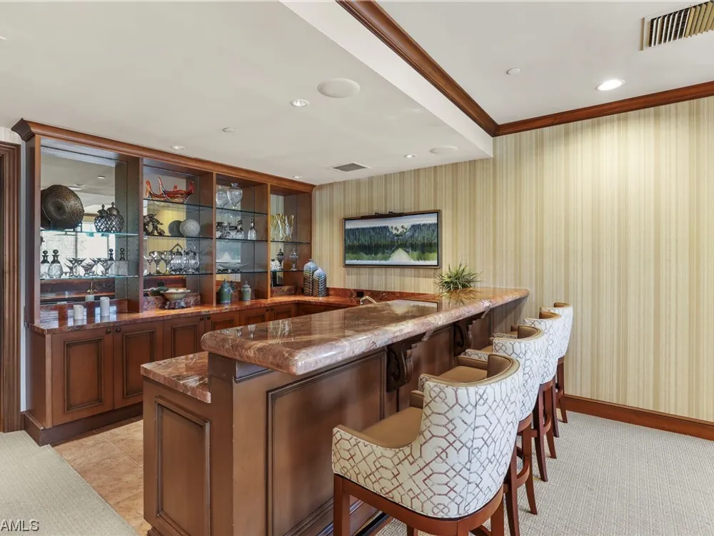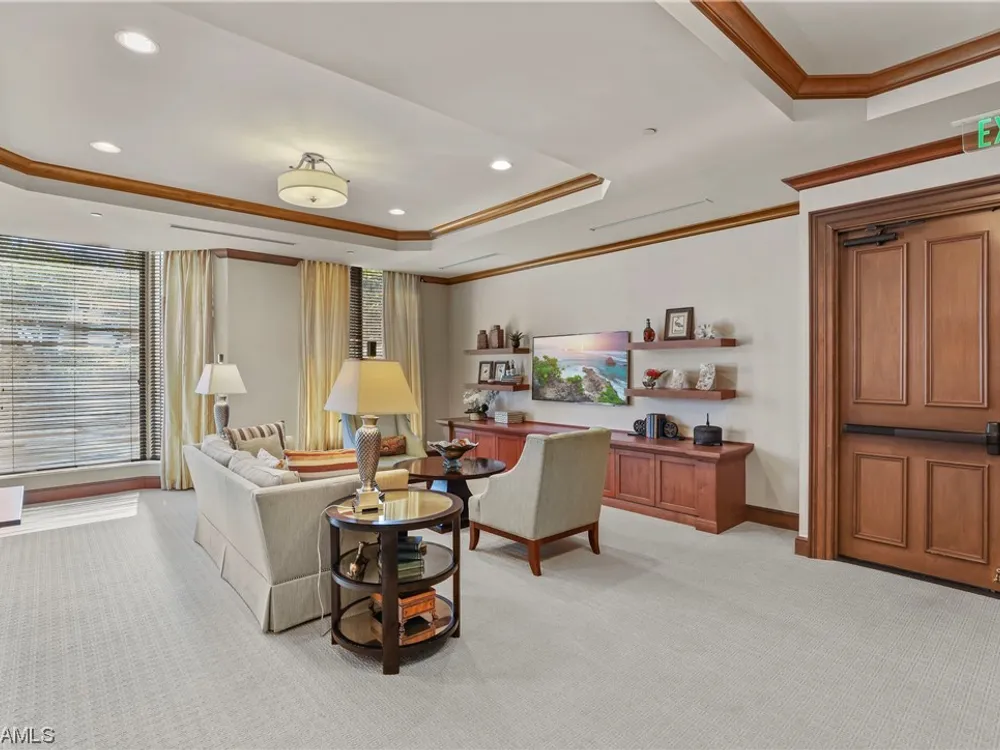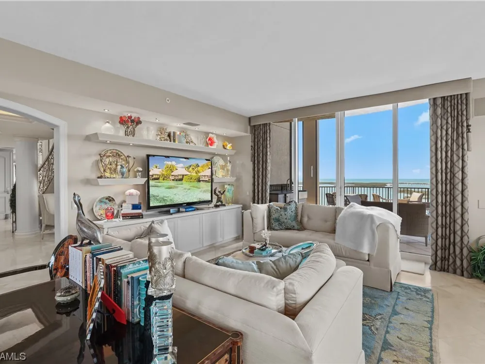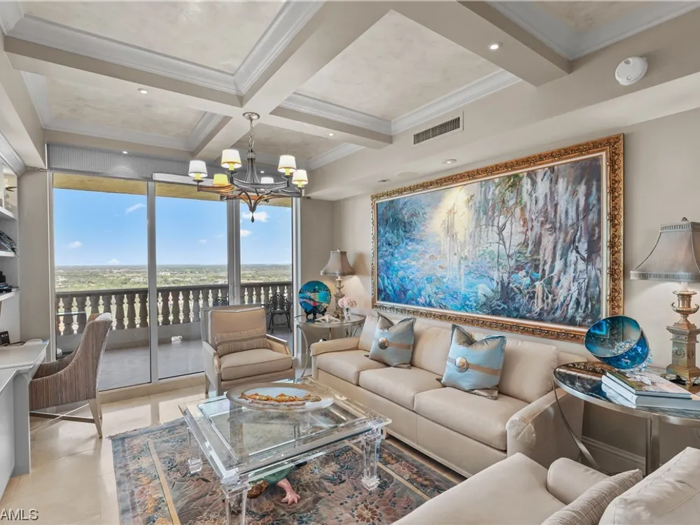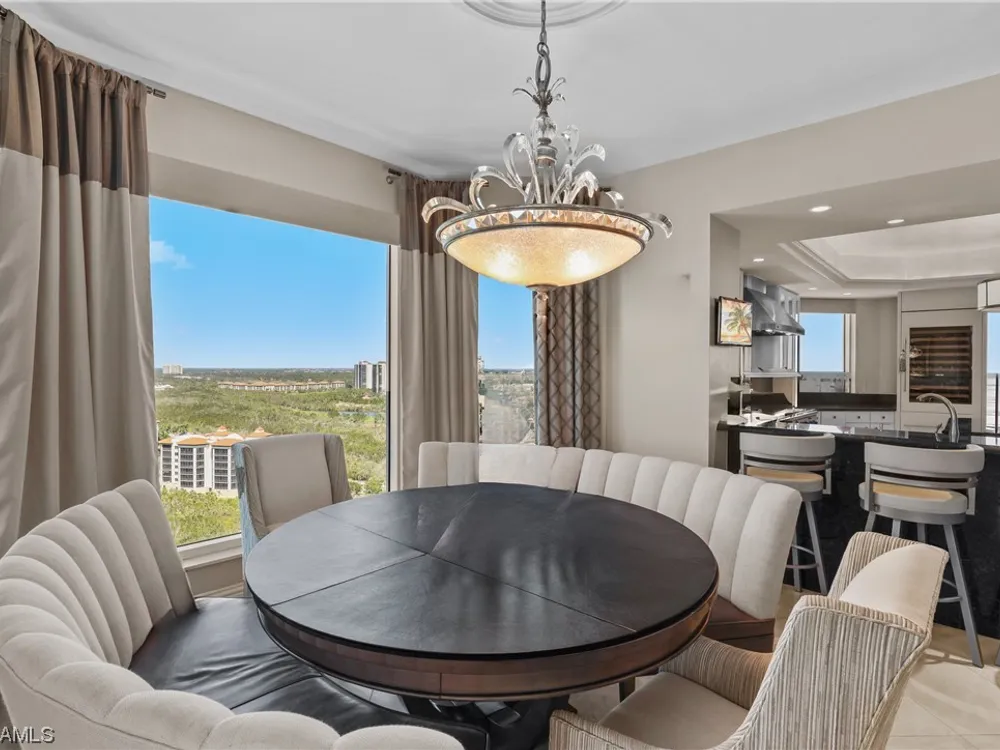 This luxurious two-story penthouse offers sweeping views of Estero Bay and the Gulf of Mexico. Polished marble tile flooring in a beautiful neutral tone creates a luxurious and timeless look. A custom-made curved staircase with wrought iron balusters adds a dramatic touch to the entryway. Soaring windows in the living room with a gas fireplace set the tone for entertaining. Subzero-built-in wine locker with temperature and humidity control to store and age your favorite wines. Top-of-the-line appliances, 6 burner gas range, and center island with additional dishwasher. Custom cabinets in the den, family room, library, upgraded lighting, laundry on both floors, and private enclosed 2-car garage with storage. Your most discerning buyers will fall in love. Palermo has 2 guest suites, a theater, billiards, a pool/spa, a BBQ pavilion, a fitness center, front desk staff, and an on-site building manager. Residents of The Colony enjoy private membership to a waterfront dining facility, The Bay Club, with exceptional views with sunset dining/entertainment. Experience a full array of amenities such as kayaking, canoeing, sailing, bocce, tennis, pickleball, and the private beach park accessed by water taxi. 15 minutes to the airport.