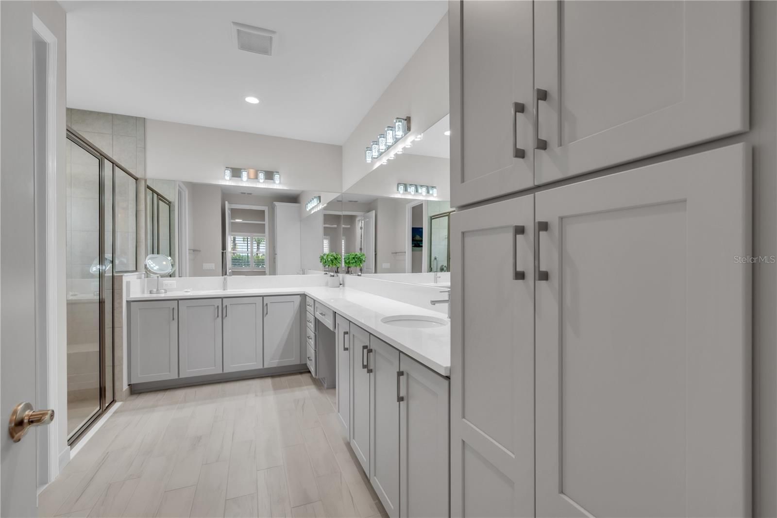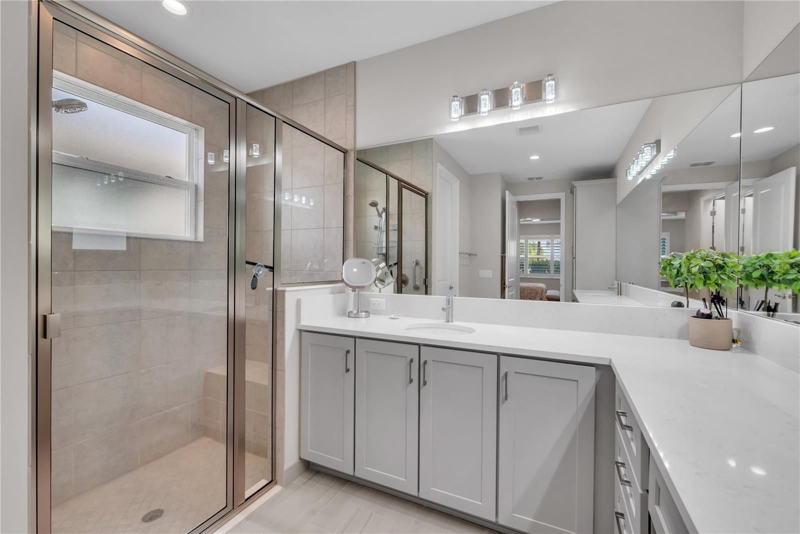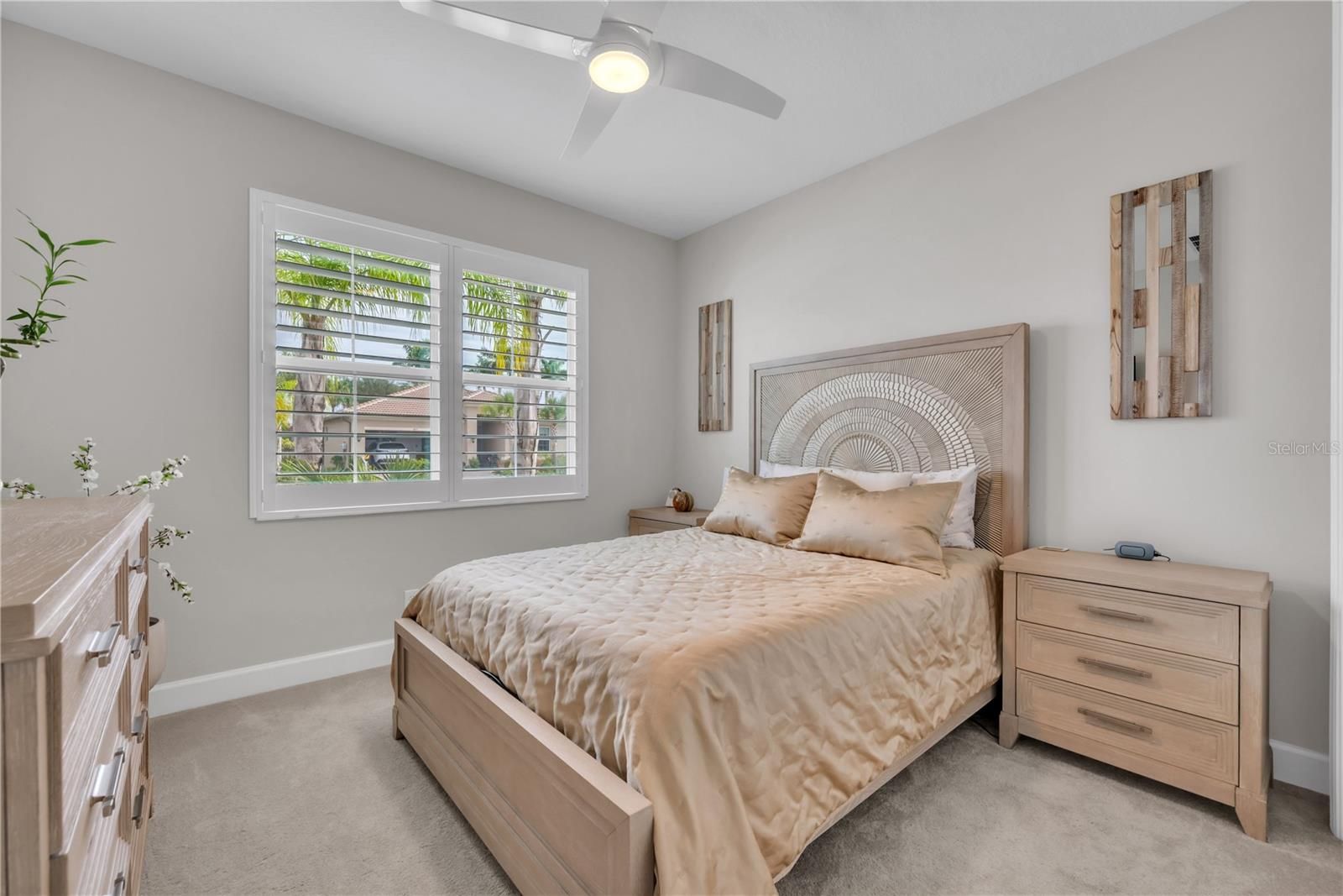 Enjoy breathtaking Florida sunsets and tranquil long water views from your private, solar-heated saltwater pool and spa in this beautifully upgraded residence located in Valencia del Sol, Tampa Bay’s premier 55+ resort-style community. Built in 2023 and truly move-in ready, this 2-bedroom, 2-bath home with an oversized enclosed den offers 1,710 square feet of thoughtfully designed living space with an open-concept layout ideal for entertaining and everyday comfort. Western exposure provides stunning sunset views, while exceptional curb appeal is enhanced by a widened brick paver driveway and walkway, additional landscaping, and a screened front entry. Inside, the spacious great room seamlessly connects to the kitchen and dining areas and is highlighted by triple 8-foot sliding glass doors that open to a covered, screened lanai. The outdoor living space features a heated saltwater pool and spa which runs on solar power creating a private retreat with peaceful water views and year-round enjoyment. A roll-down window shade on the sliders adds comfort and privacy without sacrificing natural light. The gourmet kitchen is beautifully appointed with 42-inch light gray maple cabinetry with crown molding and under- and over-cabinet lighting, Silestone quartz countertops, a full quartz backsplash, and a large peninsula with counter-height seating. Additional features include stainless steel appliances, a slide-in gas range, a premium refrigerator with a built-in coffee maker, soft-close drawers, an undermount sink, double trash pull-out, and a built-in pantry with pull-out shelving. Porcelain plank tile flooring flows throughout the main living areas, den, and wet areas, offering durability and modern style. The primary suite is a private retreat with a coffered ceiling and two oversized built-in walk-in closets. The en-suite bath features dual quartz vanities and a spacious walk-in shower. The oversized den, enclosed with solid two-panel French doors, offers flexible use as a home office, media room, or optional third bedroom. Additional highlights include a well-appointed laundry room with upper cabinetry and front-load GE washer and dryer, variable-speed air handler, designer lighting, plantation shutters, hurricane shutters, whole-house surge protector, sealed pavers, rain gutters, water softener, insulated garage door with opener, and overhead garage storage. This solar-powered home offers exceptional energy efficiency. Buyer to assume the current solar panel lease of $100/month, delivering significant annual savings on electric bills. Valencia del Sol offers an unmatched lifestyle with luxury amenities including a resort-style pool, clubhouse, fitness center, tennis and pickleball courts, on-site café, and a vibrant social calendar. This exceptional home perfectly blends elegance, efficiency, and resort-style living in one of the area’s most sought-after 55+ communities.