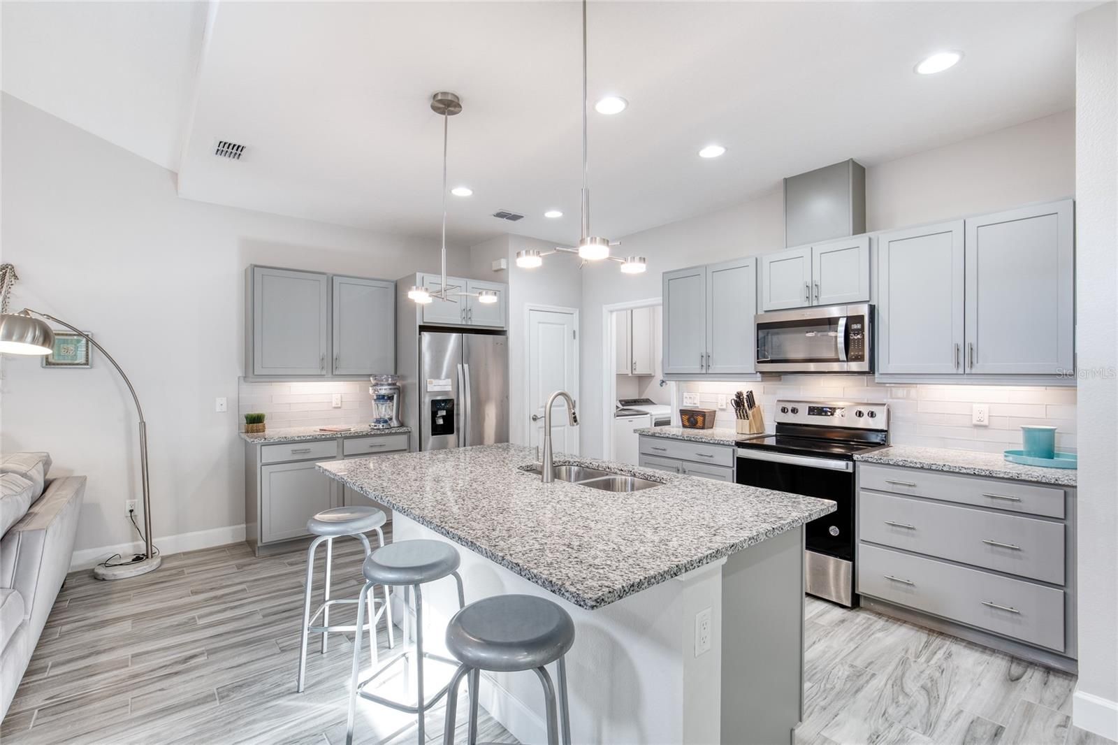 Thoughtfully designed and meticulously maintained, this Camellia Cottage is ideally situated in the popular Latitude of Daytona Beach, a premier 55+ lifestyle community. A welcoming screened front porch with 20/20 mesh opens to a bright split-bedroom floor plan featuring a vaulted ceiling in the living room, flowing seamlessly into the fully equipped kitchen and separate dining area. Level 5 wood-look plank tile flooring extends throughout the home and is complemented by 5¼-inch base molding, recessed lighting, and ceiling fans, creating a light and inviting atmosphere. The kitchen offers upgraded stone gray 36-inch upper cabinets, lower cabinets with pot-and-pan drawers and pull-out shelving, a full-height tile backsplash, granite countertops, pantry, and stainless steel Whirlpool appliances. The spacious primary suite includes a walk-in closet and a spa-inspired ensuite bath with a seamless glass walk-in shower tiled to the ceiling, upgraded cabinetry with center drawer stack, and a granite countertop with undermount rectangular sinks. The guest wing features a comfortable bedroom and full bath with upgraded cabinetry, granite countertop, and a tub/shower combination with tile to the ceiling. Additional highlights include an epoxy-coated garage floor with utility sink. Enjoy an exceptional lifestyle with access to a vibrant community town center featuring live music every Friday and Saturday evening. Residents can relax at the stunning tropical lagoon-style resort pool with daily live music, or take advantage of two additional heated pools, including a sports pool and an indoor lap pool. An impressive lineup of amenities includes tennis, pickleball, bocce, pool volleyball, and a golf cart–friendly dog park designed with four-legged companions in mind. Creative and social opportunities abound with pottery and woodworking studios, a community theater, and the popular Bar & Chill restaurant, perfect for gathering with friends and neighbors. Adding to the appeal is a private oceanfront beach club offering loungers, umbrellas, and a heated pool for the ultimate coastal escape. Low-maintenance living is included with lawn care, landscaping, exterior painting, and roof maintenance, allowing more time to enjoy everything this thoughtfully planned community provides. Schedule your private tour today and experience the resort-style lifestyle available at Latitude of Daytona Beach. All information recorded in the MLS is intended to be accurate but cannot be guaranteed.