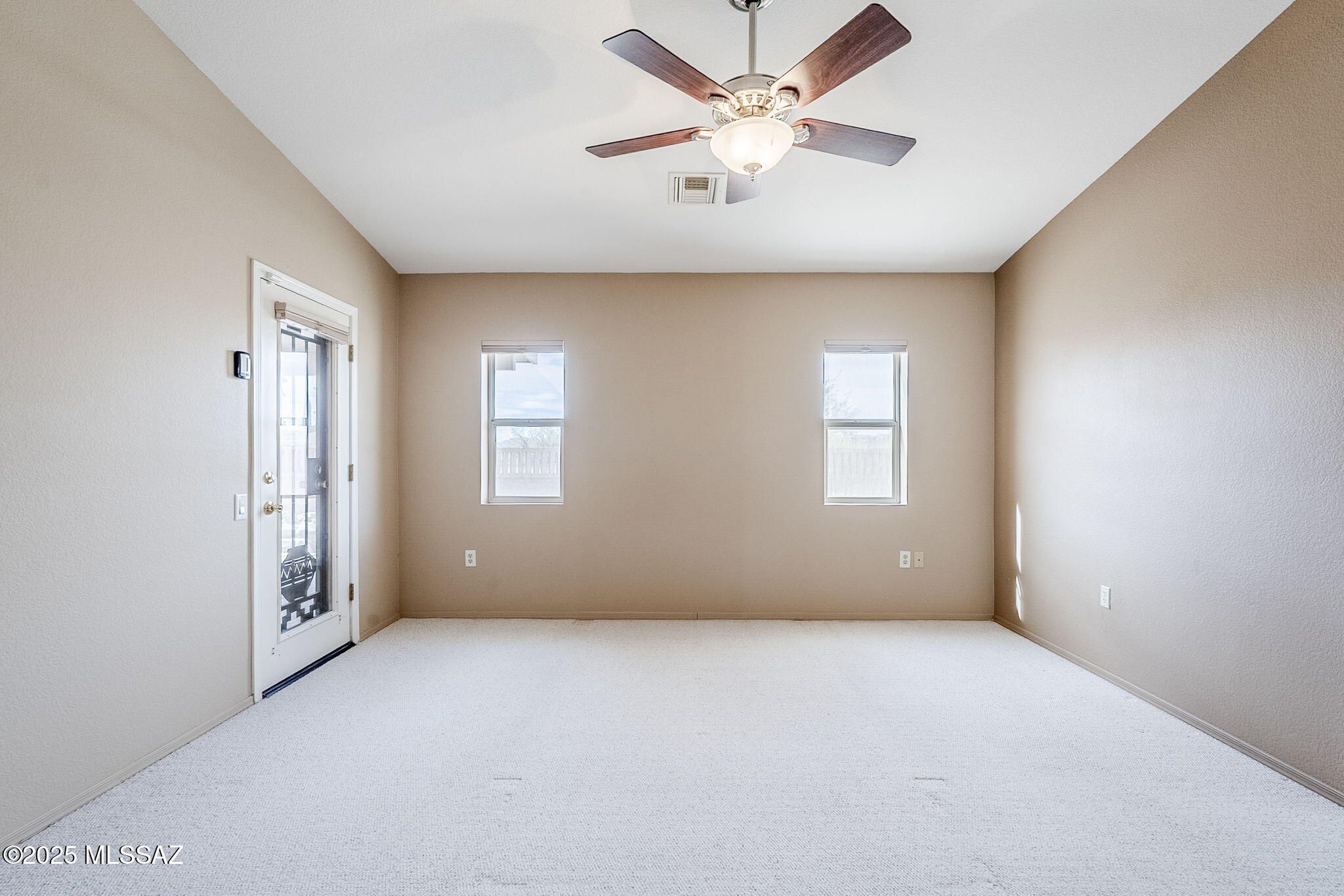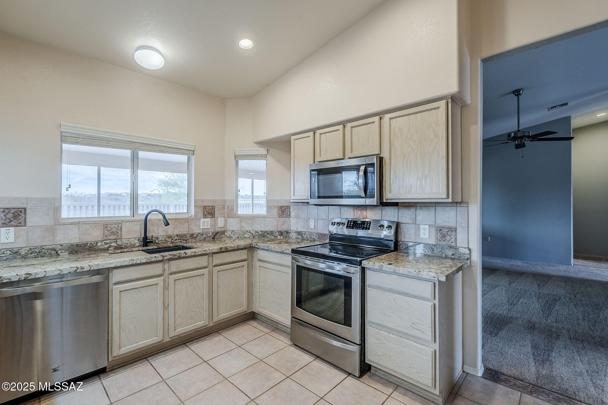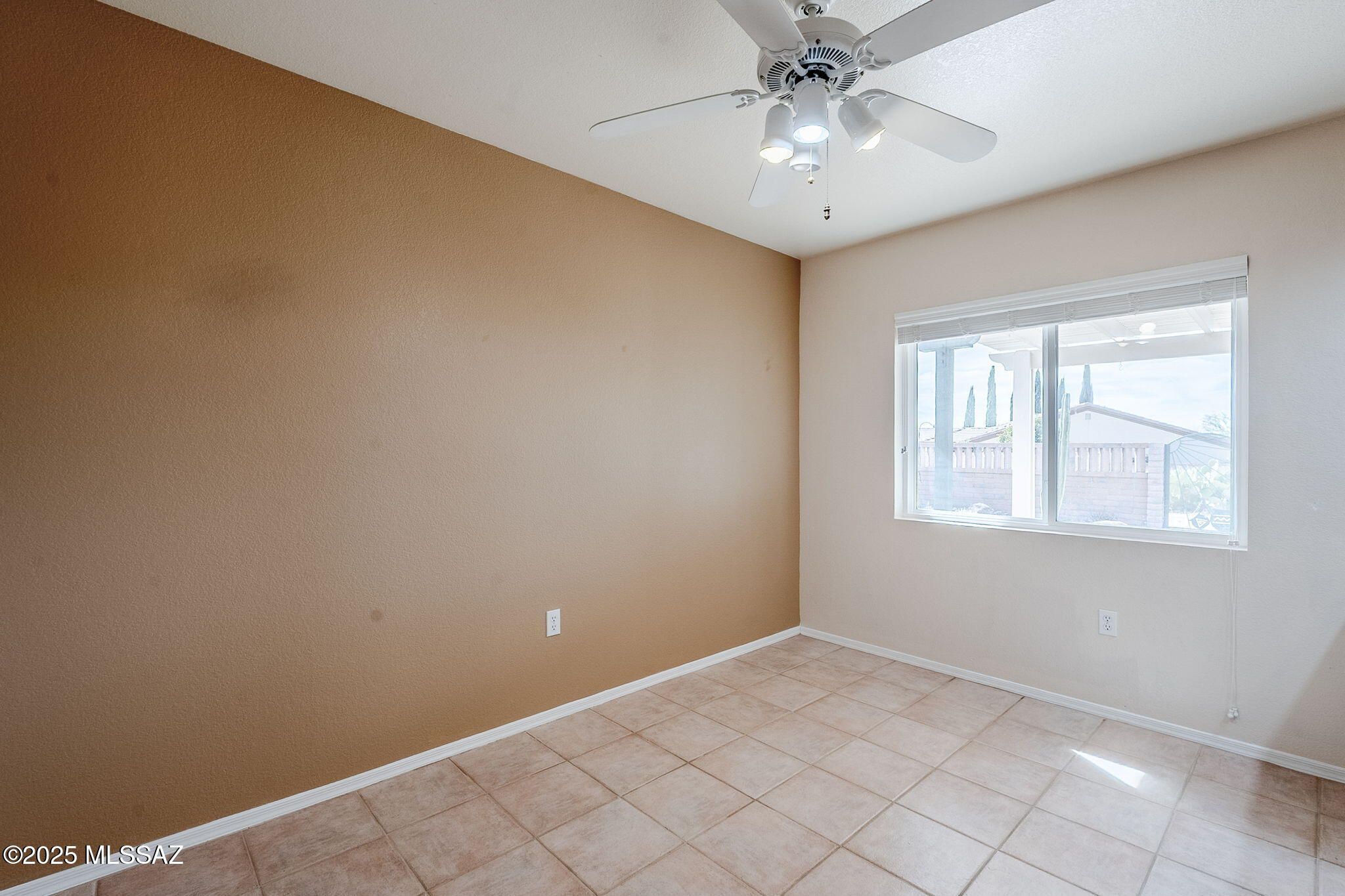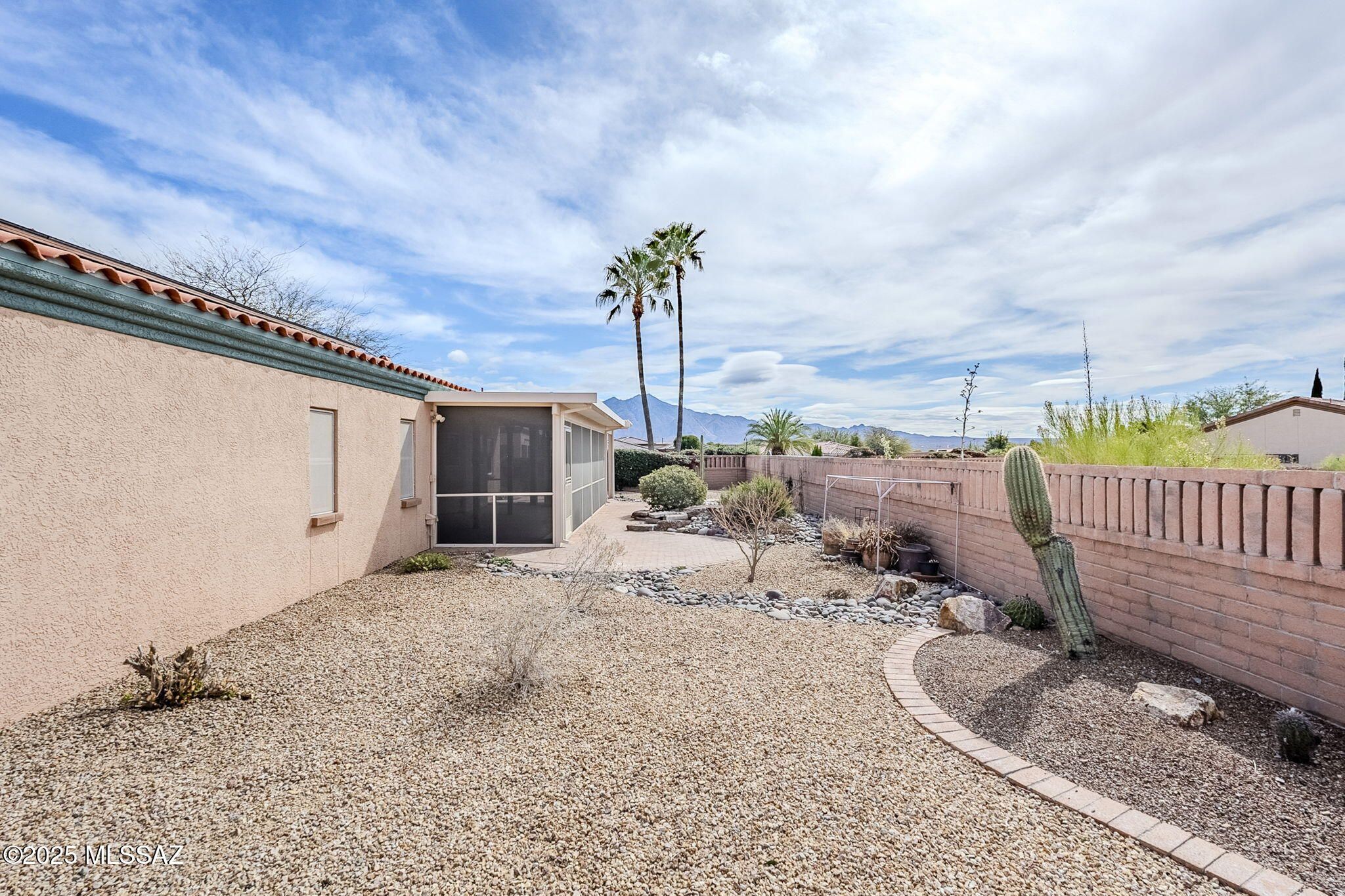 This home comes with an abundance of Arizona sunshine to power the SOLAR ENERGY PANELS almost eliminating your electric bills. Conveniently located with easy access to I-19 and minutes to two golf courses. 1867 sq ft home . . . extremely well maintained. Primary en suite, double vanity, shower-tub and large walk-in closet. Guest bedroom and bath (hall pocket door closes off this space for guest privacy). Eat-in kitchen with stainless steel appliances and pull out shelving, living/dining room, family room/den with custom mesquite color entertainment center, laundry room. 35 foot enclosed sun porch with higher slump brick, solider detail fence/wall gated to rear yard. Garage has separated storage room. Citrus trees, orange and grapefruit . . . delicious! No close back door neighbors.