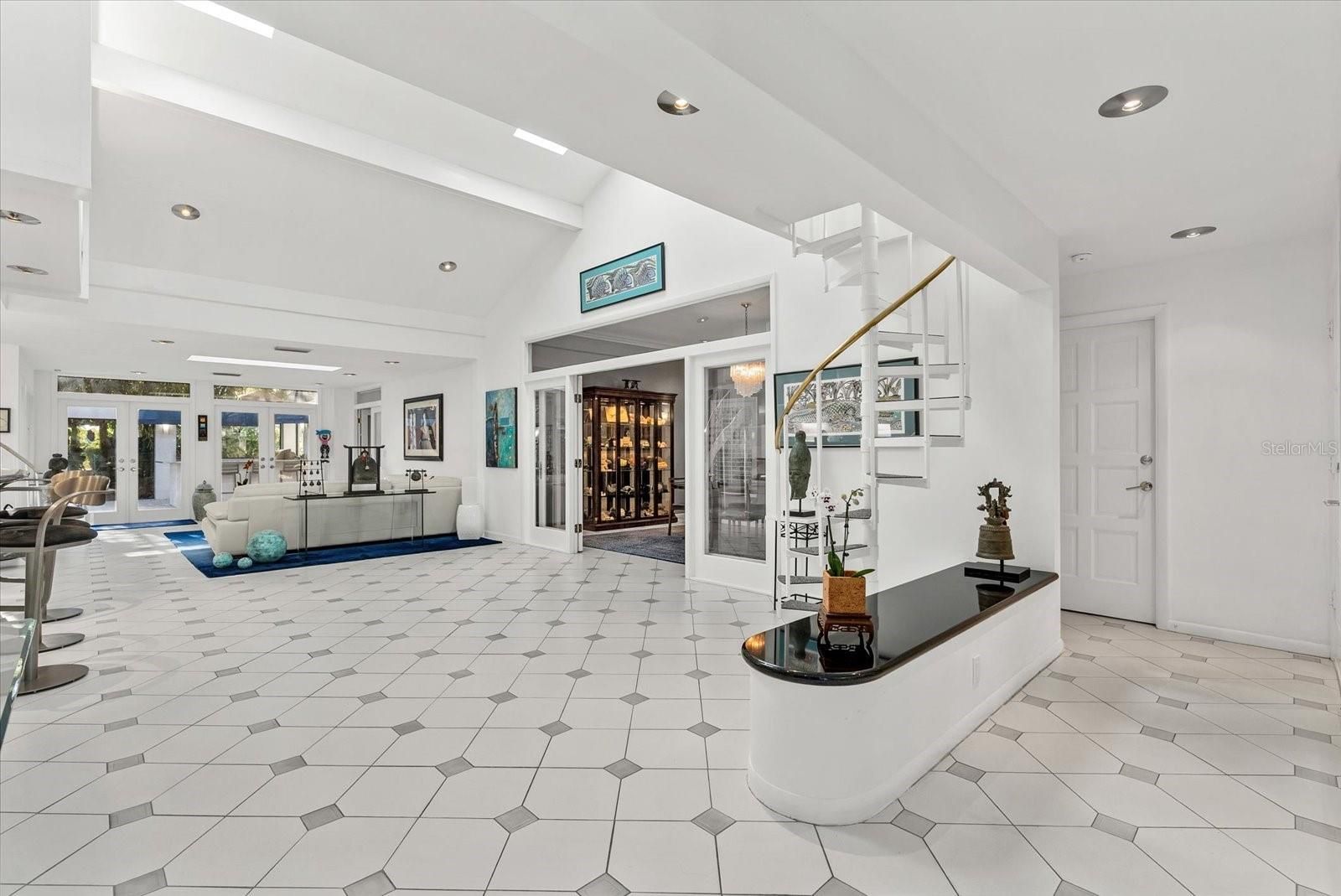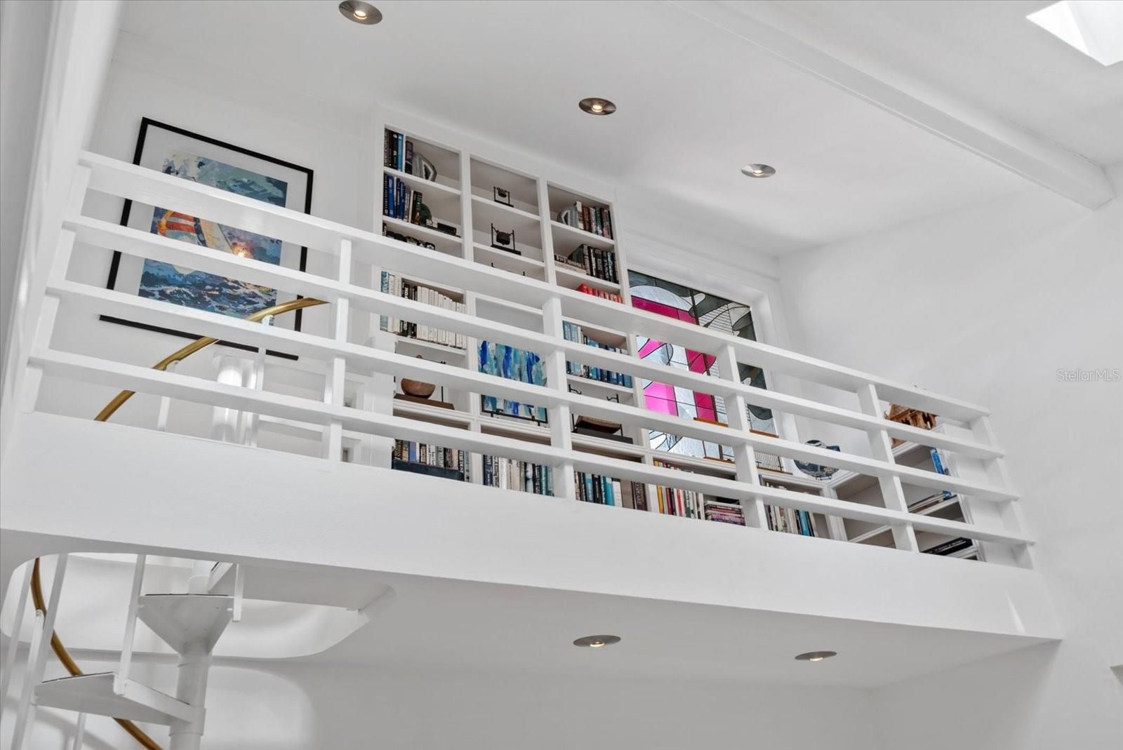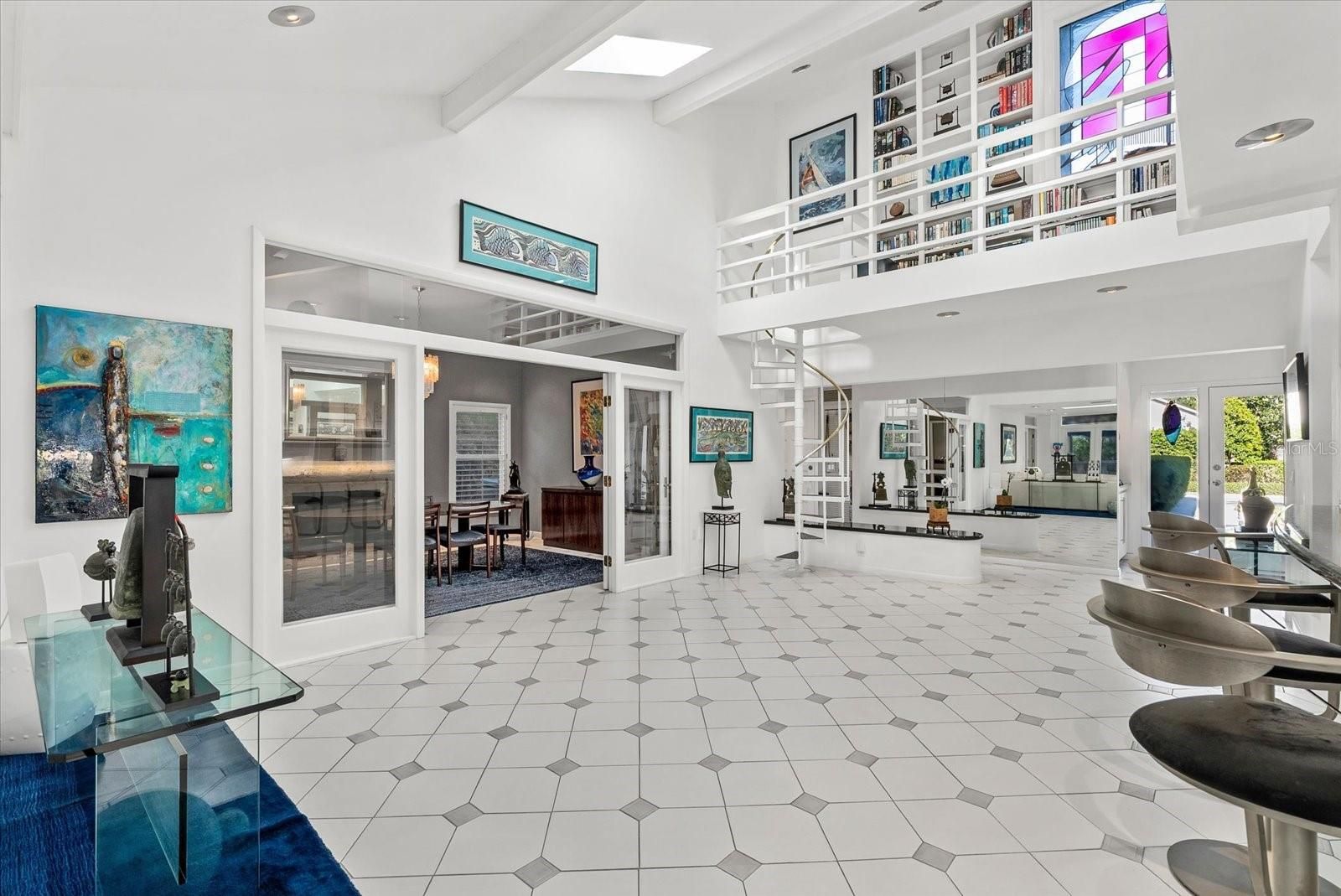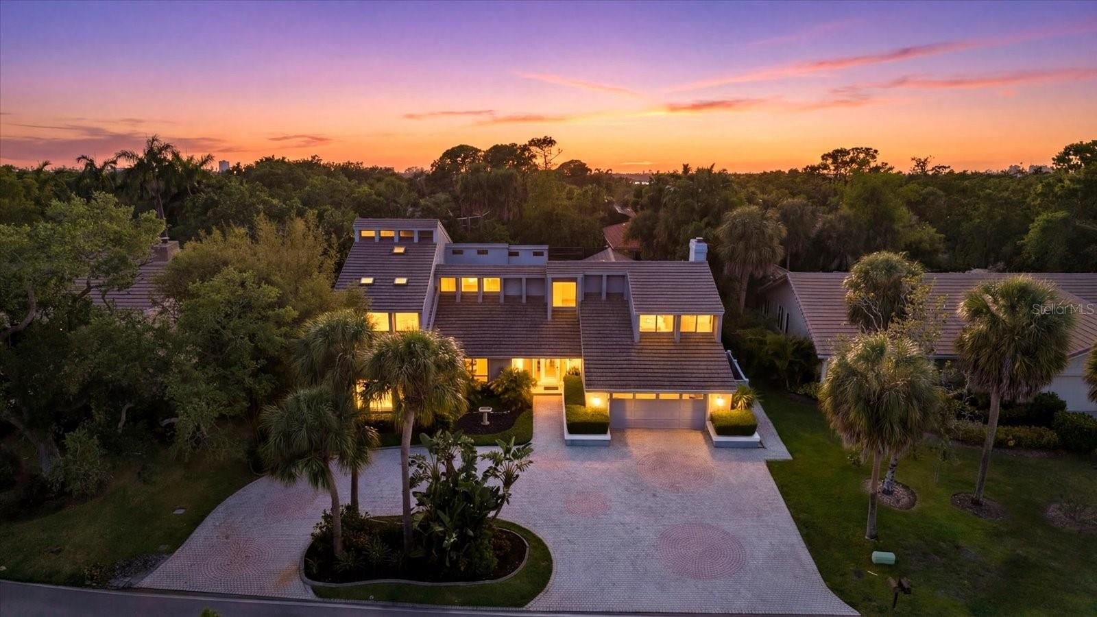 Tucked within the winding, tree-lined streets of one of Sarasota's most coveted west of trail communities, this architectural gem offers a rare opportunity to own a signature custom home in The Landings. With over 3,800 square feet of living space, four bedrooms, four full baths, and a powder room, this 1983 residence is the epitome of elevated design - where bold architectural character meets serene, sanctuary-style living. Soaring vaulted ceilings and dramatic spiral stairwells set the tone from the moment you enter. An elevated library nook invites quiet retreat, while custom stained glass windows cast beautifully filtered light throughout the day. A dedicated meditation space adds a dimension of wellness rarely found in residential design - your own private escape to find balance and calm. The outdoor living experience has been thoughtfully reimagined. A resurfaced private pool anchors the expansive lanai, now complemented by a generous outdoor kitchen ideal for entertaining or simply savoring the Florida lifestyle in style. Life at The Landings extends well beyond your front door. Winding roads shaded by mature canopy trees, neighborhood lakes, parks, and nature trails create an idyllic backdrop for morning walks, cycling, and quiet reflection. Residents enjoy direct access to Roberts Bay, and the community's optional Racquet Club offers swimming, tennis, and lessons just a short bike ride away — a lifestyle as active or as tranquil as you choose. This is more than a home. It is a retreat, a statement, and a community.