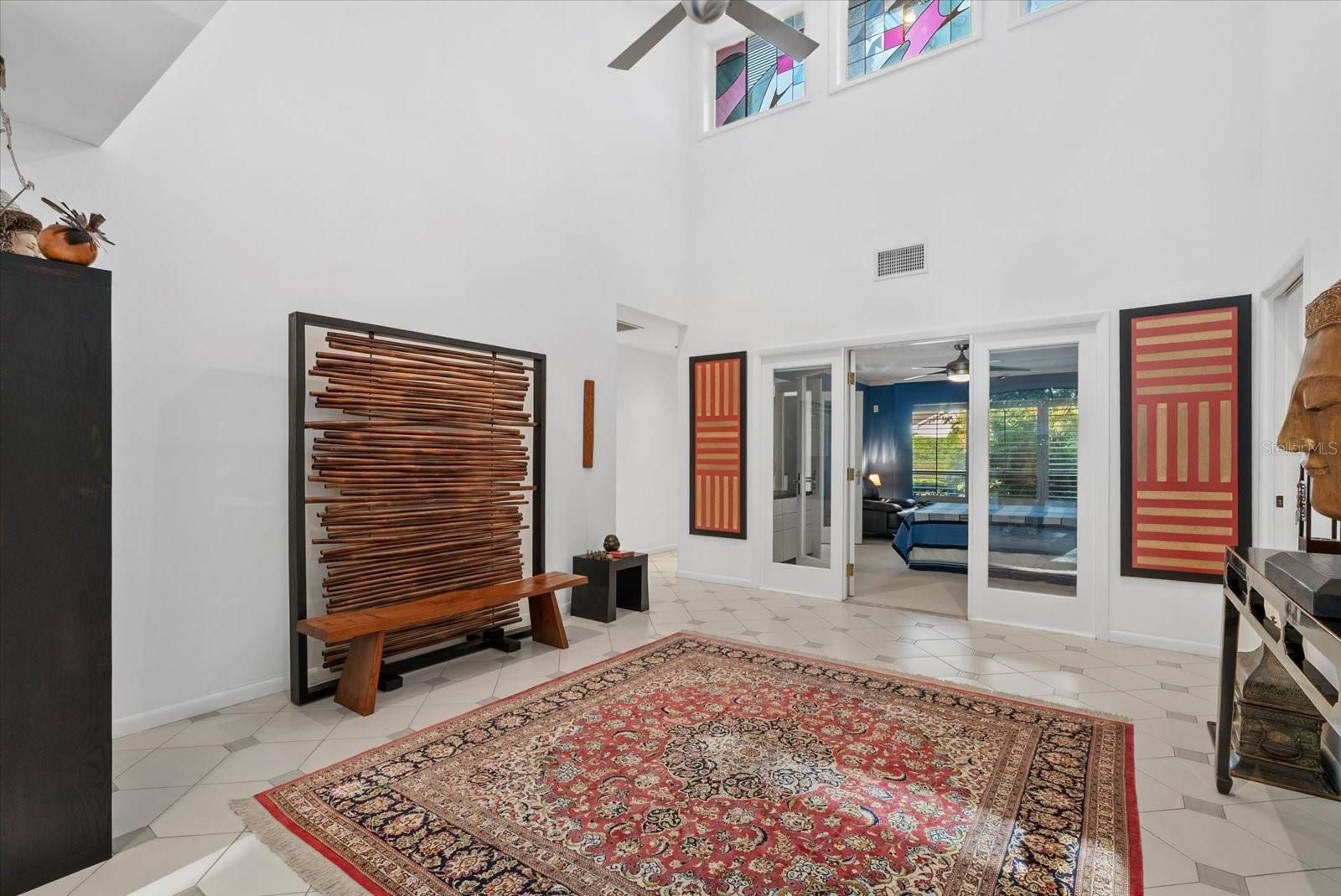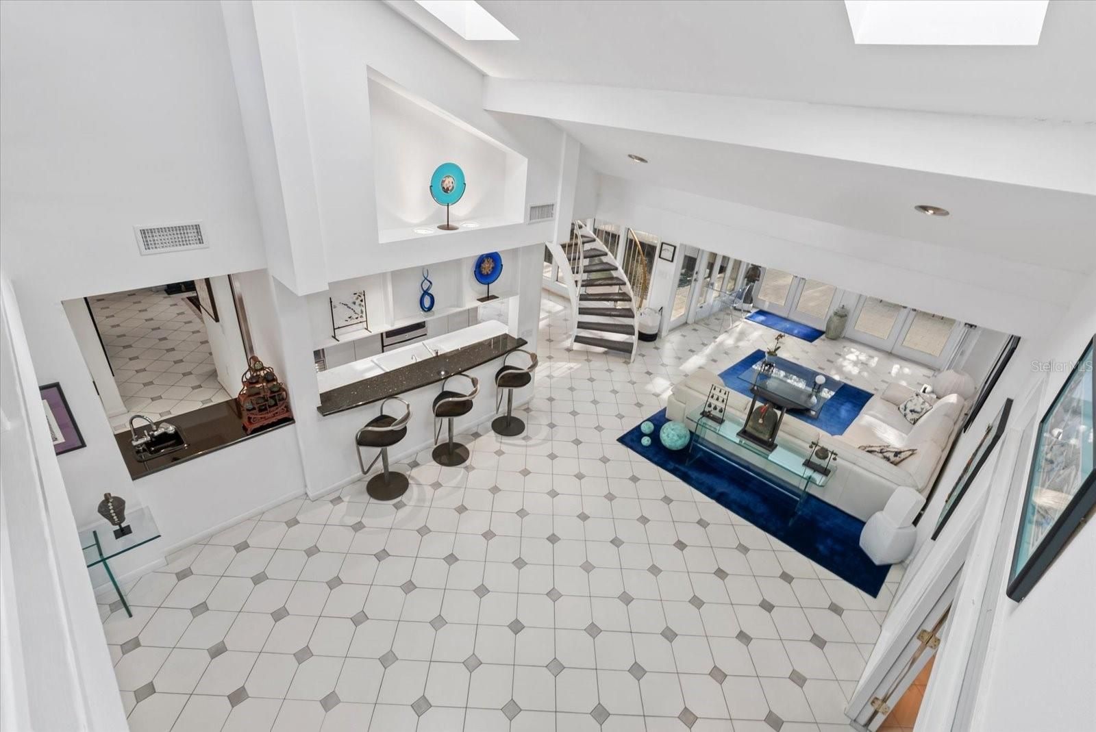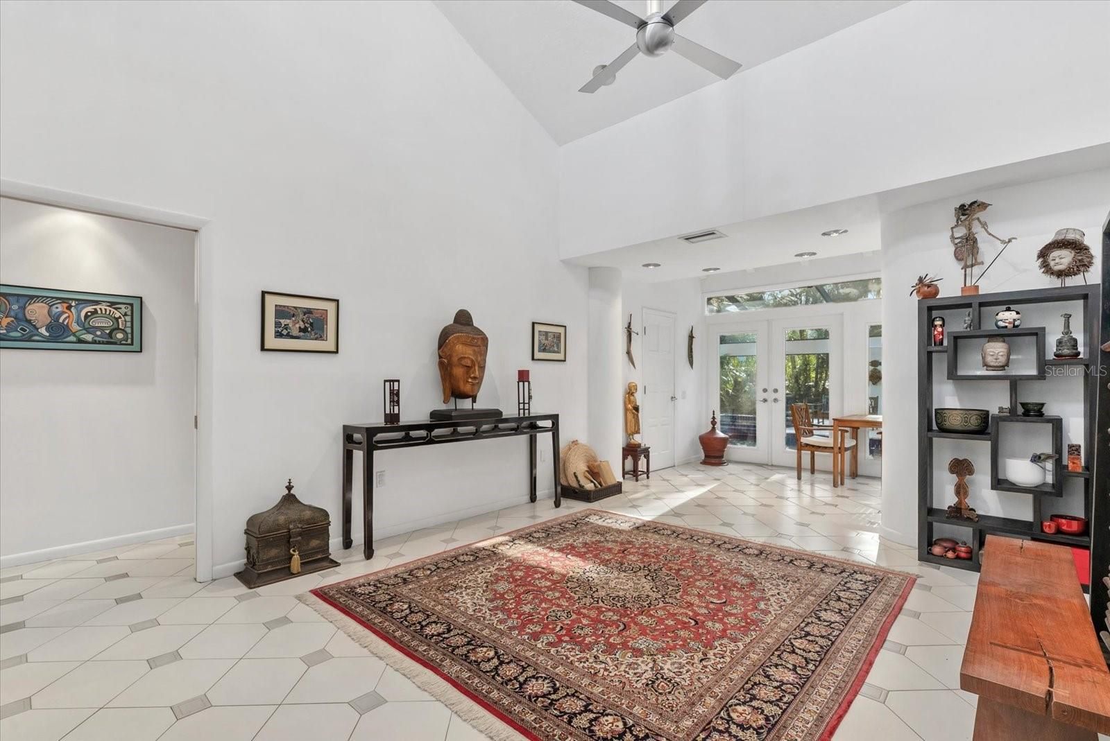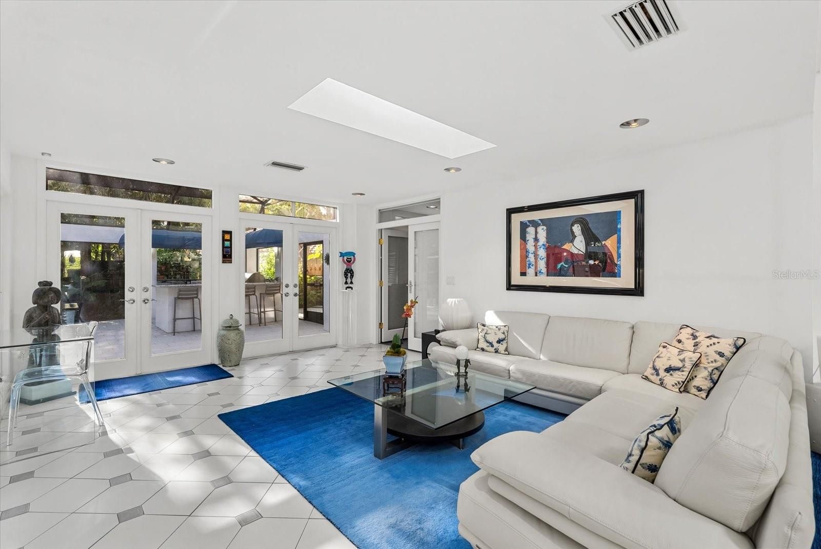 Tucked within the winding, tree-lined streets of one of Sarasota's most coveted west of trail communities, this architectural gem offers a rare opportunity to own a signature custom home in The Landings. With over 3,800 square feet of living space, four bedrooms, four full baths, and a powder room, this 1983 residence is the epitome of elevated design - where bold architectural character meets serene, sanctuary-style living. Soaring vaulted ceilings and dramatic spiral stairwells set the tone from the moment you enter. An elevated library nook invites quiet retreat, while custom stained glass windows cast beautifully filtered light throughout the day. A dedicated meditation space adds a dimension of wellness rarely found in residential design - your own private escape to find balance and calm. The outdoor living experience has been thoughtfully reimagined. A resurfaced private pool anchors the expansive lanai, now complemented by a generous outdoor kitchen ideal for entertaining or simply savoring the Florida lifestyle in style. Life at The Landings extends well beyond your front door. Winding roads shaded by mature canopy trees, neighborhood lakes, parks, and nature trails create an idyllic backdrop for morning walks, cycling, and quiet reflection. Residents enjoy direct access to Roberts Bay, and the community's optional Racquet Club offers swimming, tennis, and lessons just a short bike ride away — a lifestyle as active or as tranquil as you choose. This is more than a home. It is a retreat, a statement, and a community.