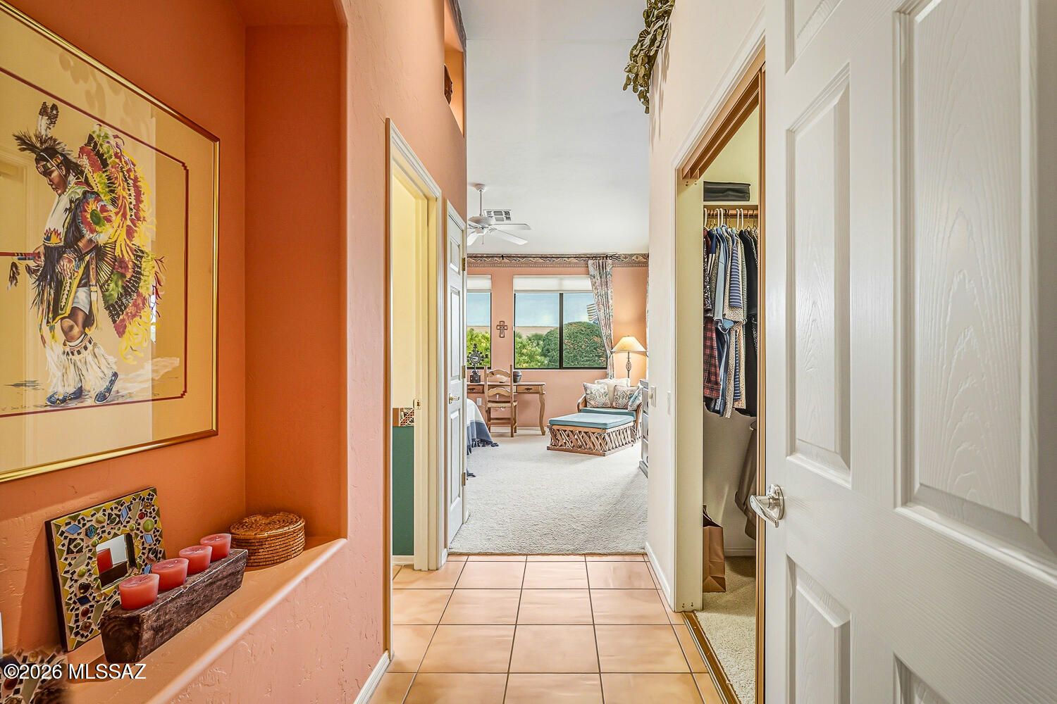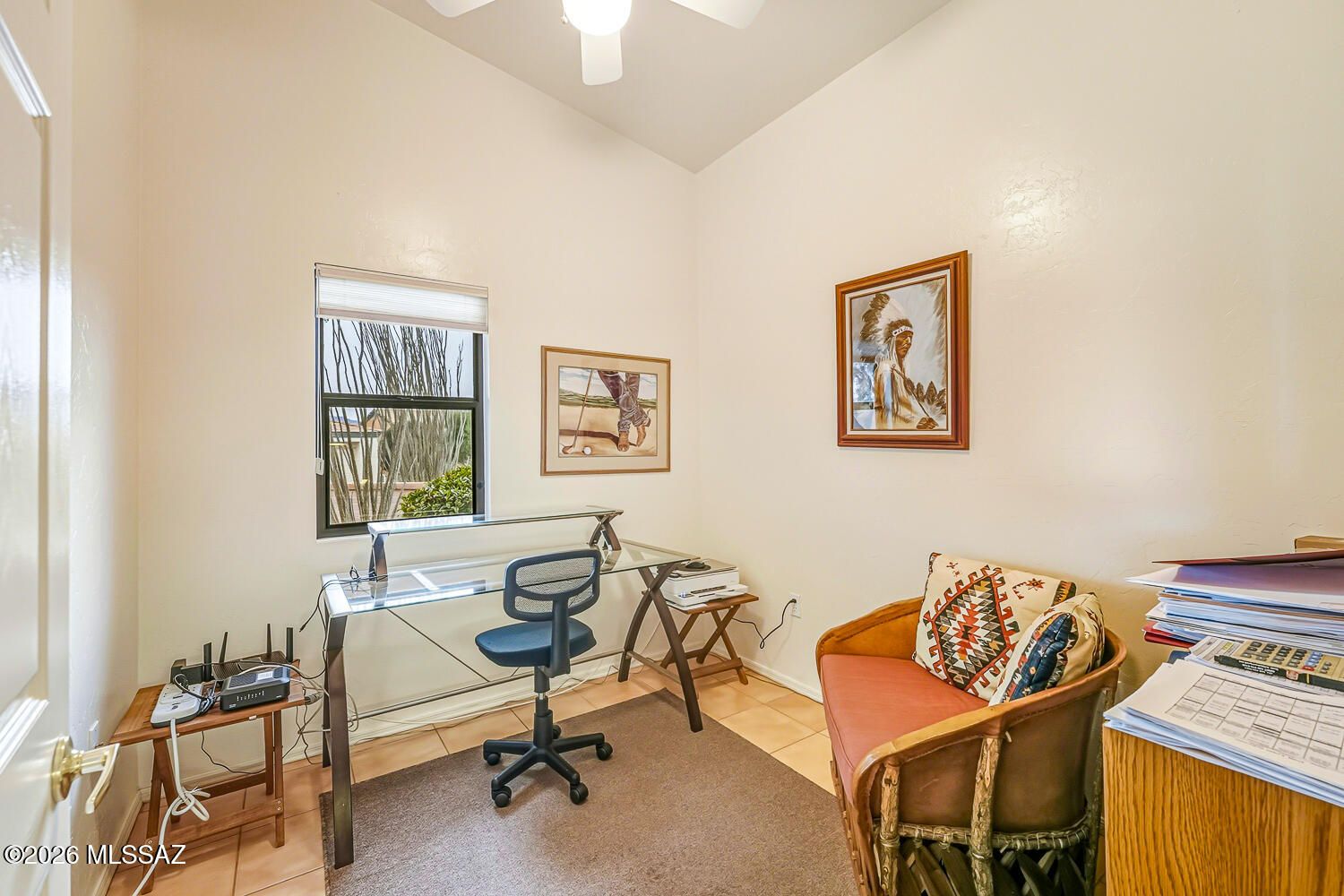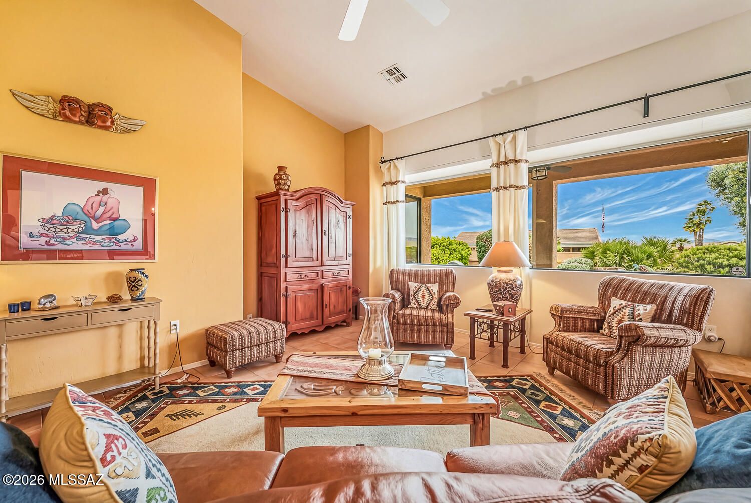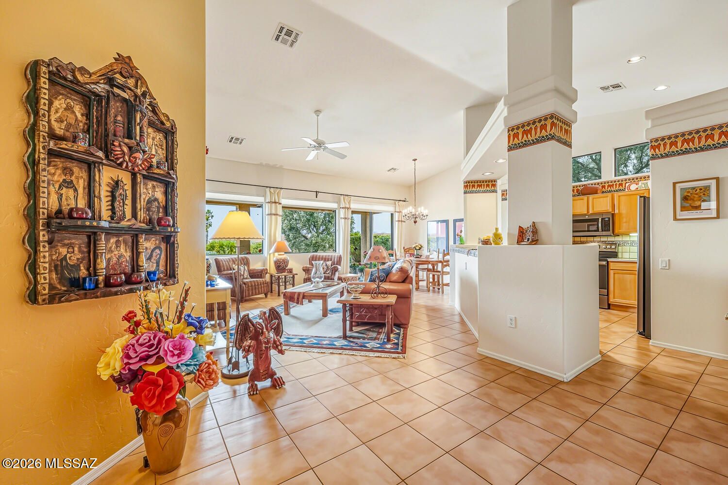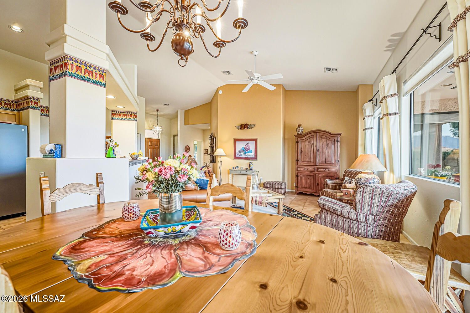 Lovely Views, Beautiful Design, and Perfect Positioning! Get ready to fall in love with this impeccably maintained home featuring 2 bedrooms, 2 bathrooms, and a flexible office space, perfectly positioned on a premium ⅓-acre corner lot in highly desirable San Ignacio Vistas. Gorgeous tile flooring, soaring ceilings, and expansive windows flood the home with natural light, creating an inviting and uplifting atmosphere throughout. The beautifully appointed kitchen features sleek quartz countertops, a charming Mexican tile backsplash and bar, modern slate appliances, and abundant cabinetry. It flows effortlessly into the great room and dining area, where a romantic chandelier adds character and ambiance, ideal for entertaining friends or enjoying quiet evenings at home. Wake up to mount