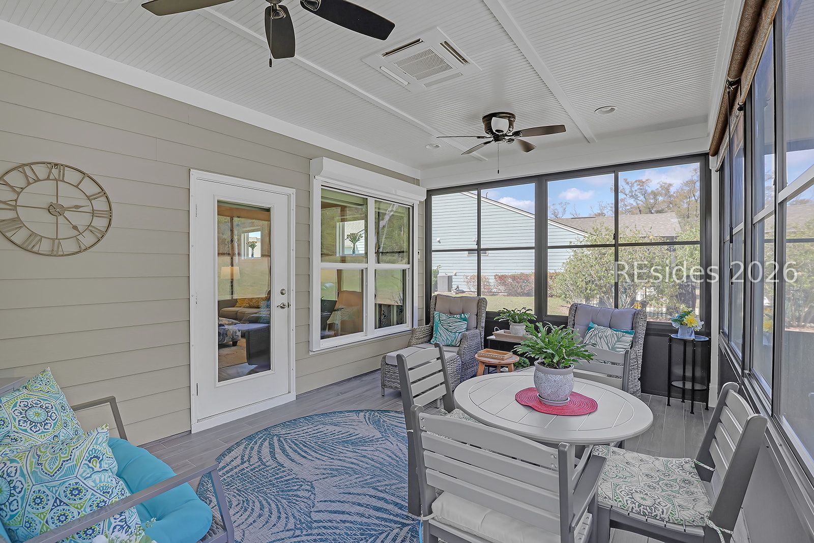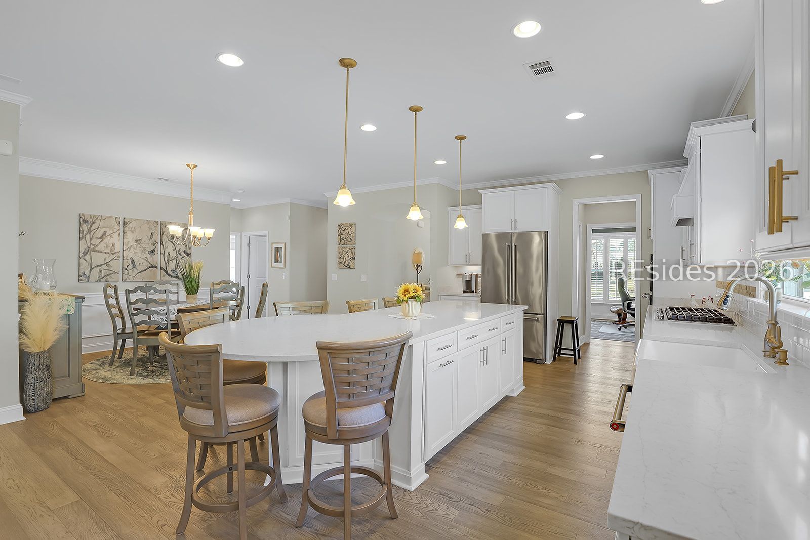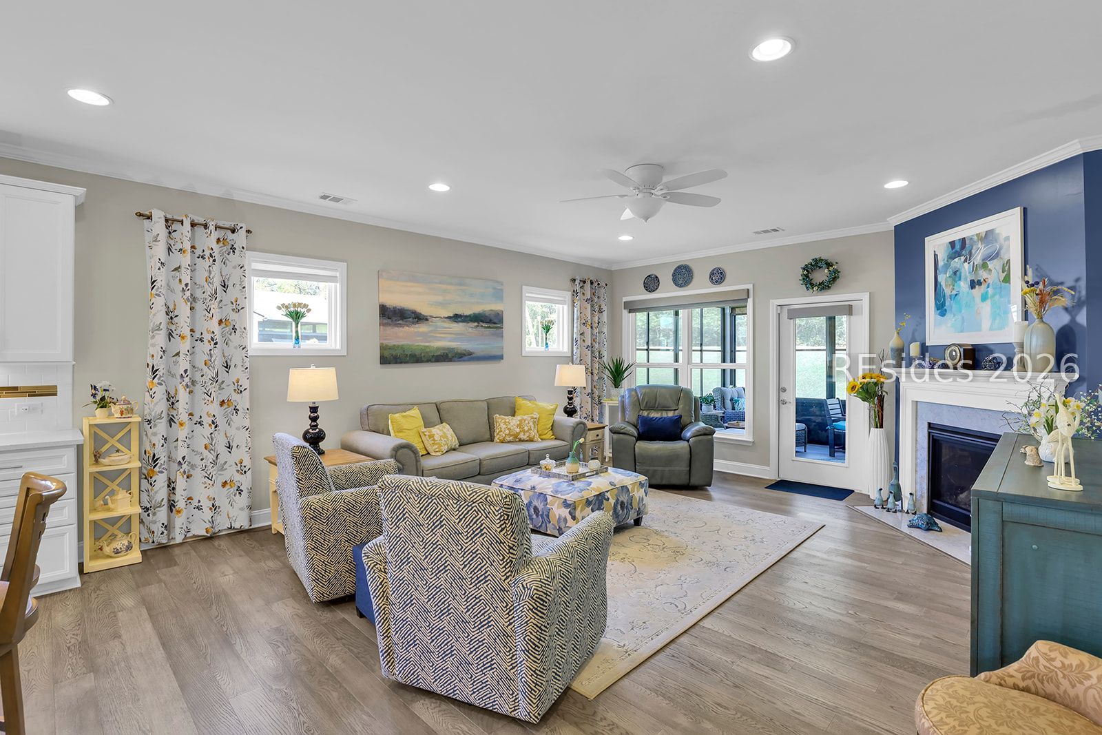 Located on one of the friendliest streets in The Haven, a vibrant 55+ community of just 500 homes, this beautifully appointed residence offers the perfect blend of comfort, convenience, and active lifestyle living with amenities to keep you as busy as you wish. Designed with both everyday living and hosting in mind, this home features 3 bedrooms plus a library, providing ideal accommodations for guests or flexible living space. At the heart of the home, the chef-inspired kitchen showcases stunning white-veined quartz countertops, stainless KitchenAid appliances, white cabinetry, and a generous center island with abundant seating, making it the natural gathering place for family and friends. The spacious great room features a cozy gas fireplace and flows seamlessly into a dining area large enough to accommodate a full dining suite-perfect for entertaining. Enjoy year-round Lowcountry outdoor living on the screened porch with vinyl sliding windows and its own mini-split heating and air system, creating a comfortable retreat in every season. The primary suite offers a luxurious oversized tiled shower, double vanities, and a customized walk-in closet, providing both style and function. This thoughtfully designed home also includes an impressive list of upgrades and convenience features, including permanent stairs to a floored walk-in attic for over-garage storage, customized pantry and storage room, a 22KW Generac generator, roll-down hurricane shutters, plantation shutters, and an air-purifier ionizer system. A wonderful opportunity to enjoy Lowcountry living in one of the area's most welcoming active adult communities.