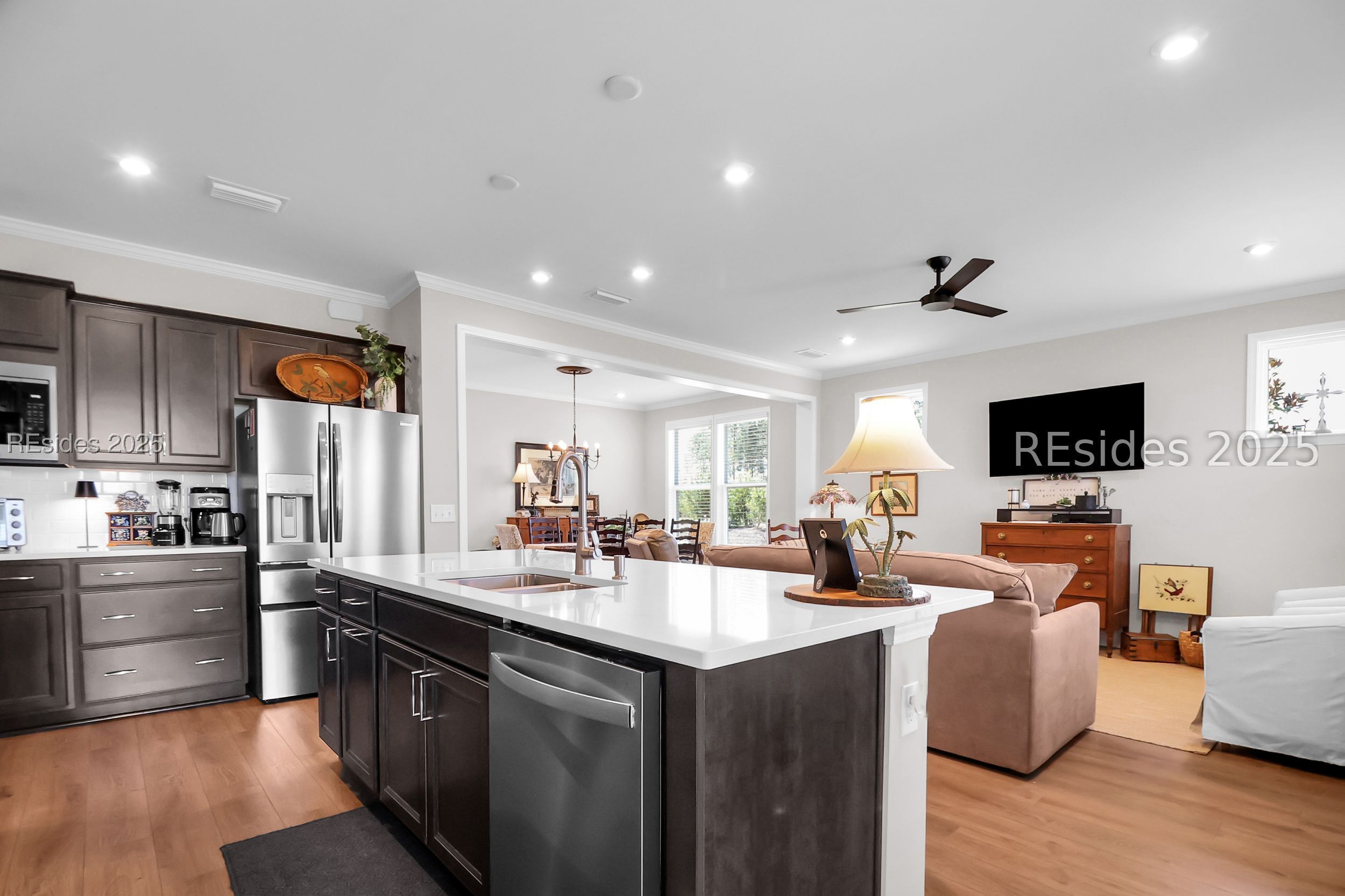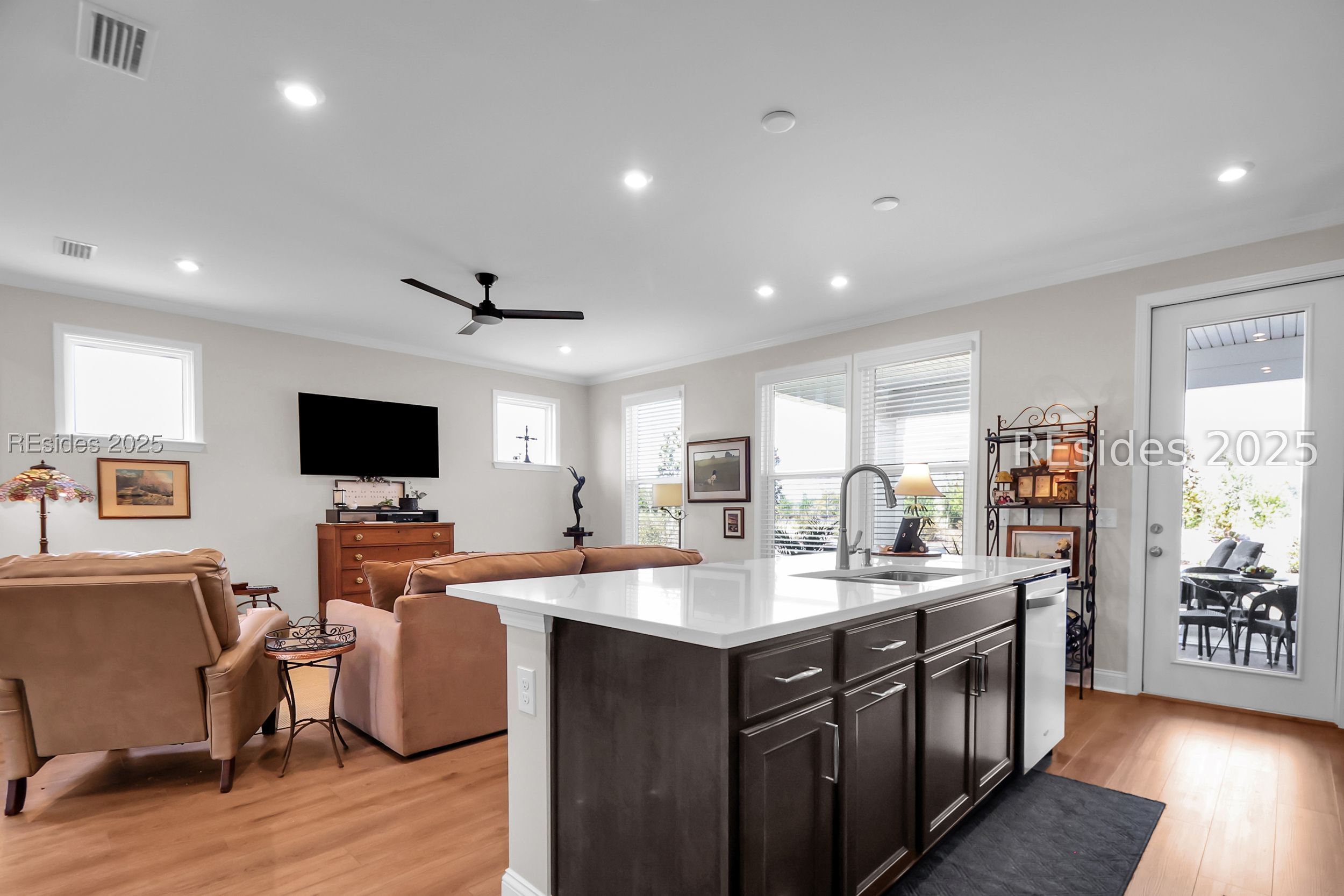 Welcome to the new Sun City West Duet Neighborhood of Fishery Bluff! Available NOW is an "almost new" Ellenton model, designed for seamless flow from foyer to a well-appointed kitchen: modern " charcoal color" maple cabinetry with pull out shelves, subway tile backsplash, bright quartz countertops, 8' of island prep space, serving or seating. A separate dining area is perfect for more formal entertaining, all rooms are tastefully accented by crown molding and 5 1/4 " baseboards. Extra light packages provide more comfortable living. LVP flooring throughout is complemented by tile in the bathrooms and laundry - a room that offers extra workspace or storage. Walk-in closets in both bedrooms AND hall are a bonus! Pantry offers 20 linear ft of storage. In addition to $38K in builder upgrades are shelving added to closets, garage and floored attic, accessible by pull down stairs. A final touch to the 2-car garage is the Penntek Flake Flooring, 4x stronger than epoxy. Enjoy the 16' x 19' "Privacy from Neighbors" outdoor living space, a short walk to work out or enjoy an indoor / outdoor swim? Motivated Seller due to health reasons!! Correct Taxes 2025 are $4342