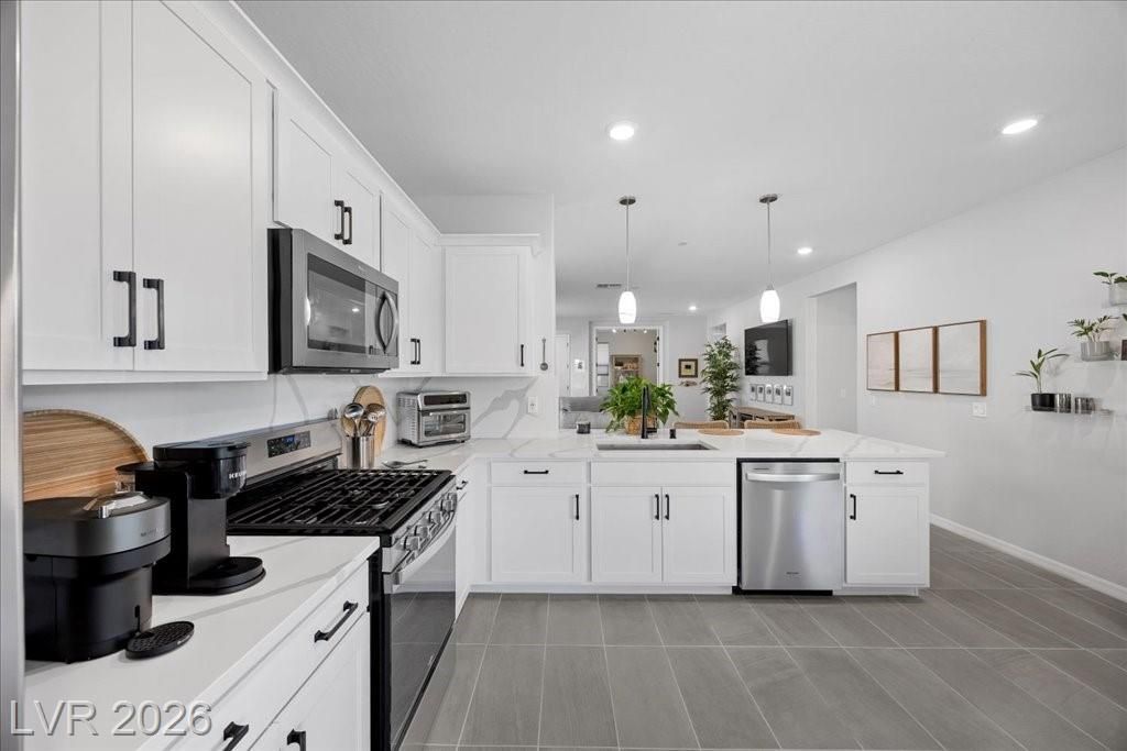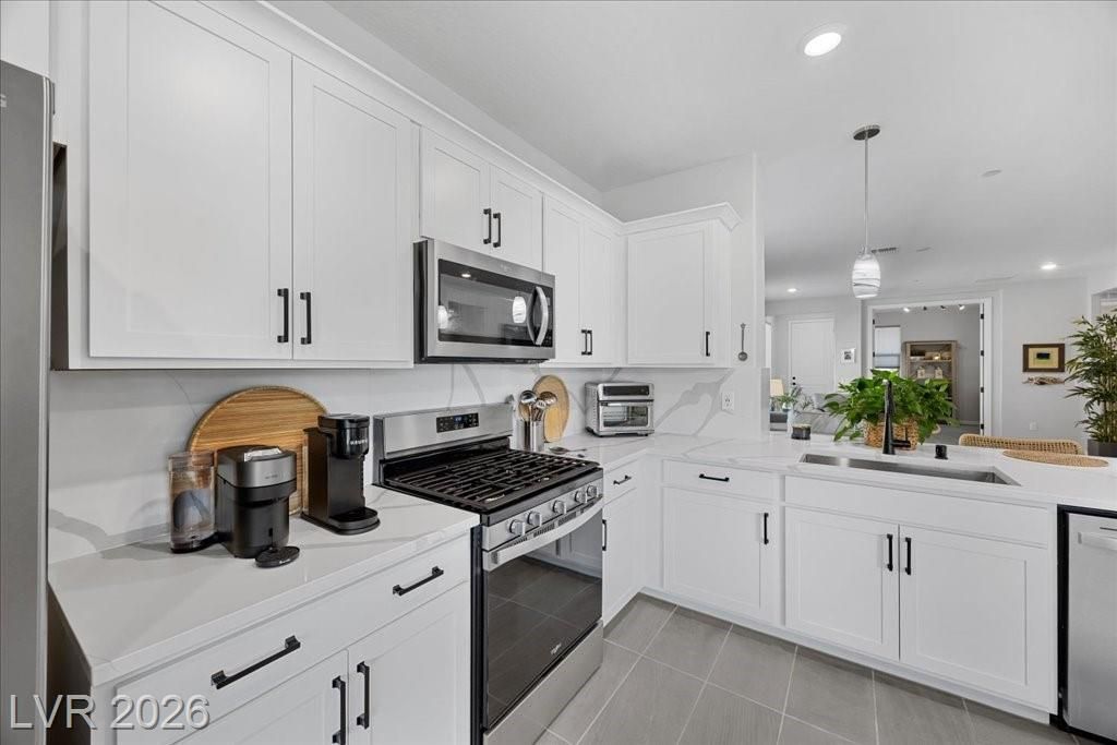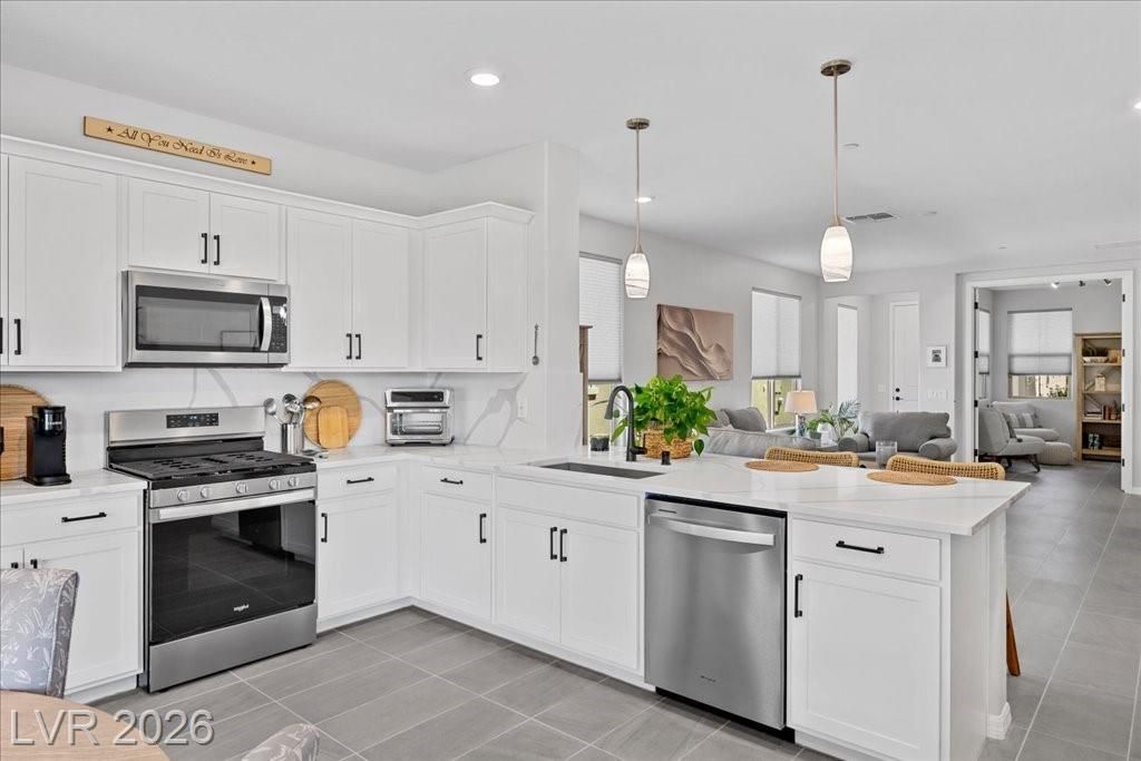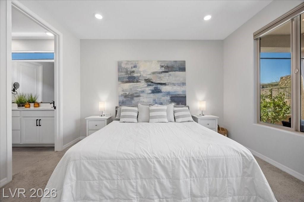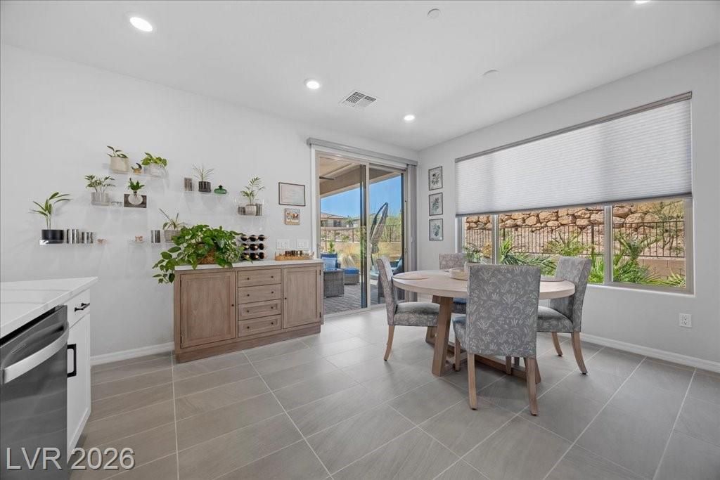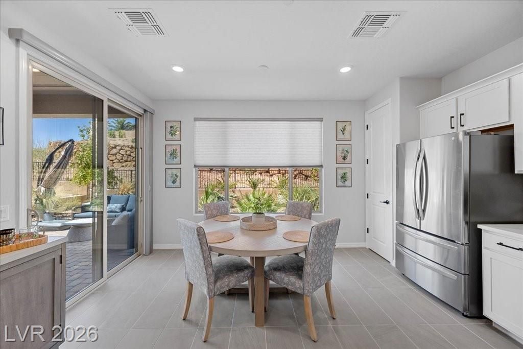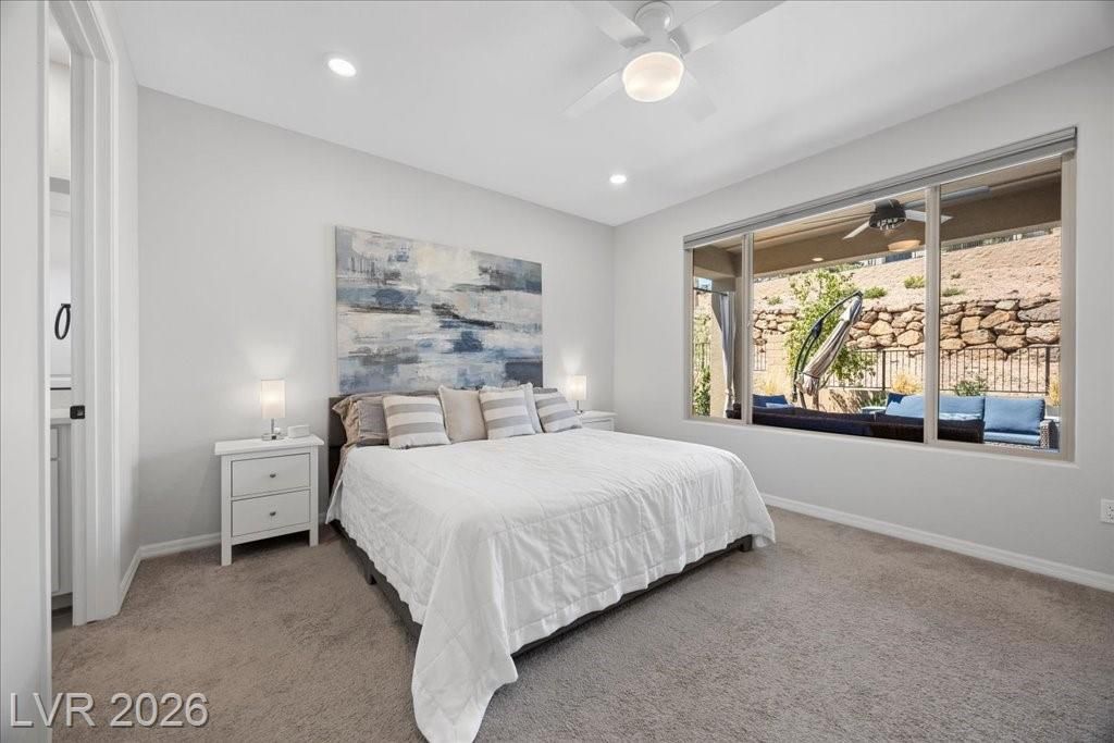 Live in the award-winning Del Webb community of Lake Las Vegas! This stunning newer home has been meticulously cared for and decorated like a model. Premium location with no neighbors directly behind, plus beautiful mountain views. Enjoy a fenced in tropical backyard with lush landscaping and custom lighting for the perfect evening ambiance. Bright open floor plan with soaring ceilings, abundant windows, and natural light. Modern tile flooring throughout main living areas carpet in bedrooms. Upgraded kitchen features quartz countertops, breakfast bar, and stainless steel appliances. Primary suite is privately separated from the secondary bedroom, with walk-in closets. Water softener filtration system, tankless water heater, and spacious laundry room with cabinets and sink. Resort-style clubhouse amenities with incredible views! This home is not to be missed as you will love to call this your home!