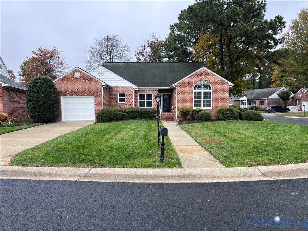 This CHARMING 2 bedroom, 2 bathroom all BRICK RANCHER with 1920 sq ft is a must see, located in the highly sought after 55+ BRAXTON Gated Community. This house offers a lovely spacious and functional OPEN floor plan, CATHEDRAL ceilings, bright natural light, Palladian Windows, FRESH PAINT, and plenty of space for entertaining or relaxing on the back Patio or the SUNROOM or by the gas fireplace. It is situated on a lovely level corner lot with PRIVACY and plenty of nature. The bright Kitchen offers a breakfast nook, new stove, refrigerator and updated countertops. New Windows throughout, a direct entry garage and a community lake available for Braxton Residents. Braxton is conveniently located off of Route 10, near Chippenham, 288, 95 and 895 for easy access to all areas of Richmond. This community is special and very friendly and a well maintained neighborhood. All appliances convey. This house and floor plan is one of the largest/best in the community and this is a rare opportunity! This home combines, comfort, peace, low maintenance and easy living surrounded by friends!