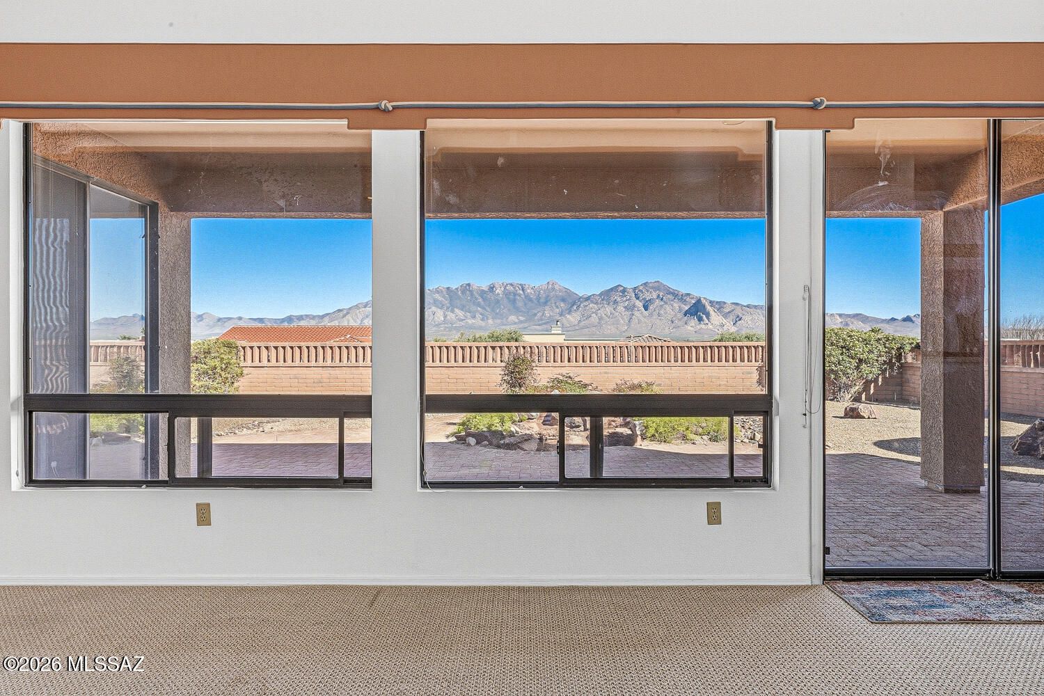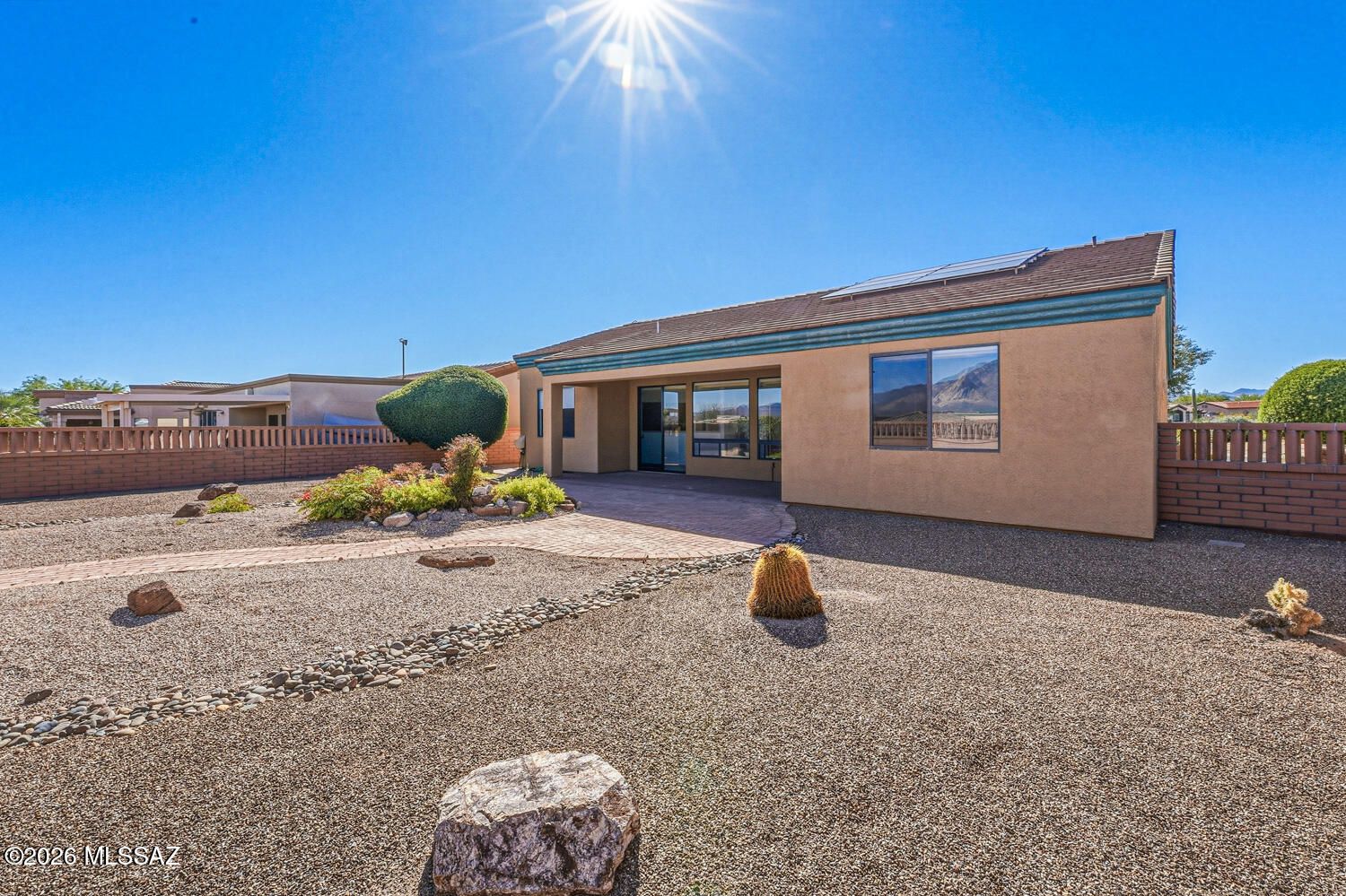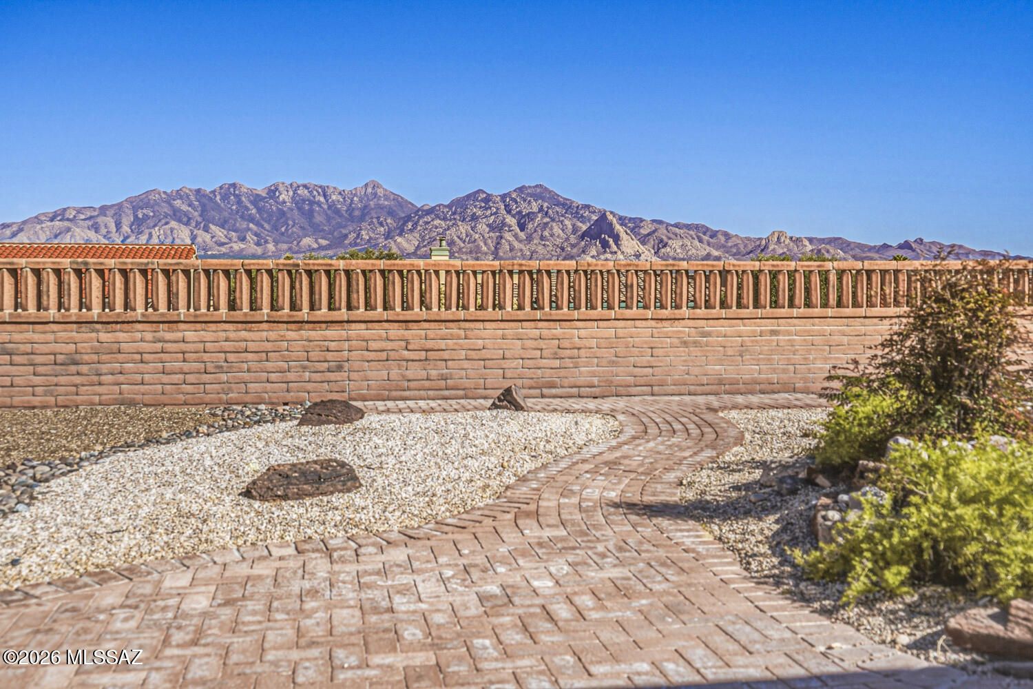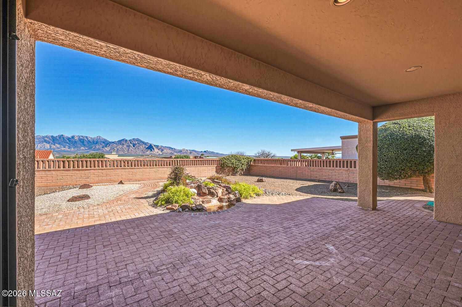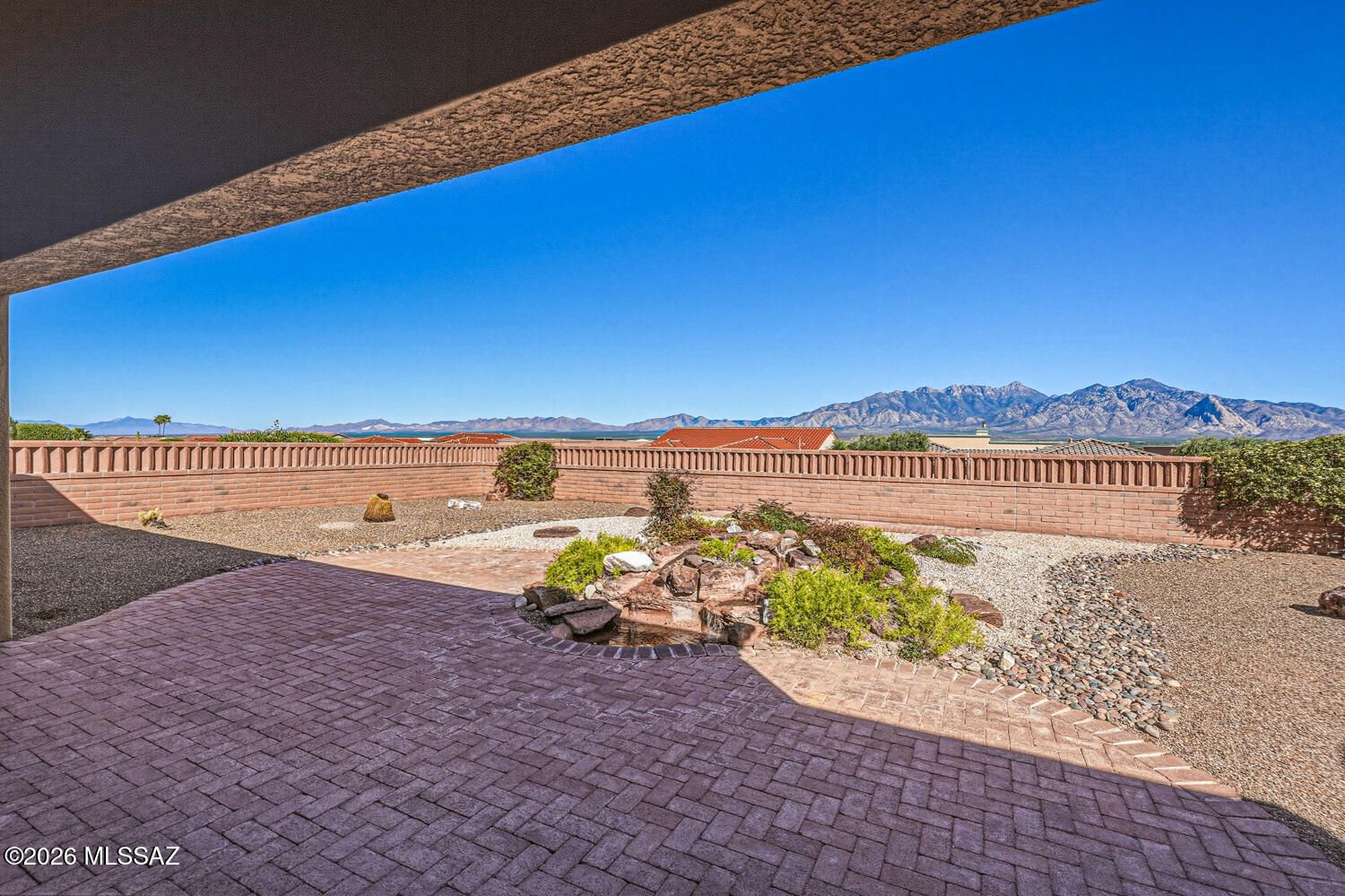 VIEWS, VIEWS, VIEWS! Stunning Mountain Views on a Premium Lot! This inviting open-concept home offers 2 bedrooms plus a versatile den and is perfectly situated on a premium lot showcasing breathtaking Santa Rita Mountain views. With 1,725 sq ft, fresh interior paint, and a newer roof (2020), the home feels bright and refreshed. The kitchen offers abundant cabinetry, a stainless steel refrigerator and large breakfast bar, flowing seamlessly into the main living areas, ideal for both everyday living and entertaining. The spacious owner's suite captures stunning mountain views and offers direct backyard access through sliding doors. The ensuite bath includes dual sinks, a garden tub, separate shower, and a walk-in closet. A flexible den with double doors and plantation shutters provides the