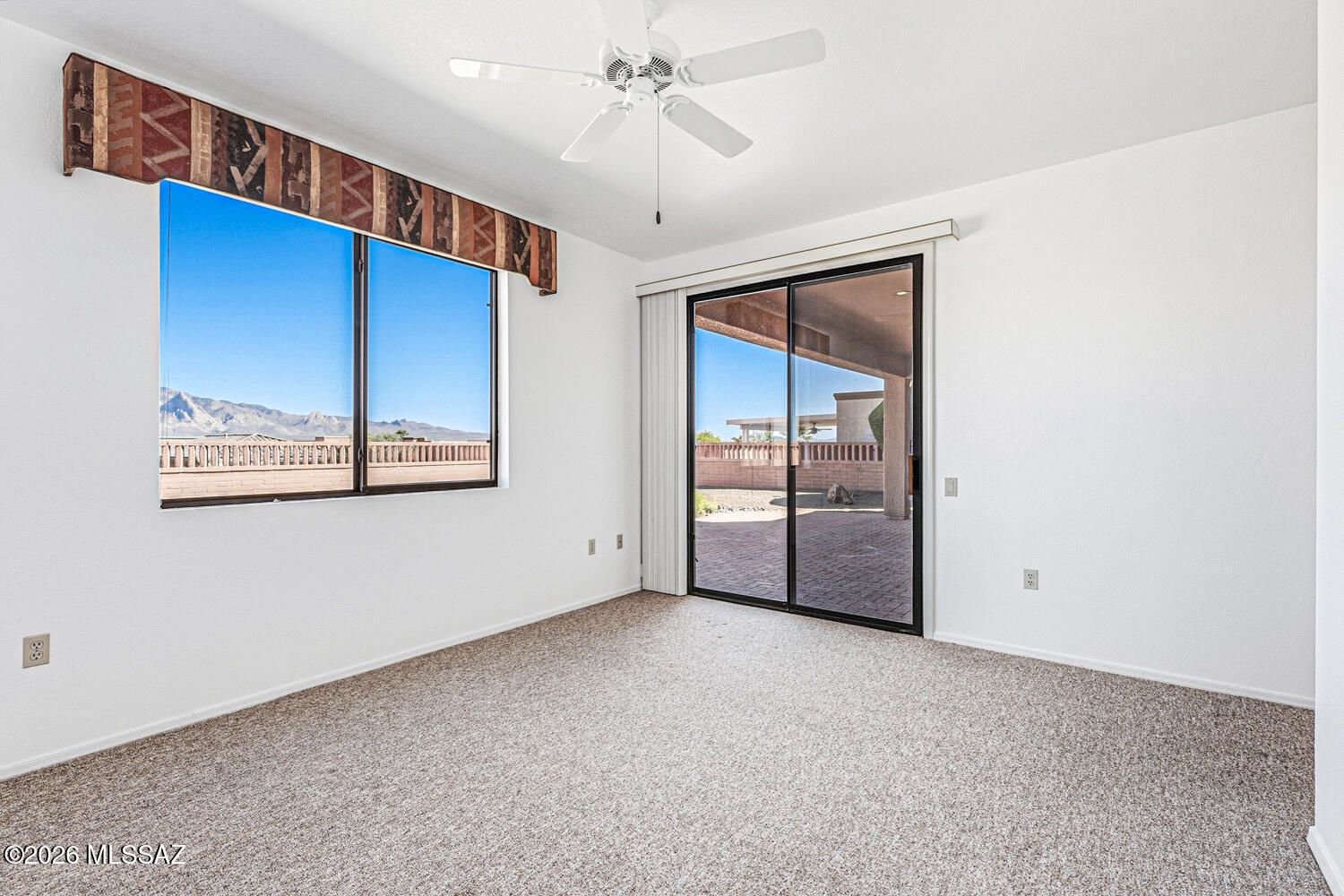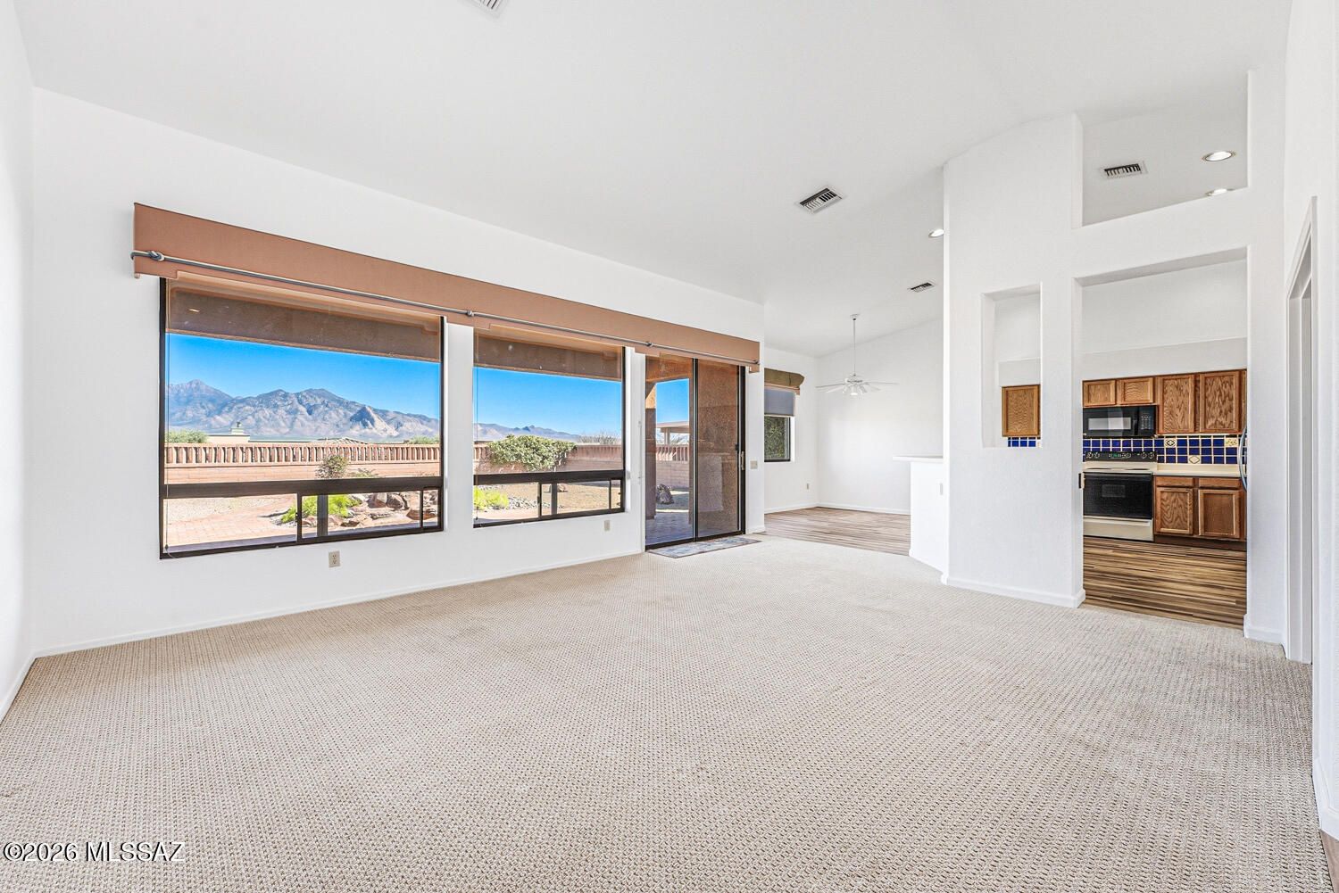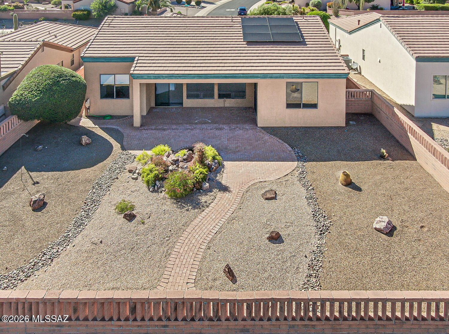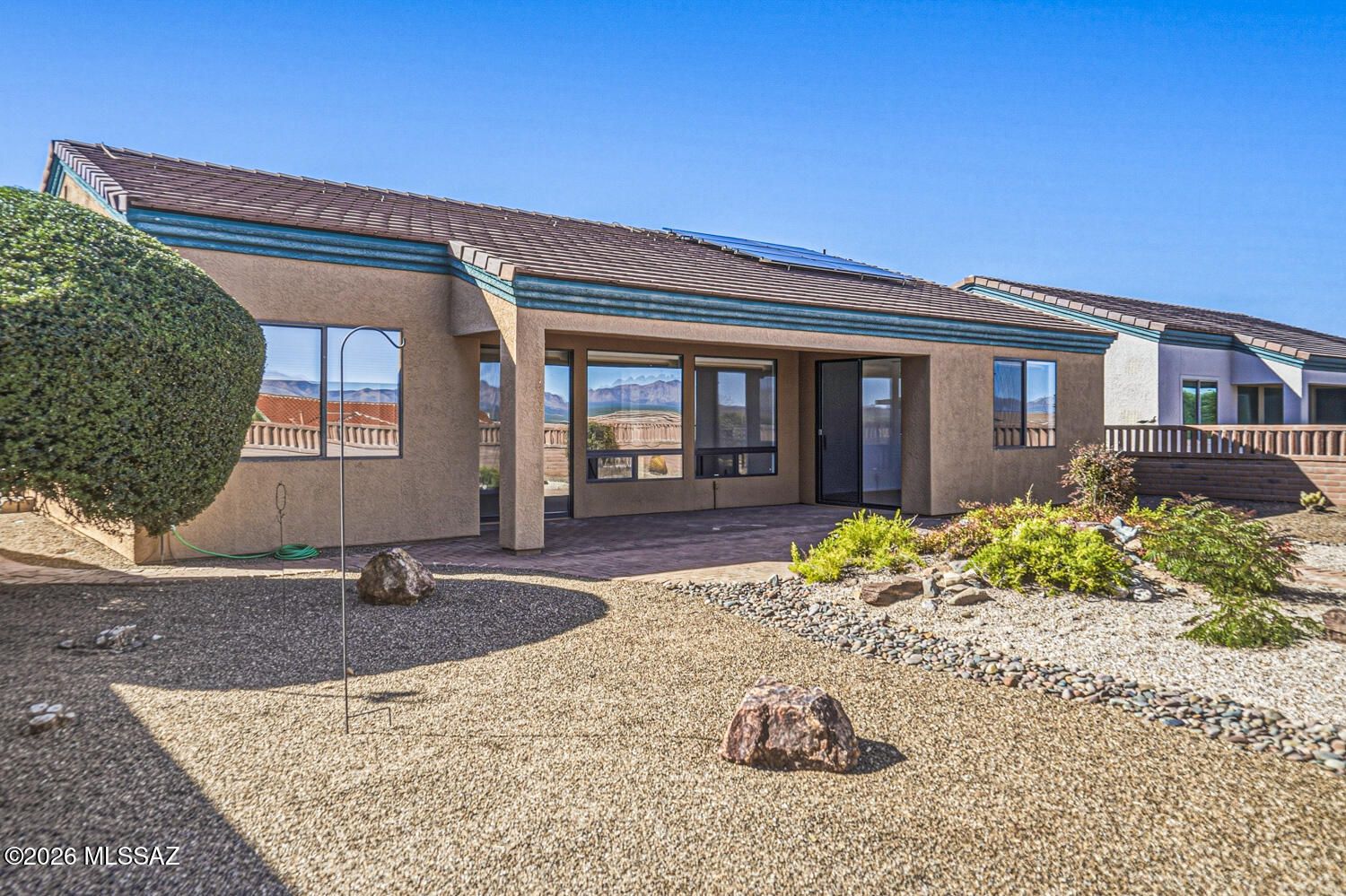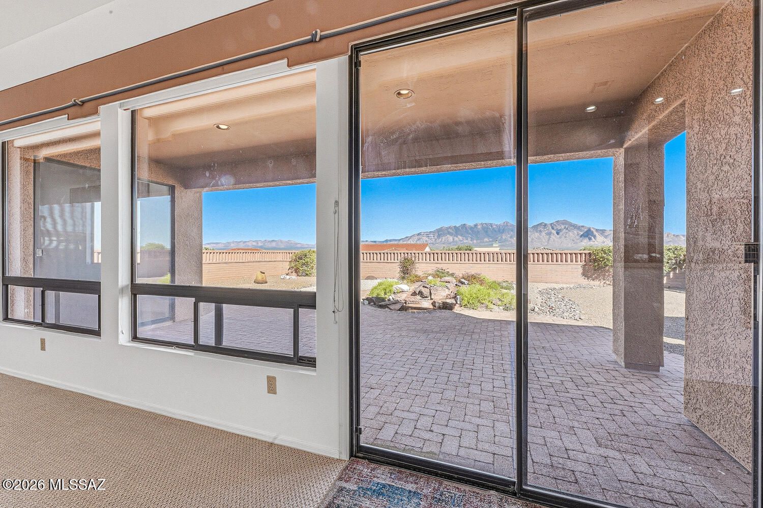 VIEWS, VIEWS, VIEWS! Stunning Mountain Views on a Premium Lot! This inviting open-concept home offers 2 bedrooms plus a versatile den and is perfectly situated on a premium lot showcasing breathtaking Santa Rita Mountain views. With 1,725 sq ft, fresh interior paint, and a newer roof (2020), the home feels bright and refreshed. The kitchen offers abundant cabinetry, a stainless steel refrigerator and large breakfast bar, flowing seamlessly into the main living areas, ideal for both everyday living and entertaining. The spacious owner's suite captures stunning mountain views and offers direct backyard access through sliding doors. The ensuite bath includes dual sinks, a garden tub, separate shower, and a walk-in closet. A flexible den with double doors and plantation shutters provides the