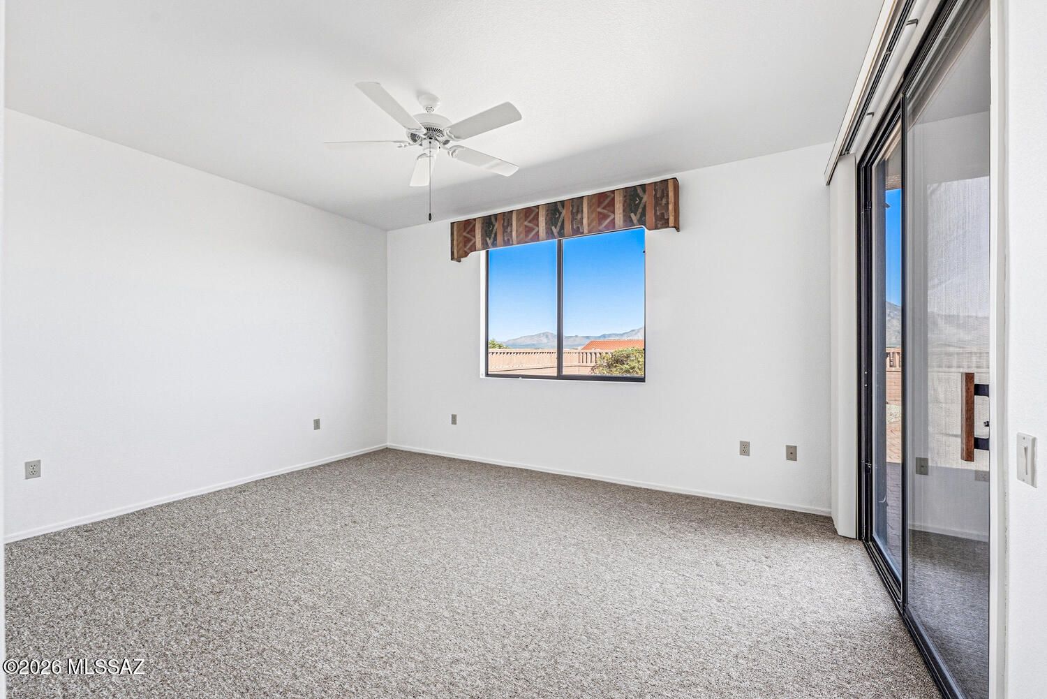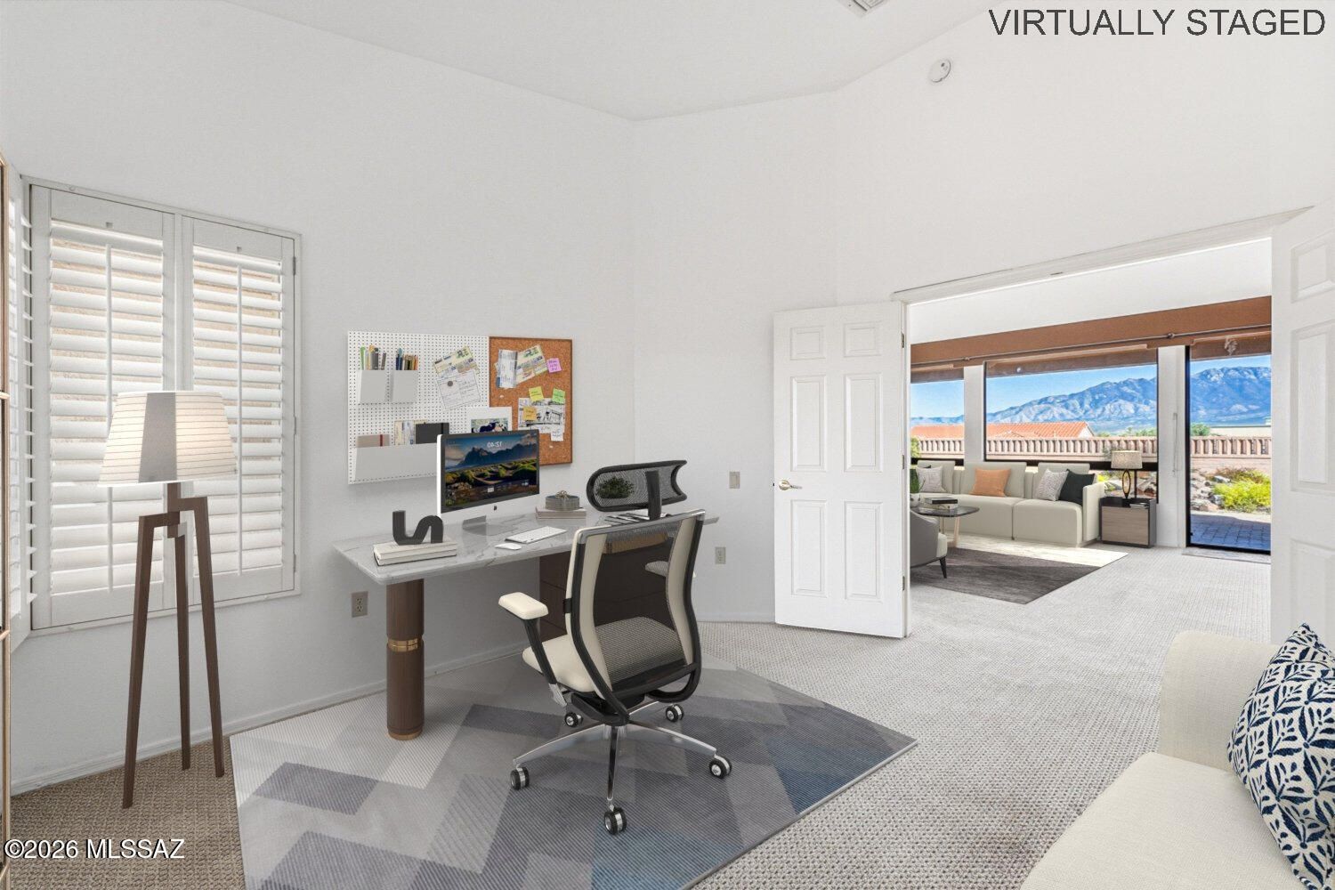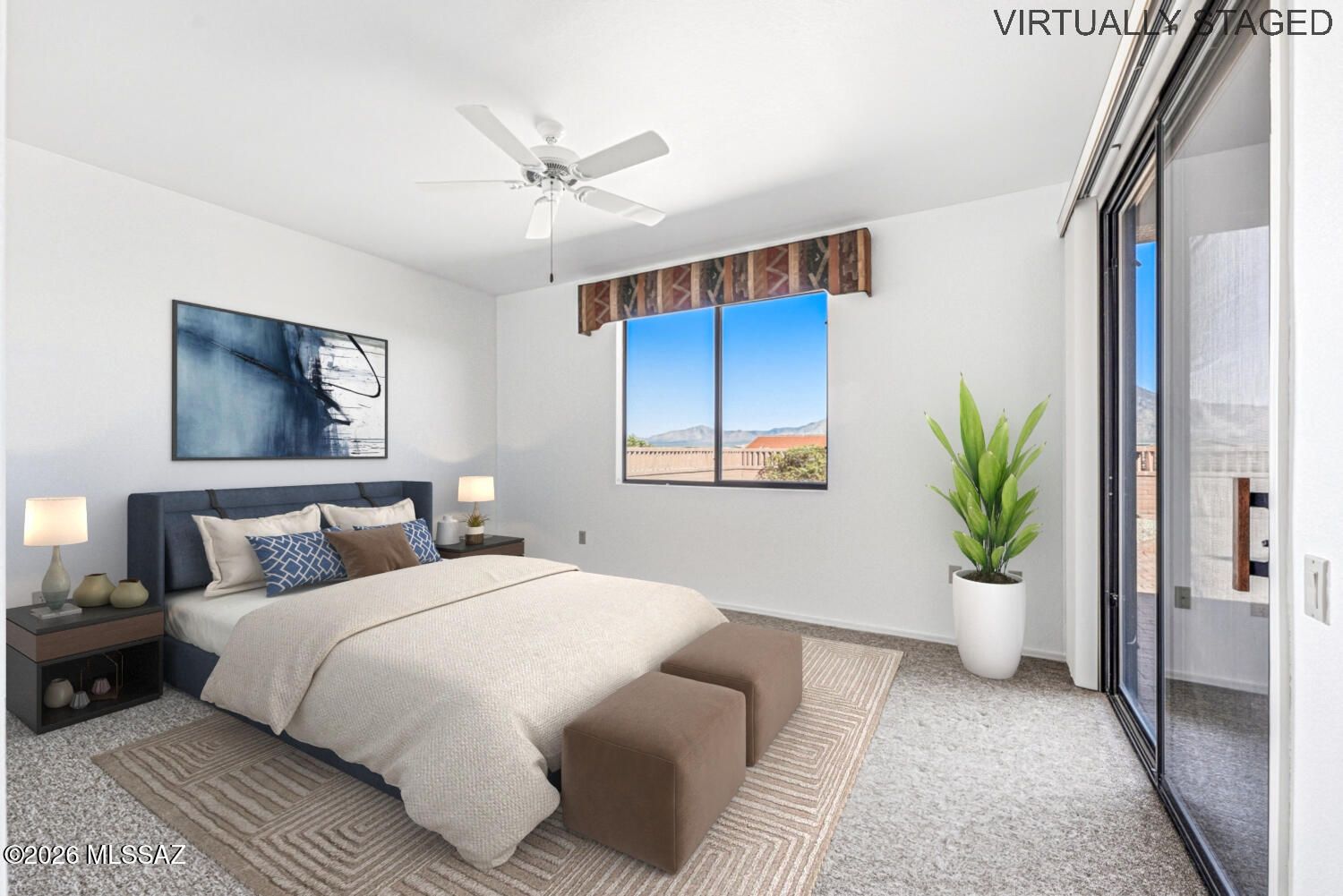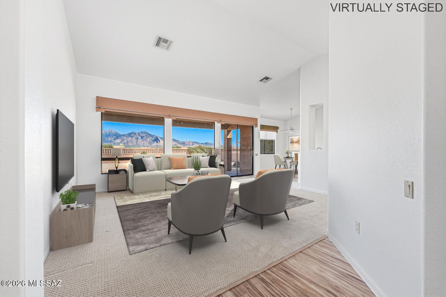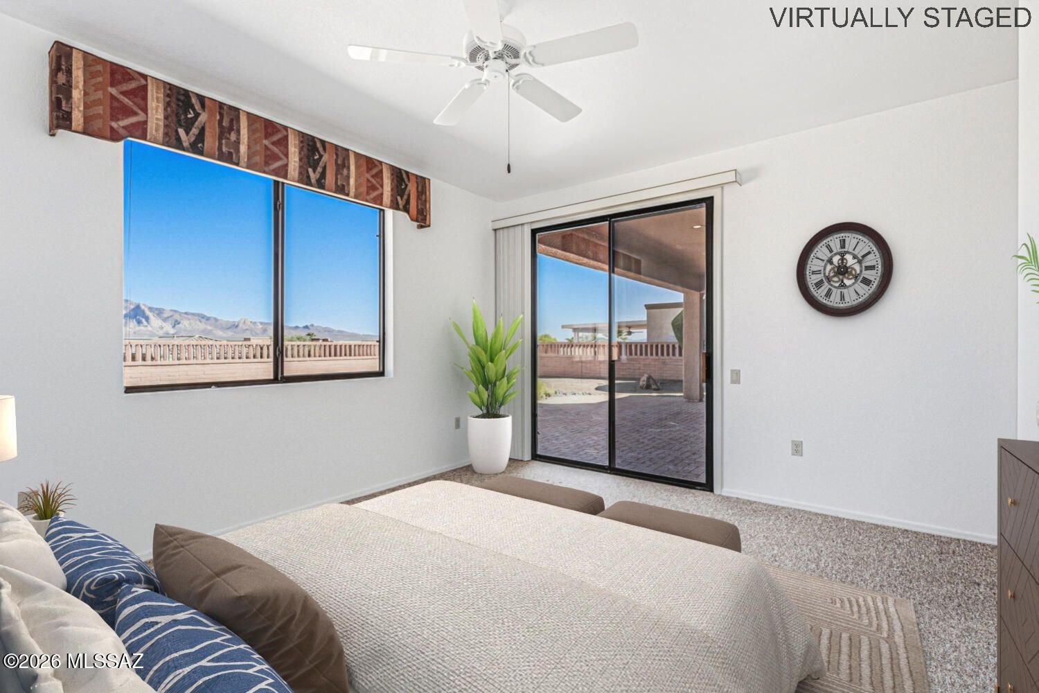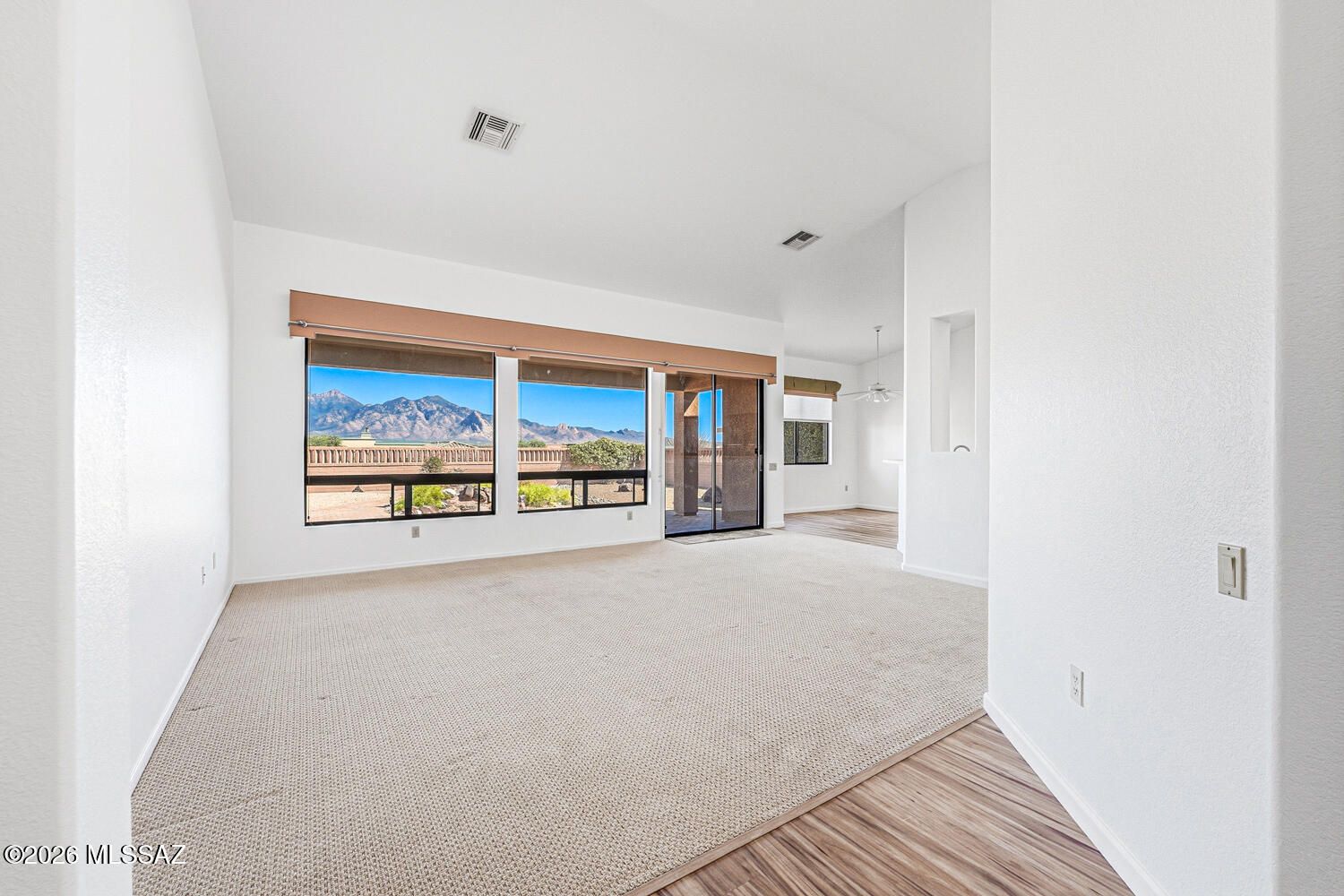 VIEWS, VIEWS, VIEWS! Stunning Mountain Views on a Premium Lot! This inviting open-concept home offers 2 bedrooms plus a versatile den and is perfectly situated on a premium lot showcasing breathtaking Santa Rita Mountain views. With 1,725 sq ft, fresh interior paint, and a newer roof (2020), the home feels bright and refreshed. The kitchen offers abundant cabinetry, a stainless steel refrigerator and large breakfast bar, flowing seamlessly into the main living areas, ideal for both everyday living and entertaining. The spacious owner's suite captures stunning mountain views and offers direct backyard access through sliding doors. The ensuite bath includes dual sinks, a garden tub, separate shower, and a walk-in closet. A flexible den with double doors and plantation shutters provides the