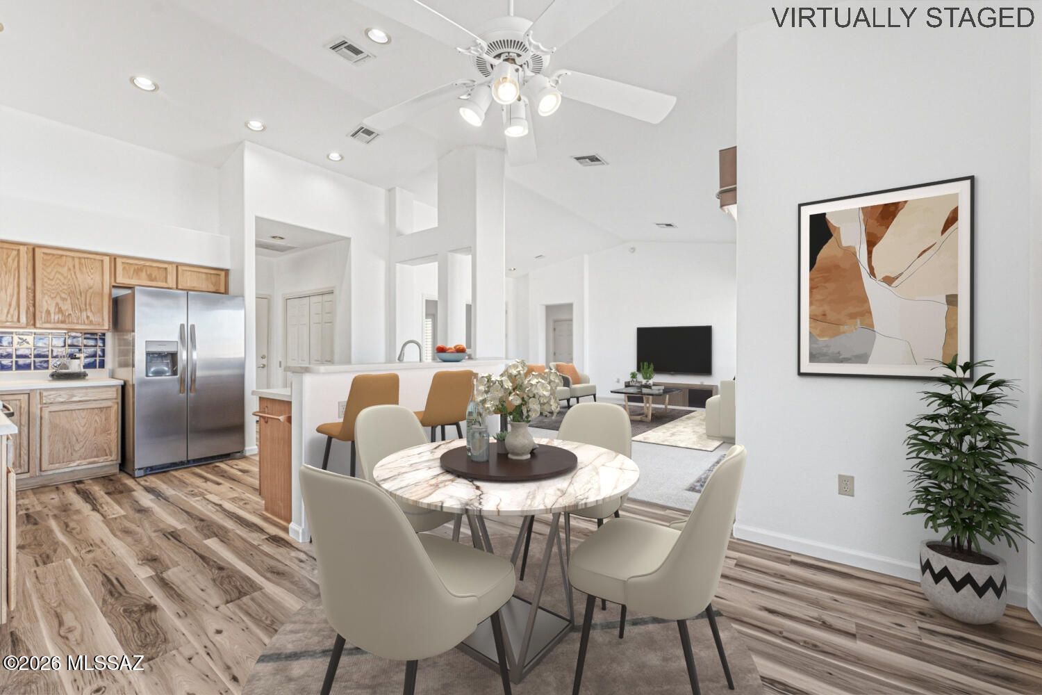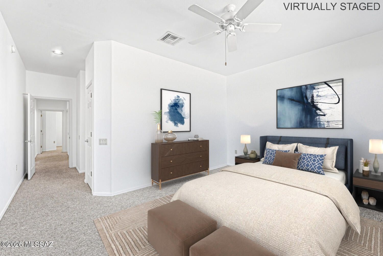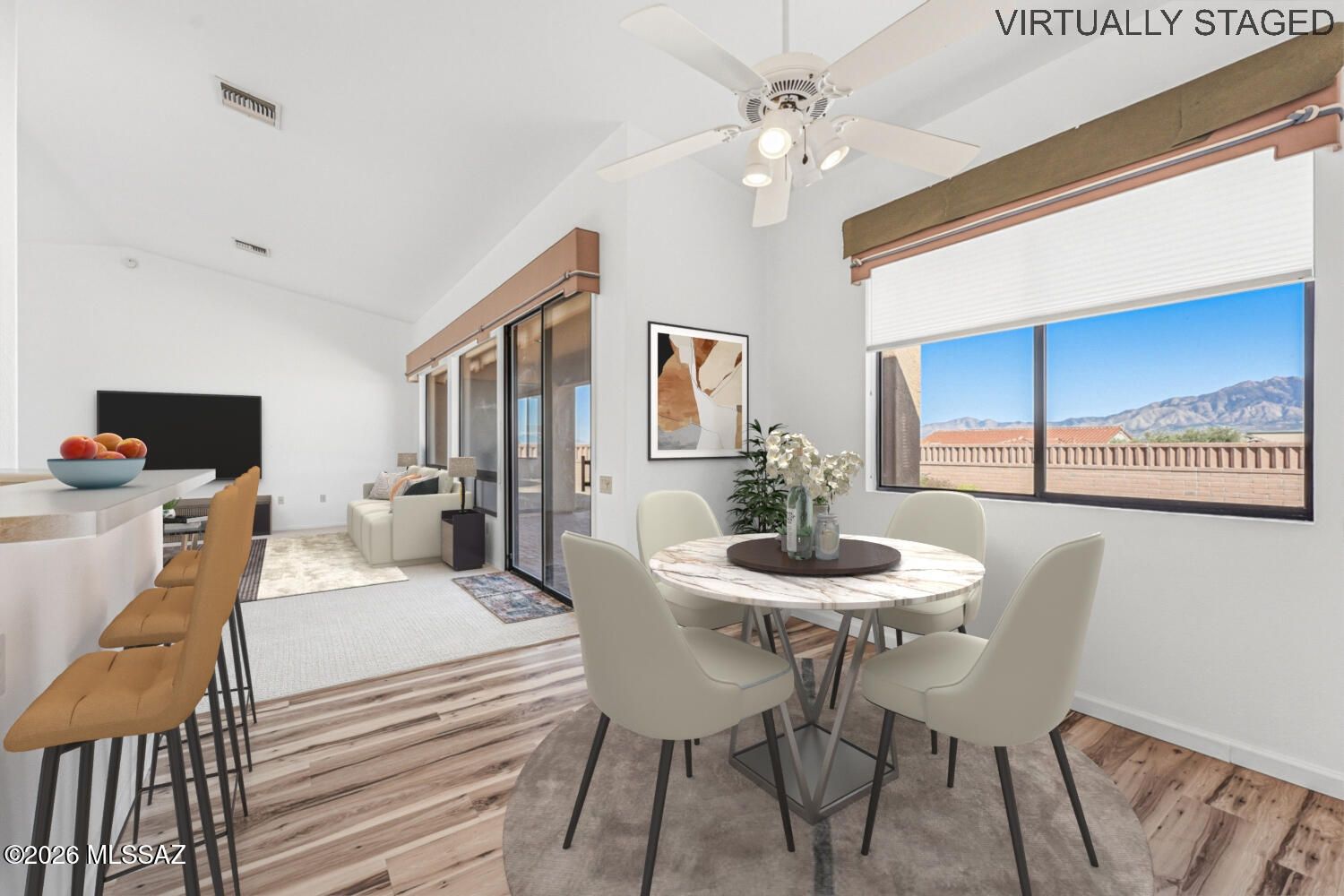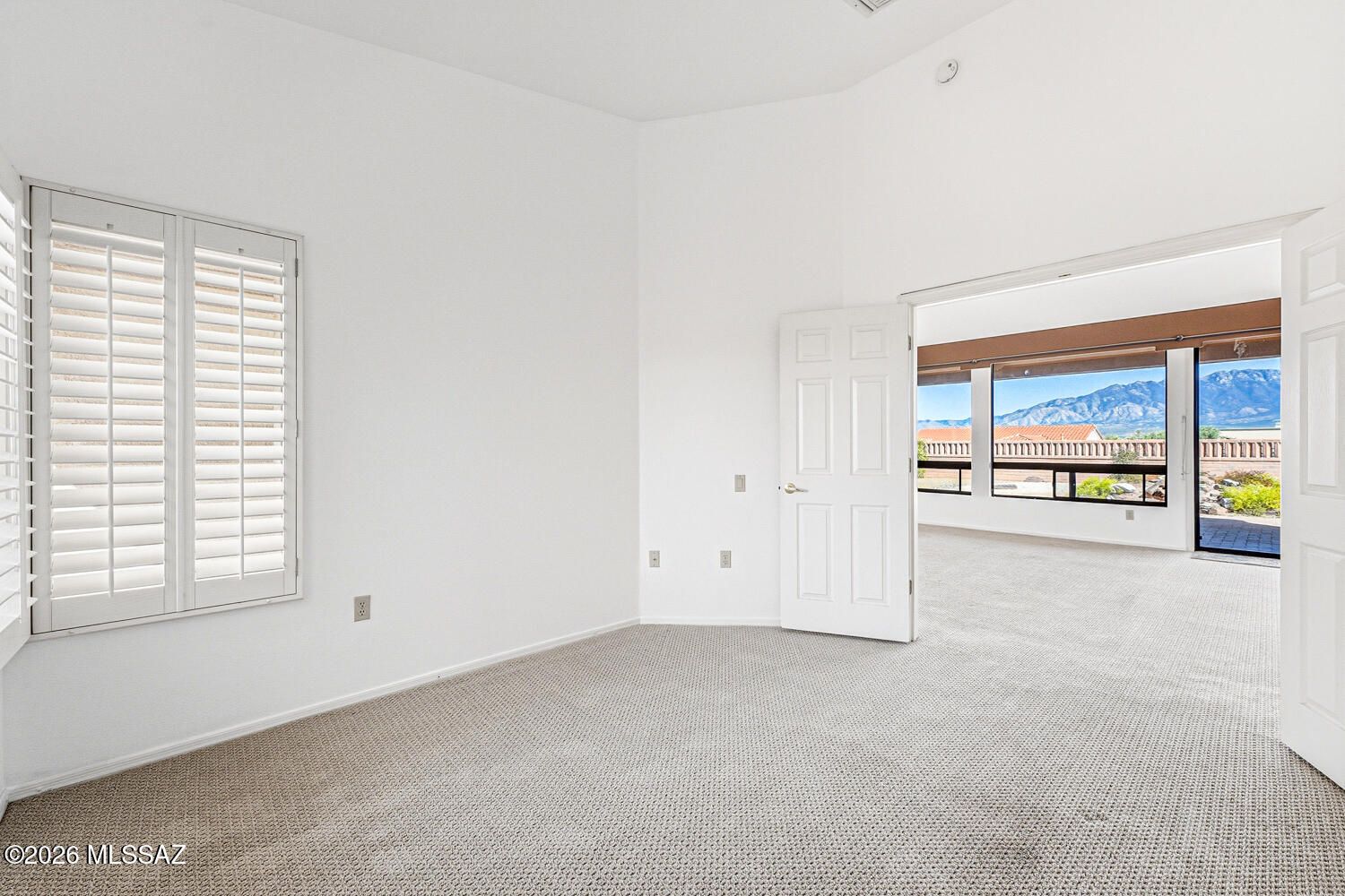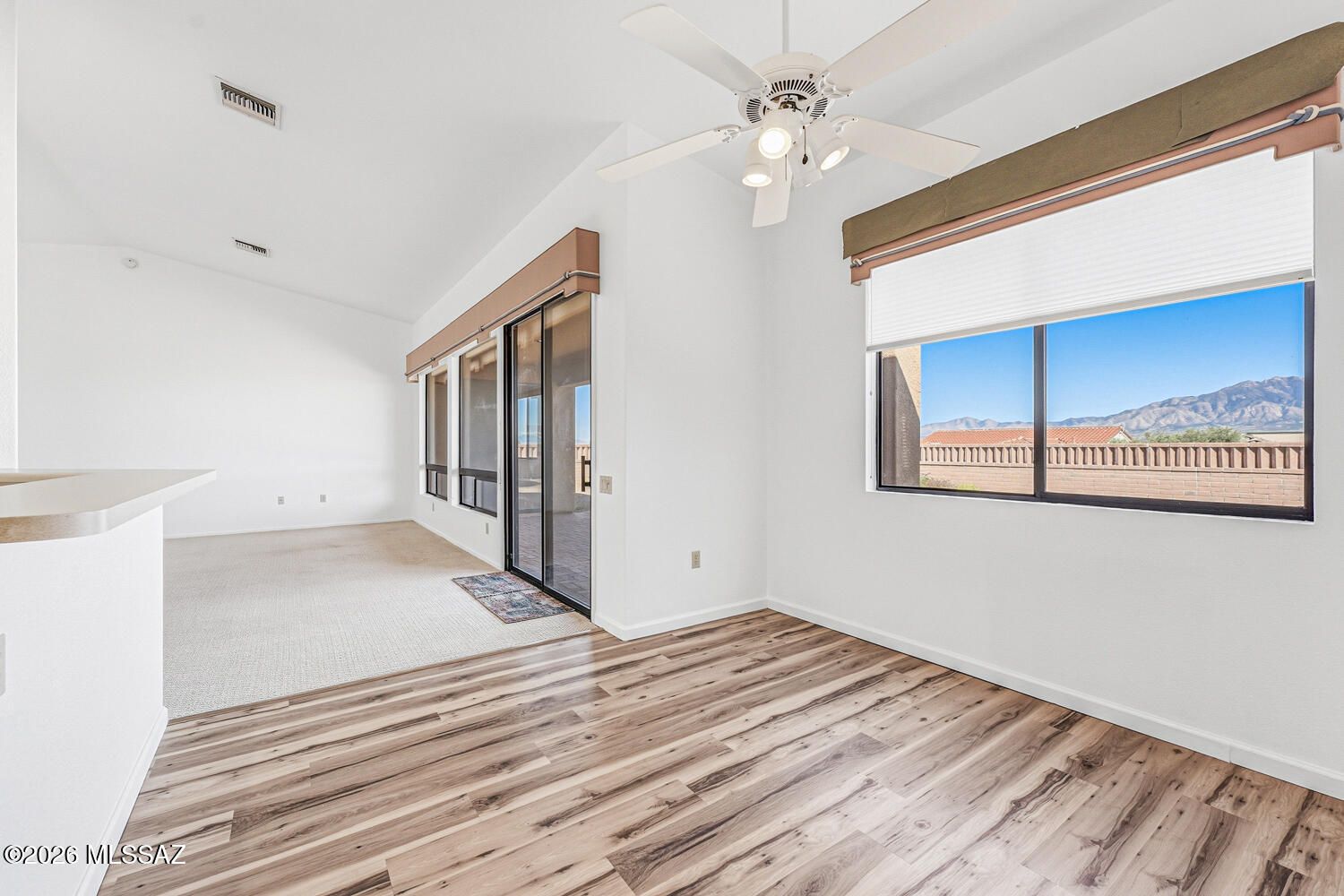VIEWS, VIEWS, VIEWS! Stunning Mountain Views on a Premium Lot! This inviting open-concept home offers 2 bedrooms plus a versatile den and is perfectly situated on a premium lot showcasing breathtaking Santa Rita Mountain views. With 1,725 sq ft, fresh interior paint, and a newer roof (2020), the home feels bright and refreshed. The kitchen offers abundant cabinetry, a stainless steel refrigerator and large breakfast bar, flowing seamlessly into the main living areas, ideal for both everyday living and entertaining. The spacious owner's suite captures stunning mountain views and offers direct backyard access through sliding doors. The ensuite bath includes dual sinks, a garden tub, separate shower, and a walk-in closet. A flexible den with double doors and plantation shutters provides the