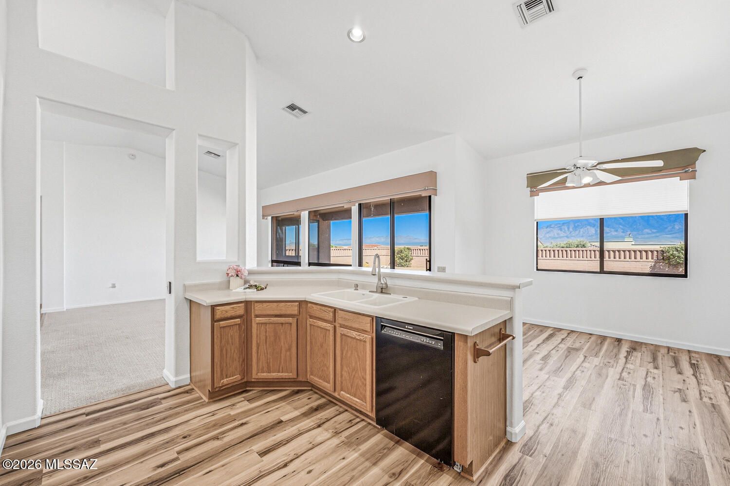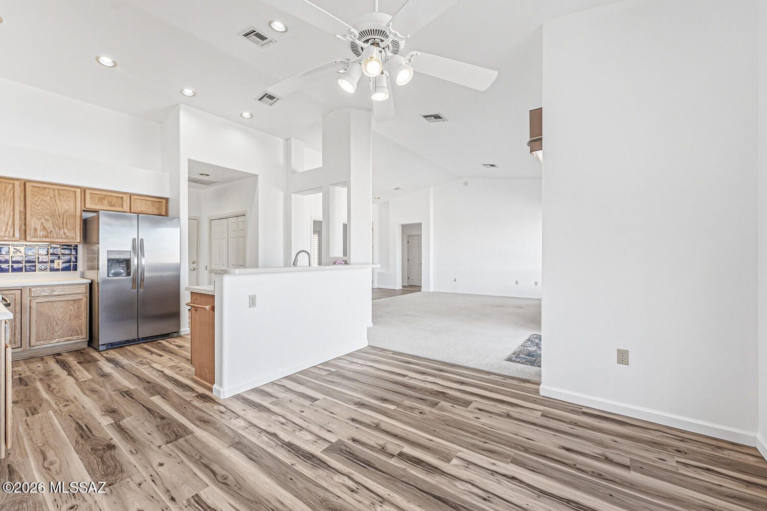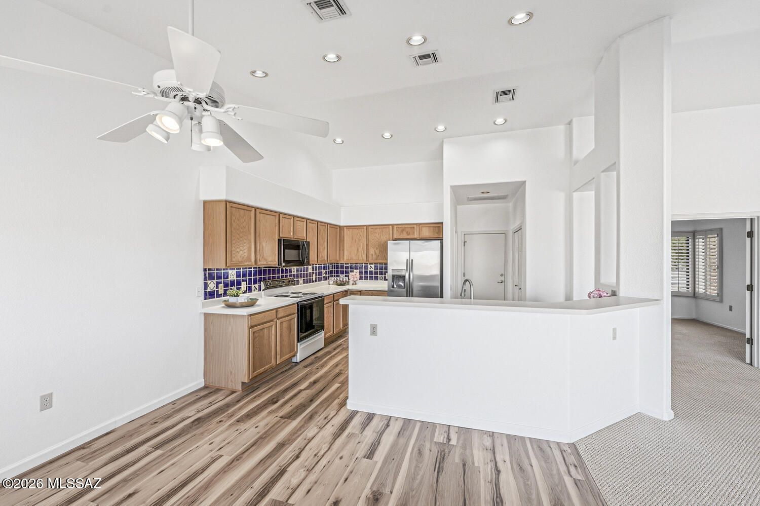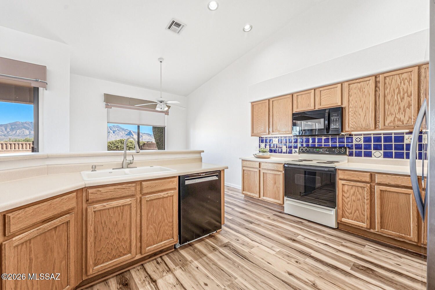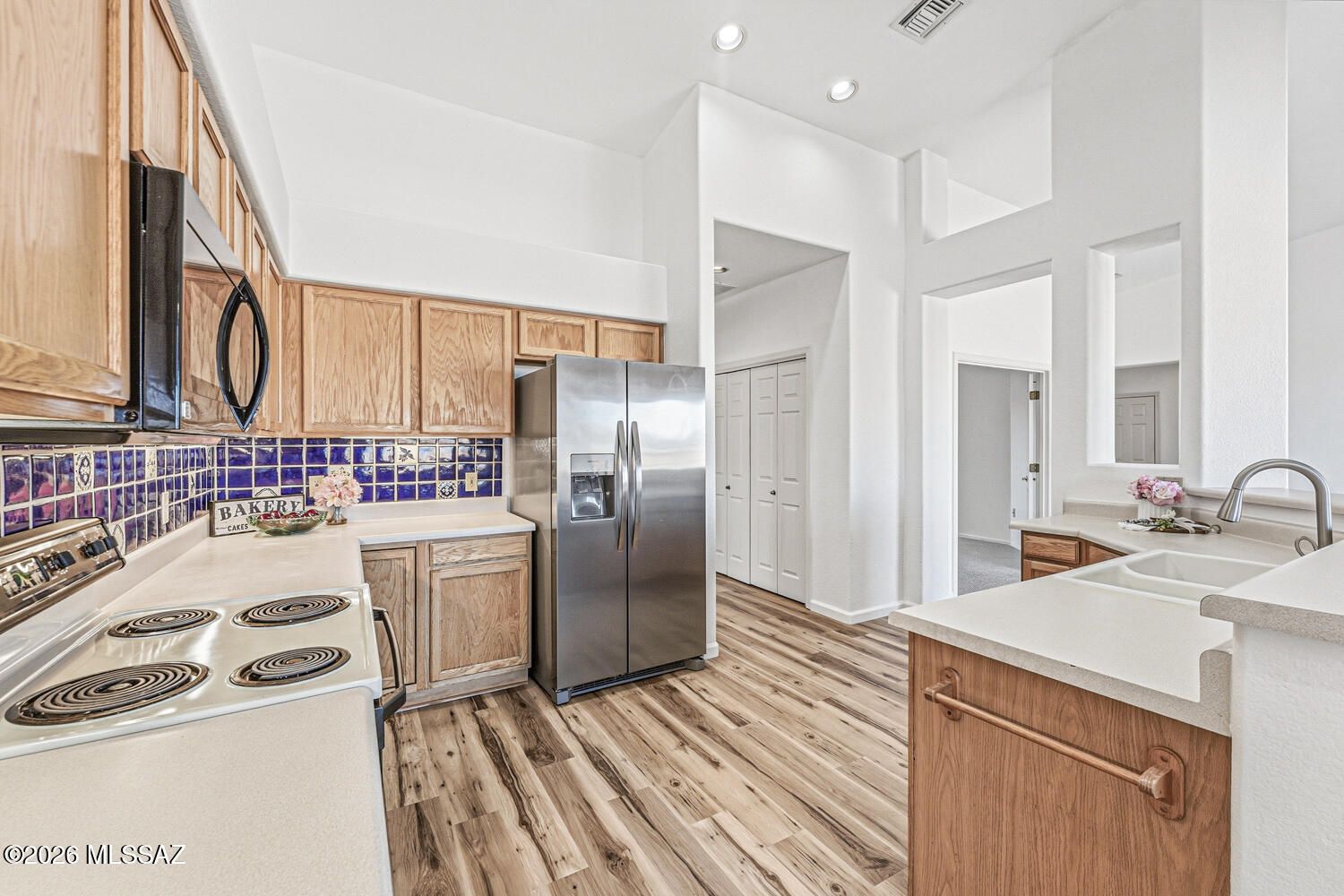 VIEWS, VIEWS, VIEWS! Stunning Mountain Views on a Premium Lot! This inviting open-concept home offers 2 bedrooms plus a versatile den and is perfectly situated on a premium lot showcasing breathtaking Santa Rita Mountain views. With 1,725 sq ft, fresh interior paint, and a newer roof (2020), the home feels bright and refreshed. The kitchen offers abundant cabinetry, a stainless steel refrigerator and large breakfast bar, flowing seamlessly into the main living areas, ideal for both everyday living and entertaining. The spacious owner's suite captures stunning mountain views and offers direct backyard access through sliding doors. The ensuite bath includes dual sinks, a garden tub, separate shower, and a walk-in closet. A flexible den with double doors and plantation shutters provides the