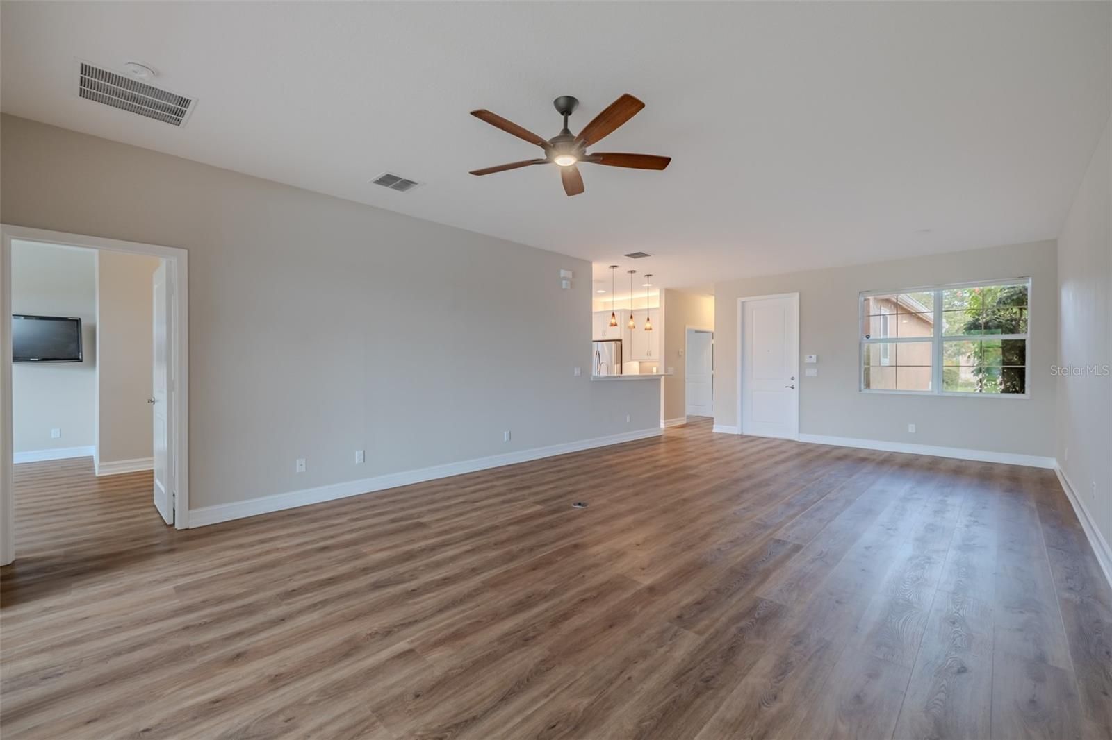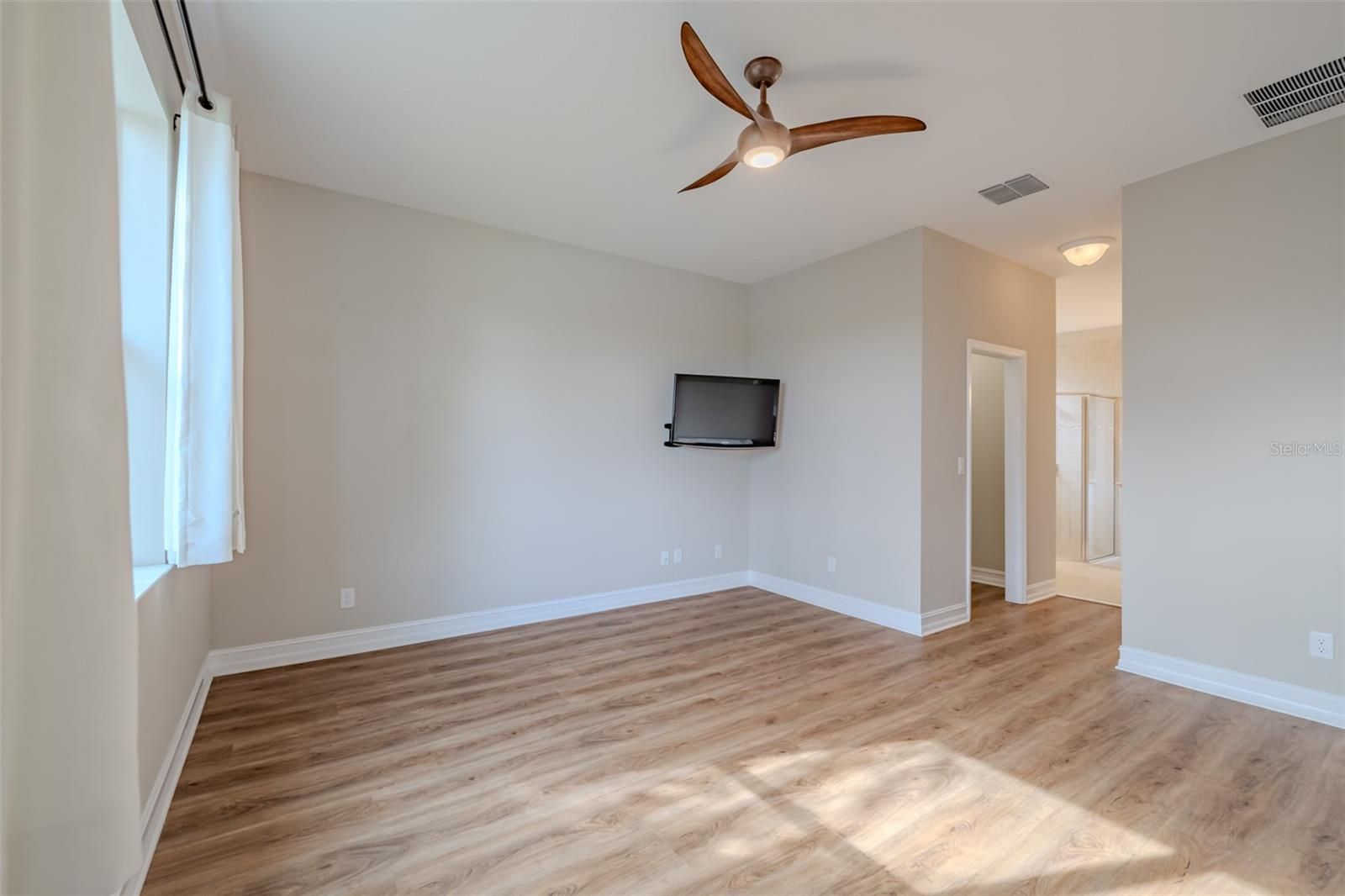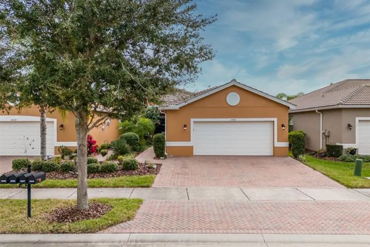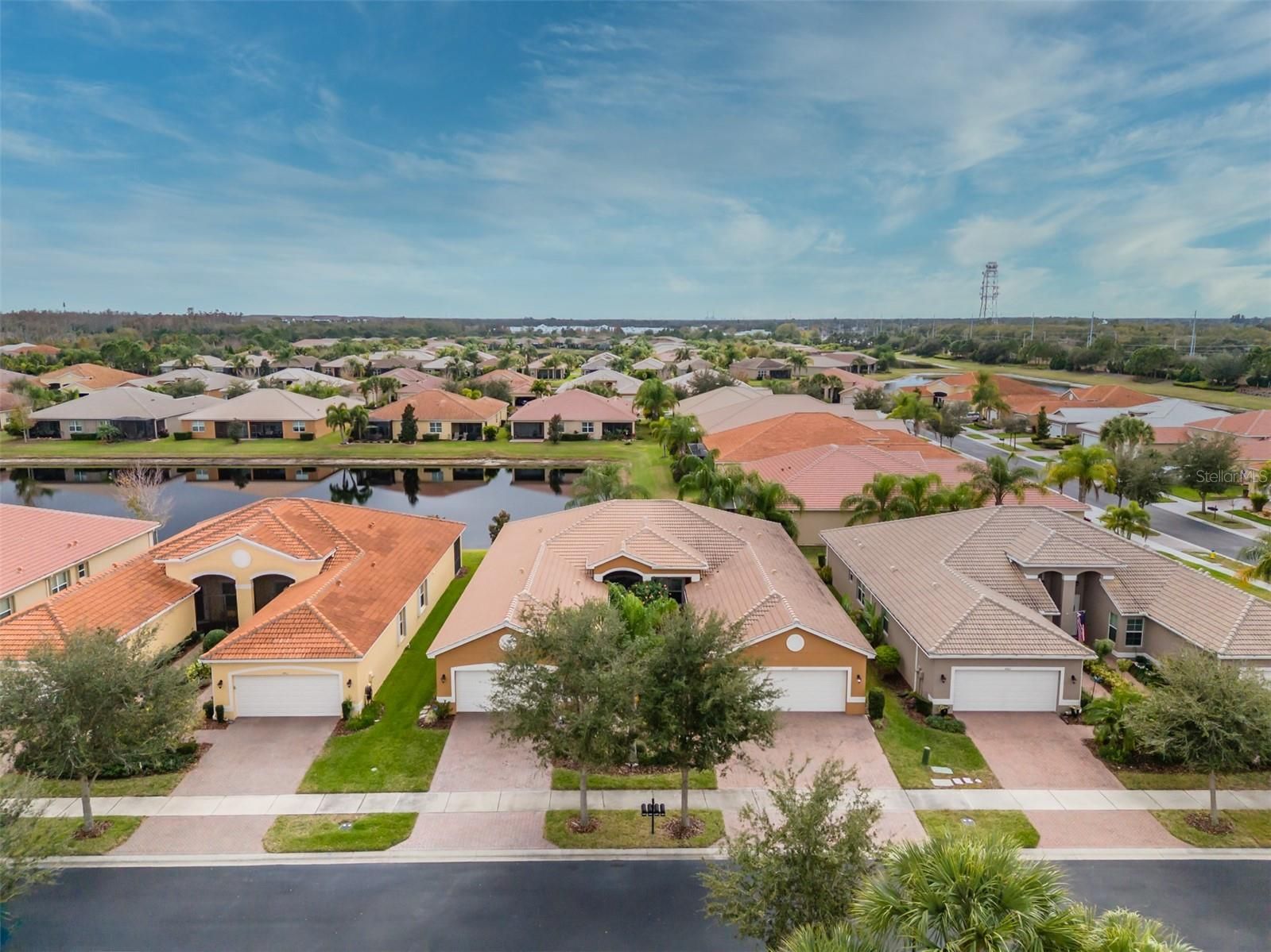 Welcome to Valencia Lakes, Tampa Bay’s premier 55+ Active Adult Community where resort-style living meets everyday comfort. This beautifully upgraded VICTORIA Regal Twin Villa offers 1,710 square feet under air, featuring 3 bedrooms, 2 baths, serene privacy, and abundant space to enjoy the idyllic Florida lifestyle. A full width driveway fronts the home. Manicured gardens lead to a covered portico, the perfect space to relax and take in Florida’s natural beauty and year-round pleasant temperatures. Inside, 9.5” x 60” laminate flooring flows seamlessly throughout the home, with tile in the bathrooms. The gourmet kitchen is a true standout, thoughtfully designed for both form and function. It features solid wood cabinetry with soft-close drawers and doors, two pantry cabinets with pull-out shelving, luxurious granite countertops, a stylish glass backsplash, and a bar-height breakfast counter accented by 3 decorative pendant lighting. Samsung S/S appliances include a slide-in range, 3-drawer refrigerator, microwave, & dishwasher. A casual dinette area with an 8’ window creates the ideal space for morning coffee or casual meals. The 13’x12’ dining room is highlighted by a large double window with up & down folded blinds, and it will comfortably accommodate eight. The spacious great room features a Harbor Breeze Saratoga 60” LED lighted ceiling fan and has access through 12’ sliders to the fully screened in lanai. The lanai offers the perfect space to relax, entertain, or simply enjoy the serene water view. The primary suite, located at the rear of the villa, offers tranquility and privacy with two generous walk-in closets, a Minka-Aire Light Wave ceiling fan, and a well-appointed ensuite bathroom. The ensuite features separated vanities with quartz counters, a large walk-in shower with safety bars & privacy glass window, and a W/C for the comfort-height commode. Bedroom 2, situated at the front of the home, provides exceptional comfort and privacy for guests and includes a lighted Minka-Aire Concept lighted ceiling fan. Bedroom features double French doors, a built-in closet, and a lighted ceiling fan, and will be ideal as a bedroom or home office. How will you use this space? The second bathroom offers a quartz banjo countertop, a comfort-height Sterling toilet, tiled tub/shower, privacy glass window, and porcelain tile flooring. The laundry room is pre-plumbed for a utility sink and includes a front-load Whirlpool washer and dryer on pedestals for added convenience and storage. The oversized garage is equally impressive, featuring a luxurious epoxy floor, wall-mounted cabinetry, two overhead storage racks, an insulated garage door, and a belt-drive Lift Master opener with MyQ technology. The garage is also pre-plumbed for a water softener. Additional features include a Goodman HVAC system, hot water heater, and a 200-amp electrical panel, ensuring comfort and reliability. Valencia Lakes is a true world-class community featuring a 40,000SF Clubhouse, a 5,000SF State of the Heart Gym, 2 Multi-purpose Exercise Rooms, a Resort-style Pool, Resistance Pool, Spa, 5-Lane Lap Pool, Steam Baths, Saunas, 7 Pickleball Courts, 6 USTA Har-Tru Tennis Courts, 4 Bocce Lanes, 4 Shuffleboard lanes, Half-Court Basketball, the best Softball Stadium in the local area, a Dog Park, Garden Plots for the Green Thumbs, over 100 clubs and a Memorial Circle in honor of those who have served. Seize the day and make your dreams, your reality.