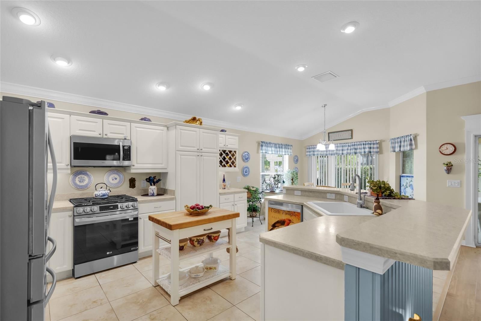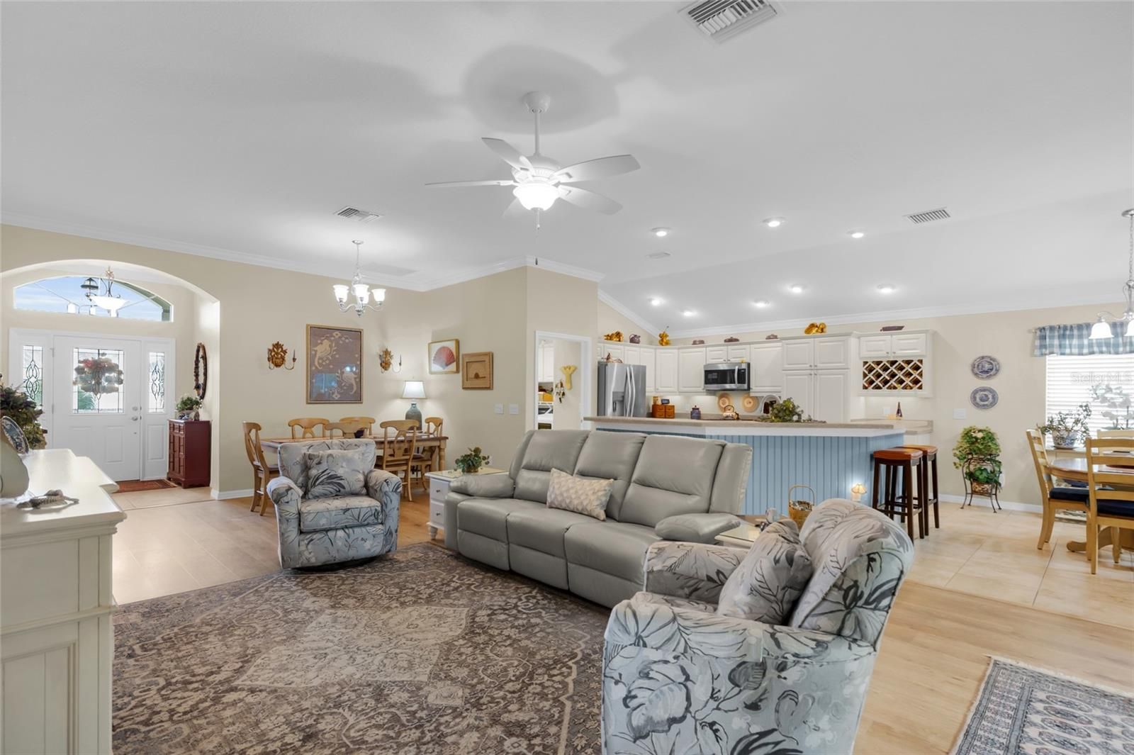 Pristine Villages Retreat in La Belle.Discover this beautifully maintained 3-bedroom, 2-bath residence in the highly desirable Village of La Belle, just moments from Belle Glade Country Club and steps from the Atlas Canine Recreation Dog Park. This CORNER LOT home shows like a model with thoughtful upgrades and a layout perfect for both entertaining and everyday living. From the moment you arrive, you’ll notice the meticulous landscaping and inviting curb appeal. Step inside to soaring ceilings, crown molding, luxury vinyl plank and tile flooring, and an abundance of natural light. The spacious living and dining areas flow seamlessly into the enclosed Florida room with wall-to-wall windows, creating a bright retreat year-round. The chef’s kitchen offers white cabinetry, stainless steel appliances, a wine rack, breakfast bar, and casual dining nook, all designed with function and style in mind. The oversized primary suite features a tray ceiling, spa-like bathroom with dual vanities, an expansive walk-in tiled shower, and a huge custom closet system. Guest bedrooms are generous in size - one complete with built-in shelving and desk, ideal for a home office or hobby space. Step outdoors to enjoy a pergola-covered patio, perfect for relaxing or entertaining. A laundry room with cabinetry and a garage featuring built-in shelving provide practical convenience, while the pristine condition throughout ensures move-in readiness. This exceptional home combines elegance, comfort, and location - delivering the very best of The Villages lifestyle. Keep in mind- that just about anywhere you need to go in The Villages- YOU CAN TAKE YOUR GOLF CART!!!