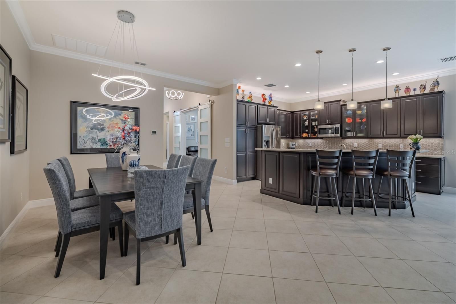 Are you ready for this wonderful 2018 GL Homes built BARBADOS model located in Valencia Lakes, Tampa Bay’s premier 55+ Active Adult community. With 2,275SF under a/c, it has 3 bedrooms, 2.5 bathrooms, a 3-car tandem garage and a serene westerly water view that affords amazing views. Approaching this BARBADOS, take note of the immaculate professional landscaping with river rock flower beds framed in decorative poured concrete borders, full-house gutters, and accordion shutters on the windows and you will get a sense of what lies within. A grand Foyer runs 22’ long with a 13’-14’ tray ceiling with 2 stunning Kuzco Lighting OROS LED chandeliers. 18”x18” porcelain tile capped by 51/4” baseboards, and custom crown molding runs throughout the common areas creating a crisp and clean appearance. Bedroom 2 is at the front of the home affording outstanding privacy and comfort and features carpet, a 3-panel bay window, and an LED ceiling fan. Bathroom 2 has a tub/shower with tub-ceiling wall tile, a privacy glass window, and a quartz topped vanity, … guests may never want to leave. Bedroom 3 has a gorgeous 4-panel frosted glass barn-house door, a custom built-in desk, 4 floating wall shelves and a generous walk-in closet; currently fashioned as a Den, how will you use this space? Opposite Bedroom 3 is a dedicated 5’x7’ storage closet, a Powder Room, and a well -appointed Laundry Room with a top load LG washer & dryer and a large utility sink vanity. The open floorplan is large, bright, and beautiful. The Kitchen has 3 pendant lights above a very functional island with a single-basin sink with an RO faucet and a bar-height breakfast counter. Solid wood espresso-colored cabinets and Pantry with soft close drawers and doors, sliding shelves and pot drawers are adorned with quartz counters, and topped with a glossy gray GEOSCAPES Hexagon ceramic tile backsplash. SAMSUNG SS appliances include a slide-in range with two convection ovens, a 5-door fridge, and an externally vented microwave. The Dining Room will comfortably host 10 persons and features a stunning Possini Euro HELIX 3-ring chandelier. The Great Room features 6 recessed lights, a Honeywell XERXES 62” LED ceiling fan, 12’ sliders with NORMAN SmartDrape shades with sheer and fabric vanes, ZEBRA shades, and a custom Accent Woodworking wall unit. The spacious Primary Bedroom is carpeted, has a tray ceiling with an LED ceiling fan, two walk-in closets, a wonderful Ensuite Bathroom and a 9’ window that overlooks water and provides exceptional sunset views. The Ensuite Bathroom has a large glassed walk-in shower, two separate vanities, and a Water Closet for the commode. The 3-car tandem garage features luxury epoxy floors, two overhead storage racks, and a new CHAMBERLAIN opener with MyQ. Environmental comforts are assured by a 4-ton HVAC, a Rheem 50-gal hot water tank (2024), a Culligan water softener system, and an EATON Complete Home Surge Protector. This BARBADOS is immaculate. Valencia Lakes is a much-desired community which has an amazing 40,000 sq ft clubhouse offering entertainment shows, dances, myriad clubs, a state-of-the heart 24/7 Fitness Center, resort pool, 5-lane lap pool, exercise classes, card rooms, pickleball, tennis and so much more. Conveniently located to hospitals, Tampa, TPA & SRQ, and a short drive to Disney, Cruise Ports, Sarasota and some of the best beaches in the State! Seize the day and begin living your idyllic life now.