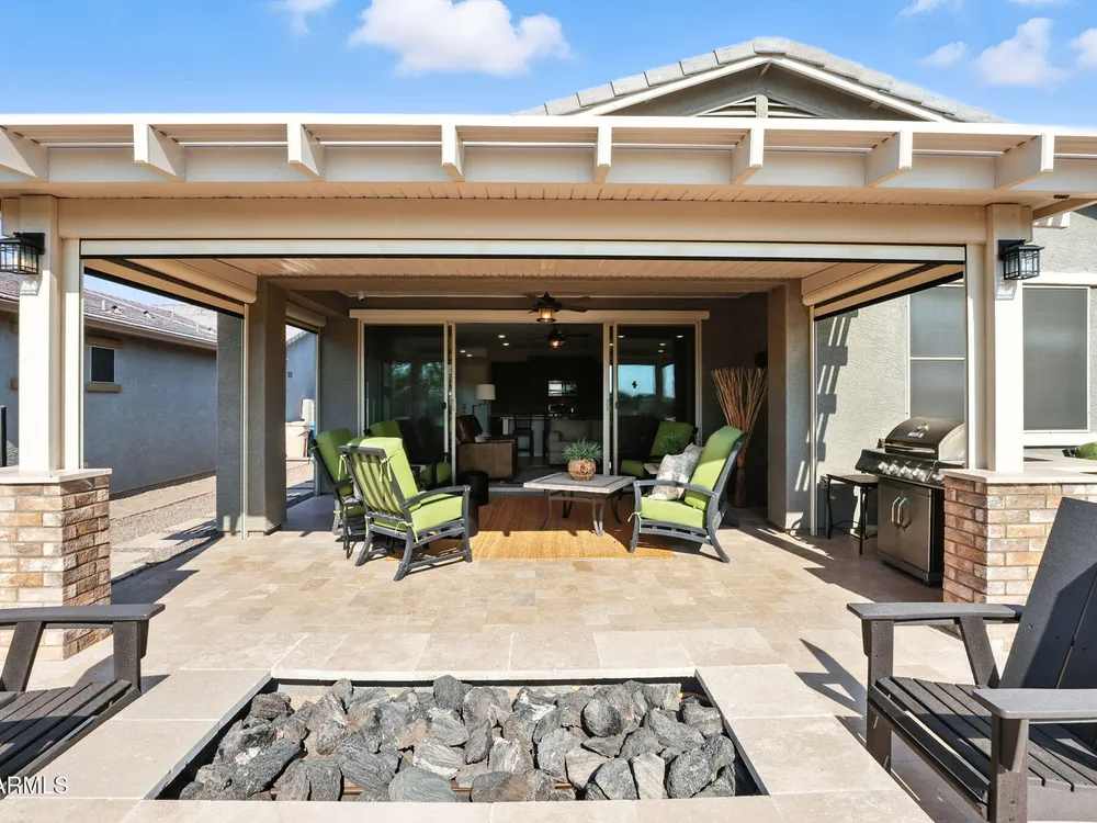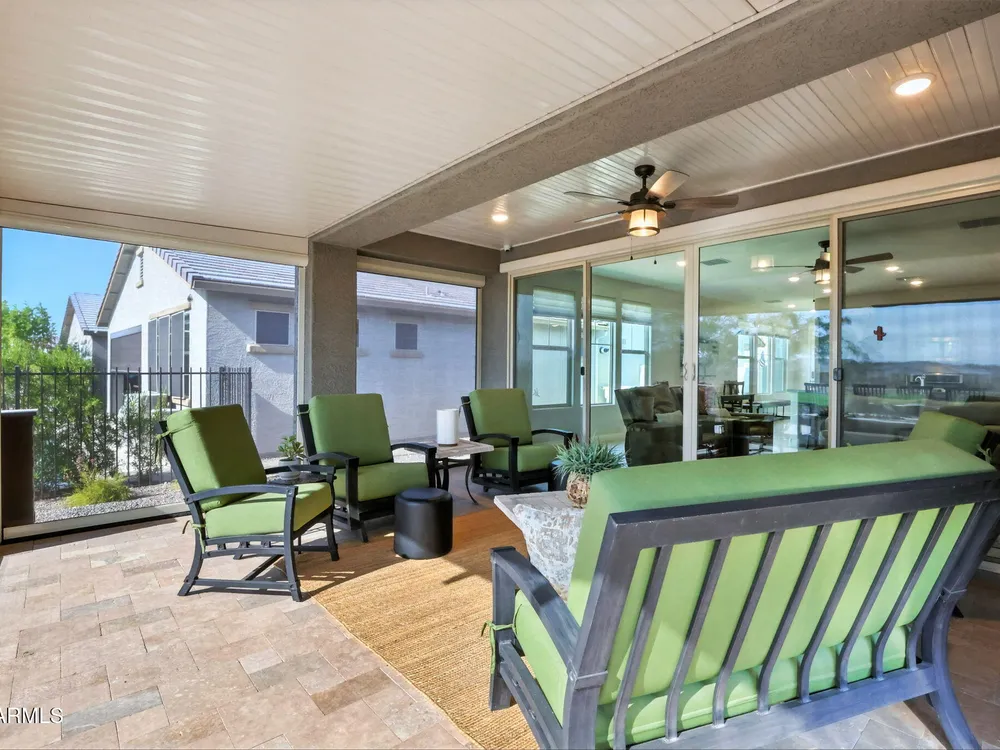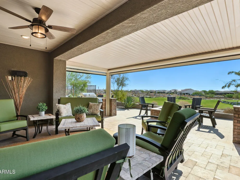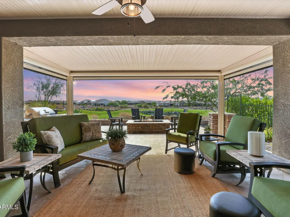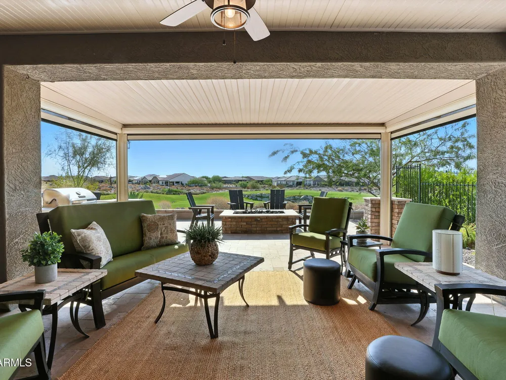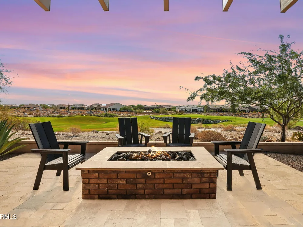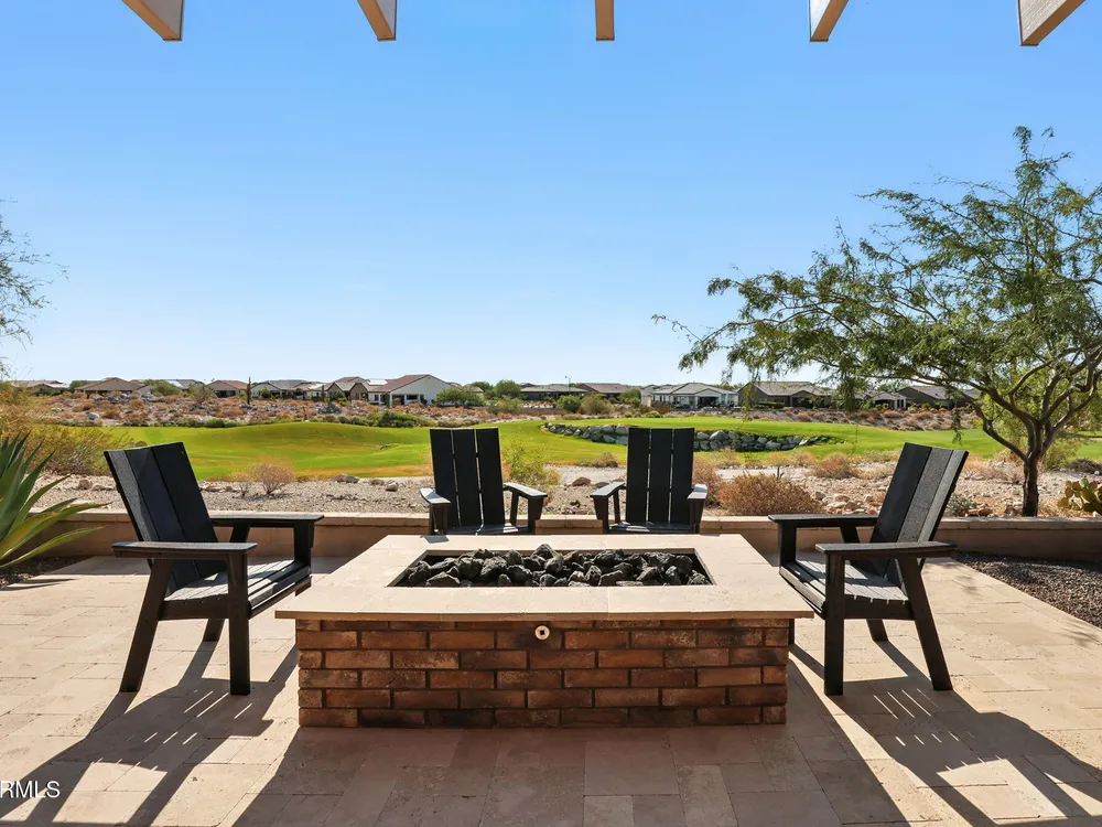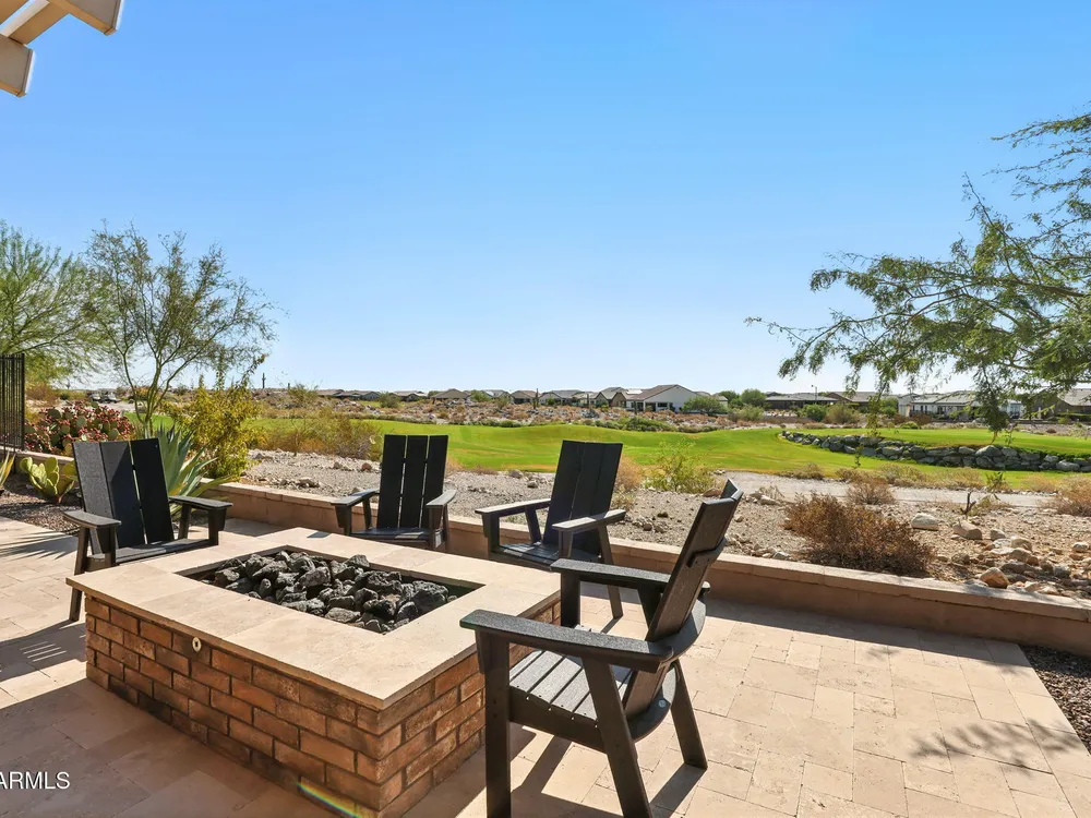 GOLF, VIEWS & PURE LUXURY! This spacious open-concept floor plan home at Victory at Verrado offers it all - front-row golf course views, and majestic mountains around. Enjoy the seamless blend of indoor & outdoor enjoyment as you relax under the expansive covered patio w/electric sun shades, new landscaping including travertine and gas firepit. Alley loaded 2.5 car tandem garage with epoxy floor, extensive custom cabinets and workbench. This is 55+ resort-style living at its most breathtaking TOP 50 Master-Planned Communities in the nation!