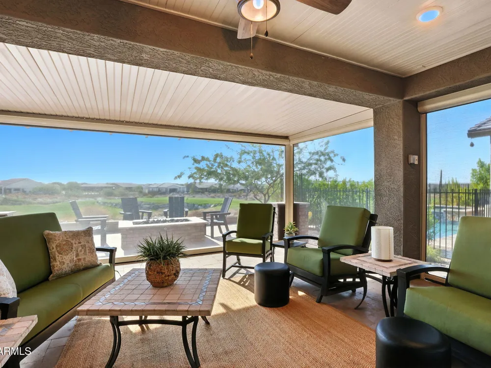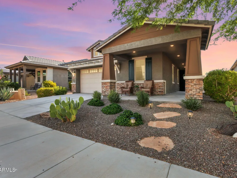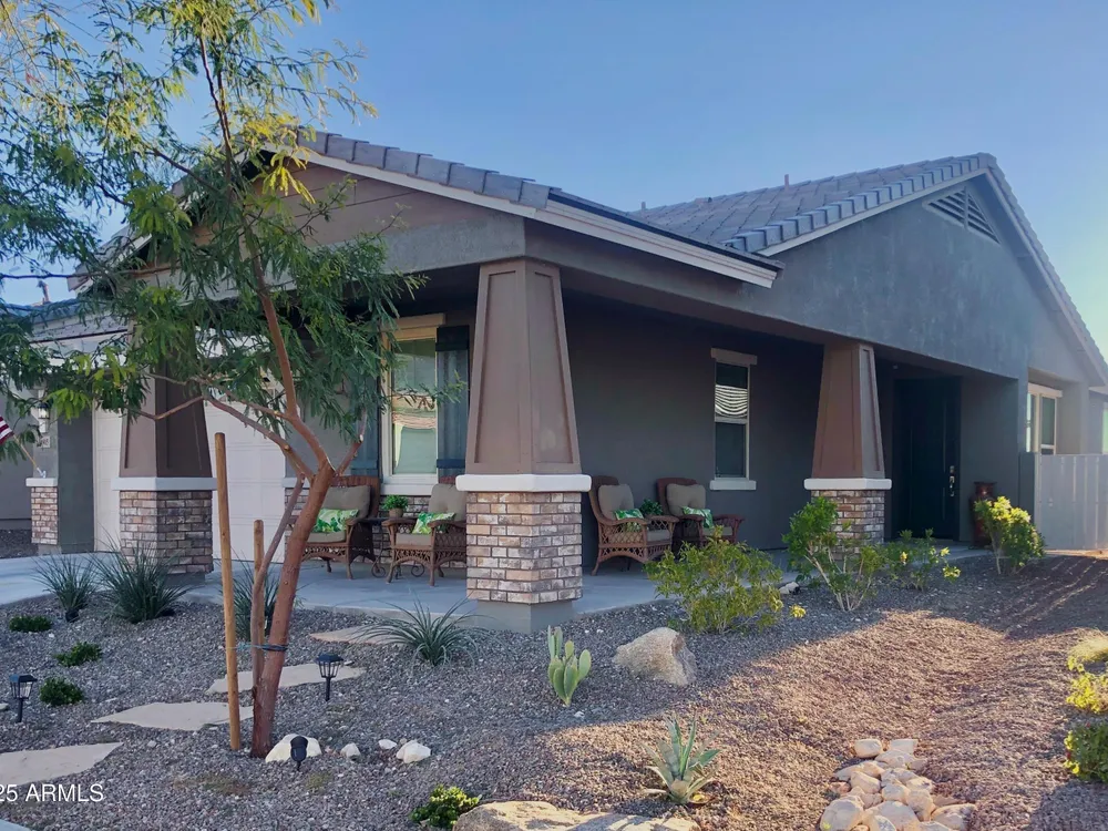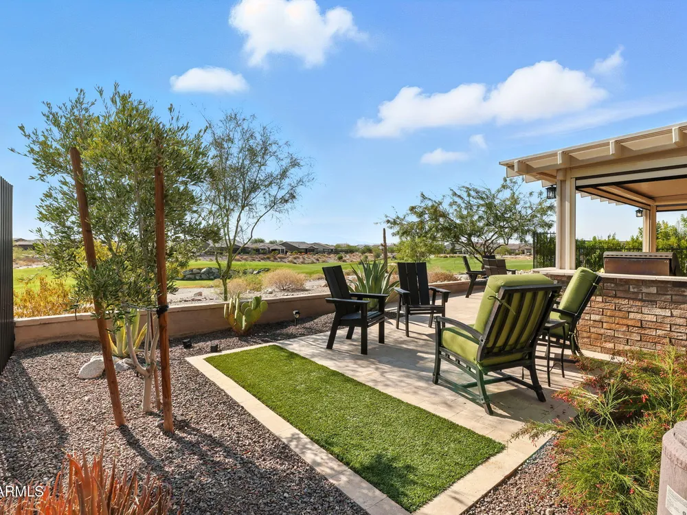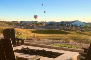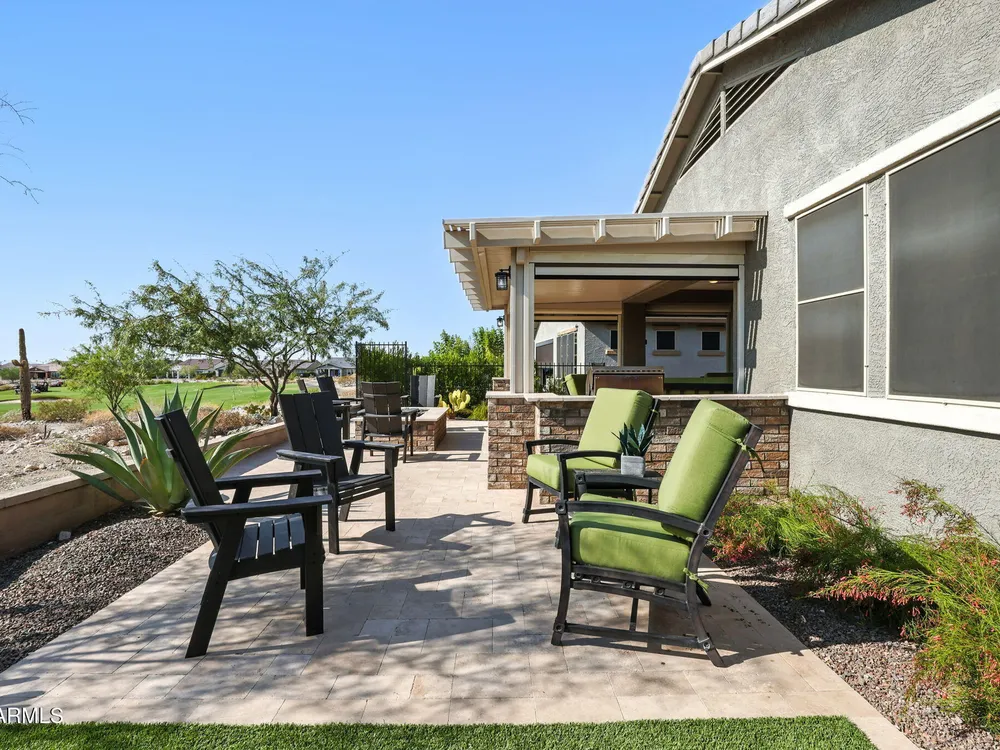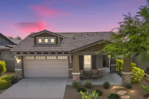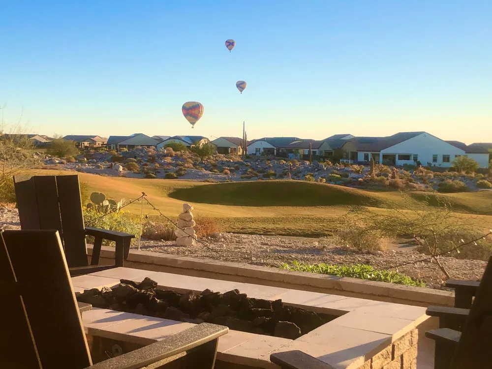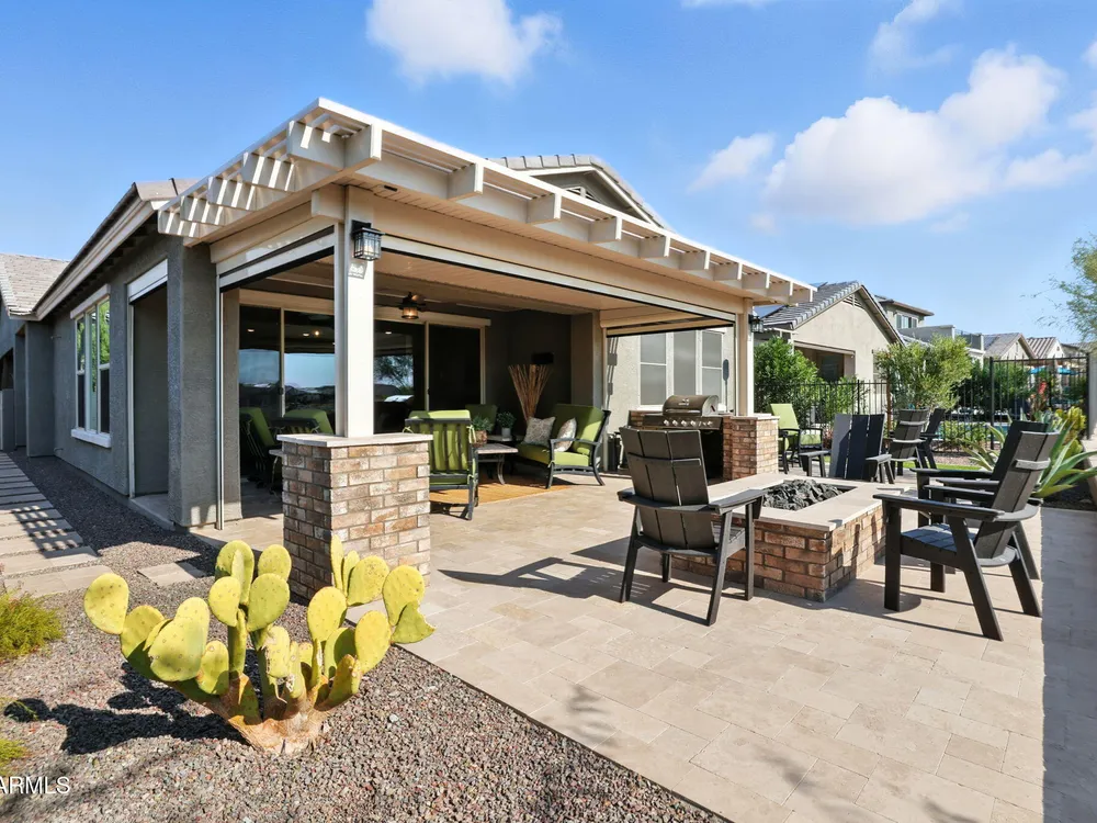 GOLF, VIEWS & PURE LUXURY! This spacious open-concept floor plan home at Victory at Verrado offers it all - front-row golf course views, and majestic mountains around. Enjoy the seamless blend of indoor & outdoor enjoyment as you relax under the expansive covered patio w/electric sun shades, new landscaping including travertine and gas firepit. Alley loaded 2.5 car tandem garage with epoxy floor, extensive custom cabinets and workbench. This is 55+ resort-style living at its most breathtaking TOP 50 Master-Planned Communities in the nation!