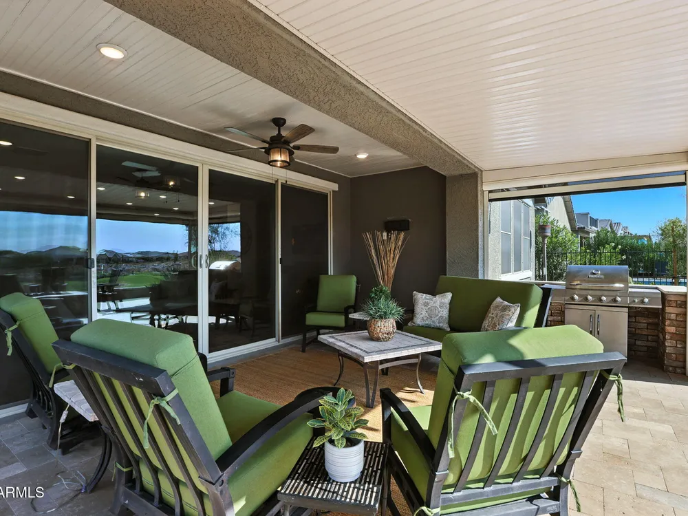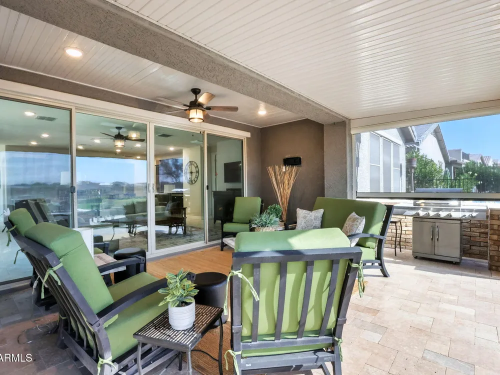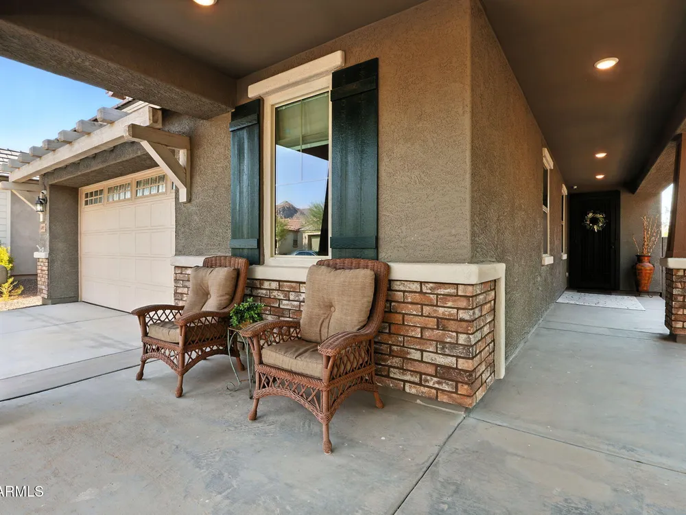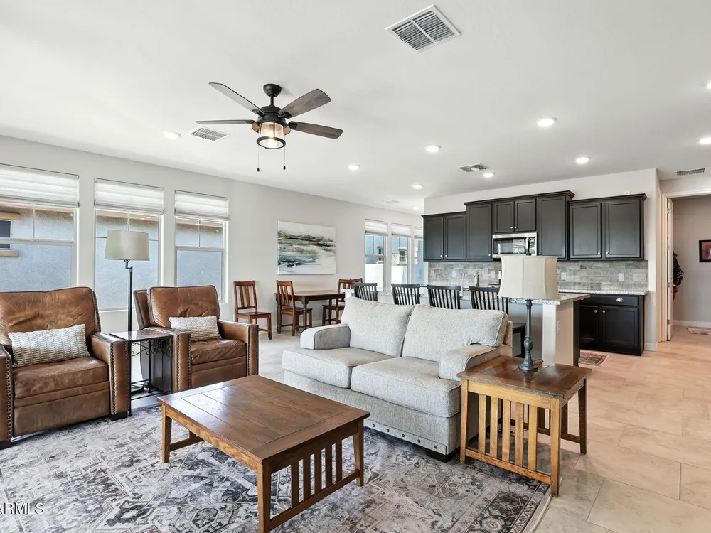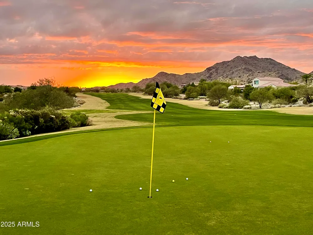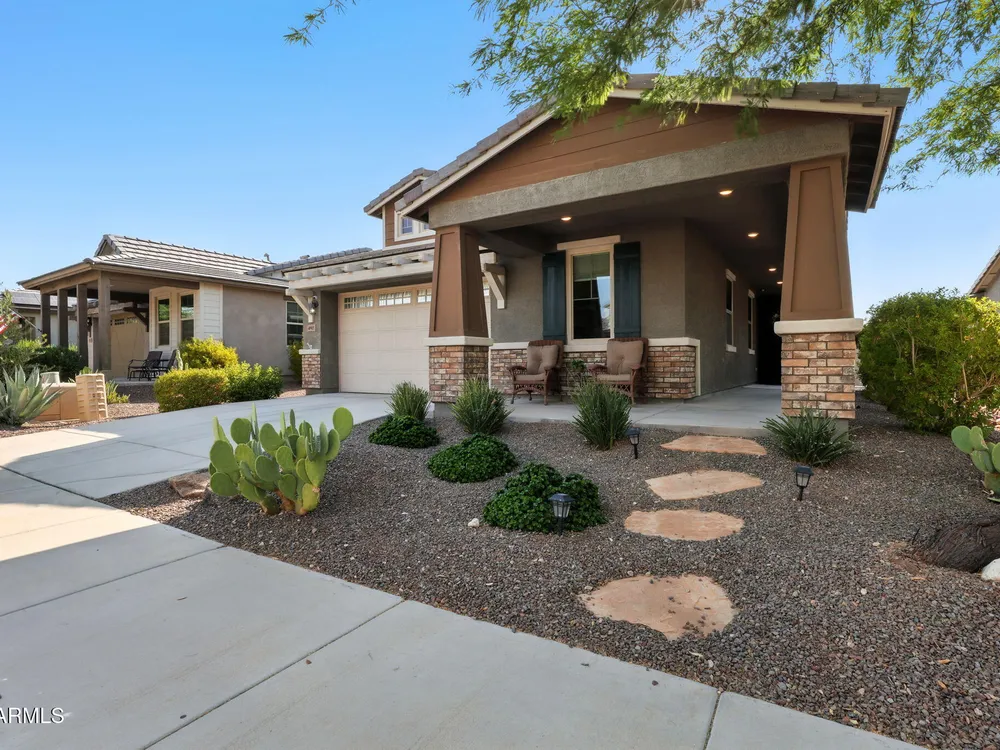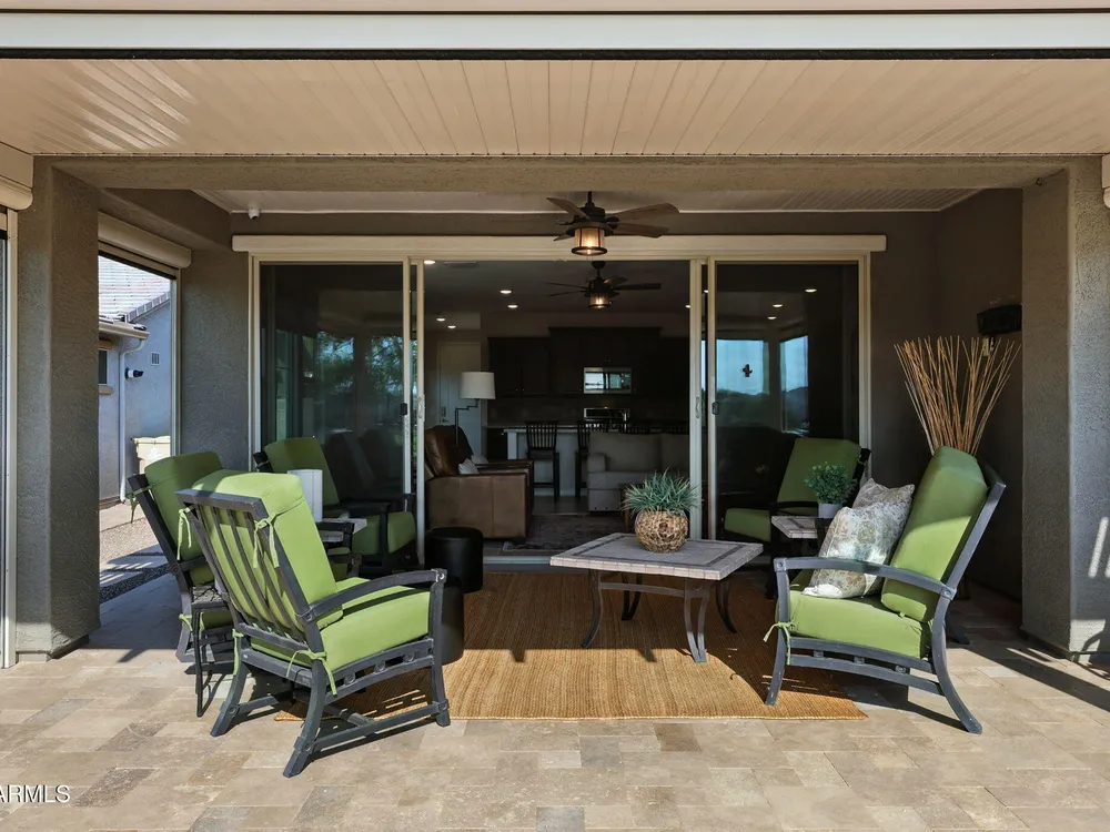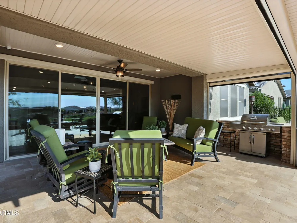 GOLF, VIEWS & PURE LUXURY! This spacious open-concept floor plan home at Victory at Verrado offers it all - front-row golf course views, and majestic mountains around. Enjoy the seamless blend of indoor & outdoor enjoyment as you relax under the expansive covered patio w/electric sun shades, new landscaping including travertine and gas firepit. Alley loaded 2.5 car tandem garage with epoxy floor, extensive custom cabinets and workbench. This is 55+ resort-style living at its most breathtaking TOP 50 Master-Planned Communities in the nation!