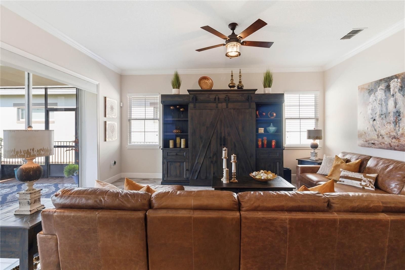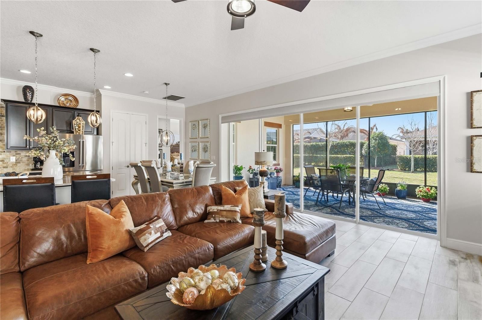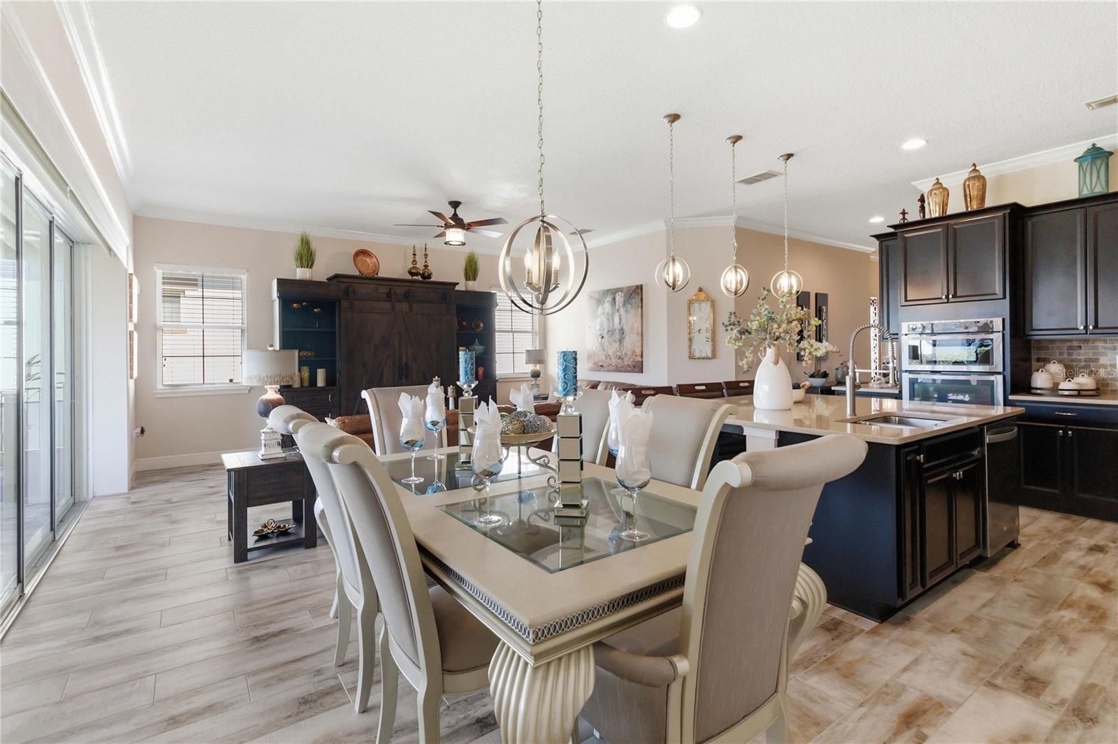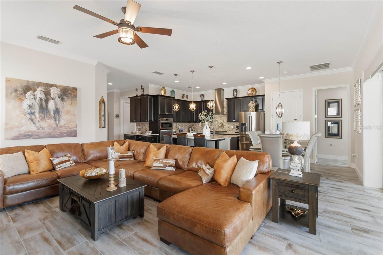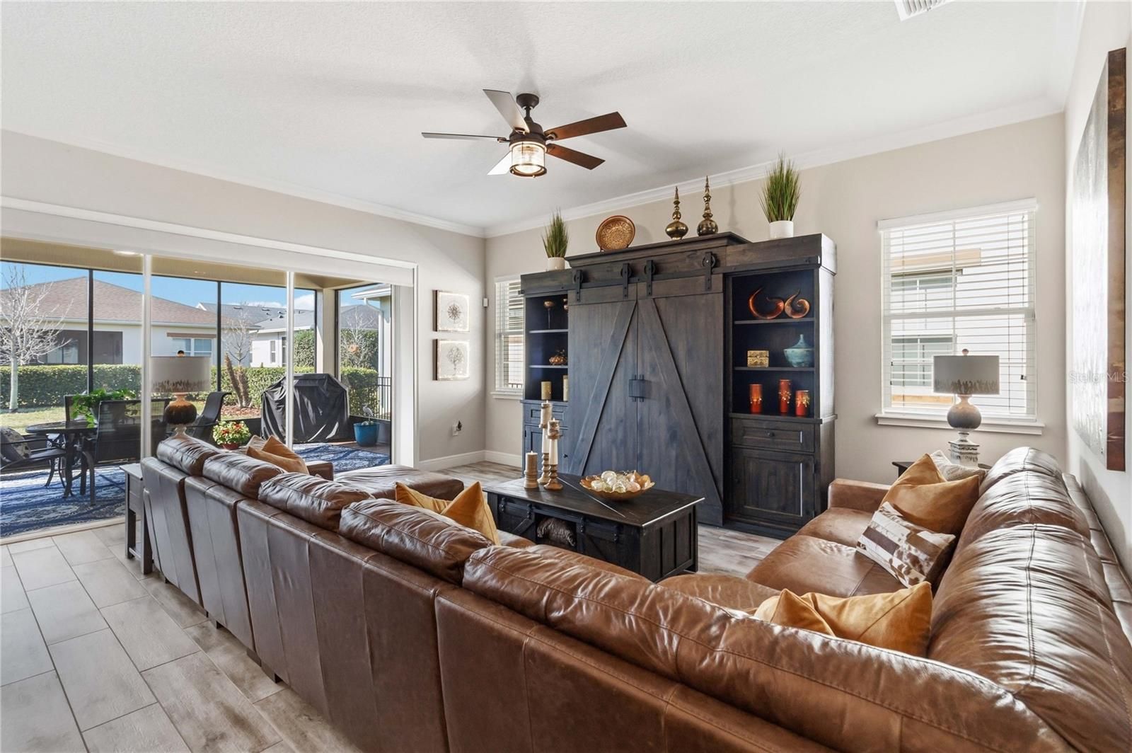 Welcome to this Absolutely stunning Captiva floor plan 3 bedrooms, 2 bathrooms, located on a premium lot in the desirable Del Webb Twin Lakes 55+ community. New Roof, A/C and Exterior paint. All come with warranty. Front porch features two ceiling fans. Step inside to the 10’ Ceiling with the flexible layout for gatherings. Foyer with custom glass insert front door. Hallway with custom wood trim. Plank Porcelain Tile flooring throughout home. Plantation shutters in front bedroom. Crown Molding throughout entire home. Custom gourmet Kitchen is well equipped with 42” cabinets, pendant lights, and a very large kitchen upgraded quartz extended island that accommodates setting for a quick bite. Large pantry, Stainless steel appliances, and beautiful tile backsplash. Gas stove top with 5 burners. Custom hood fan. Separate drop zone area with tile back splash. Large sliding glass panel doors with battery operated power blinds lead to inviting Lanai with 2 stone walls, outside ceiling fans and fenced in back yard with palm trees and landscaping for your spectacular view to enjoy your morning coffee or evening gatherings. Master bedroom with tray ceiling, Crown molding and nice lighting. Large walk-in closet with Custom shelving from closets by design. Frameless shower doors to master luxurious two separate shower heads, custom tiling & Custom granite double vanity. Laundry room with custom upper 42" cabinets. Whole house water softener/purifying system. Epoxy garage flooring. Pull-down stairs and attic storage. Sealed front pavers. Amenities include a Resort style pool and Lap Pool, and 3rd pool on the carriage house side, 20,000 square foot Clubhouse, State of the art Fitness Center, Tennis Courts, Putting Green, Walking Trails, Pickle Ball Court, Fishing, and Pontoon Boats and Jon boat to use on Live Oak Lake! The community has many active and socializing activities to keep you VERY busy!! All of this in a GREAT gated community located in Central Florida close to Lake Nona Medical City, Orlando, Orlando International Airport, Theme Parks, and Brevard Beaches! Do not delay making your appointment to view this home today!!