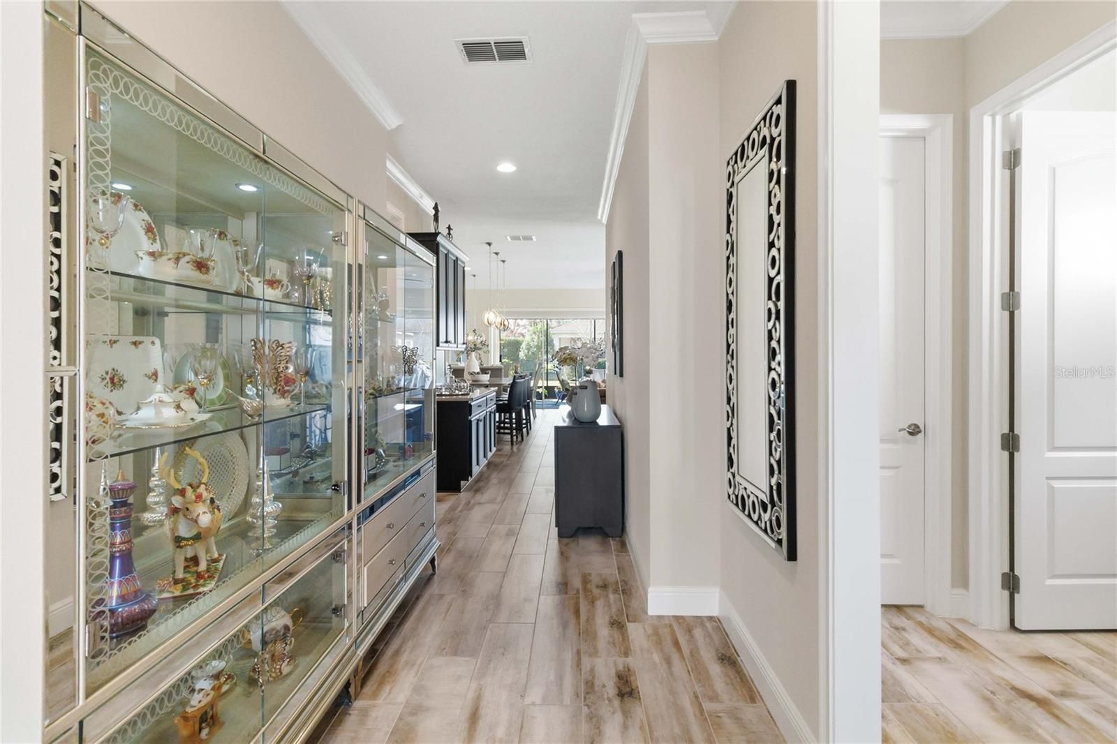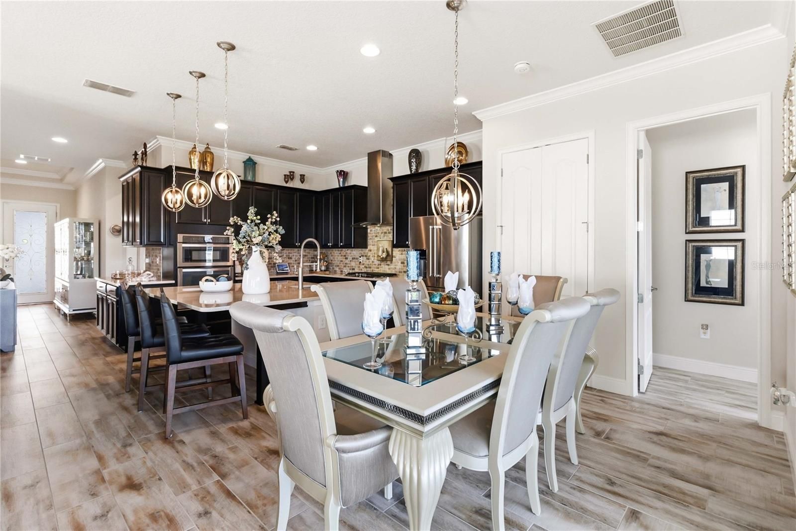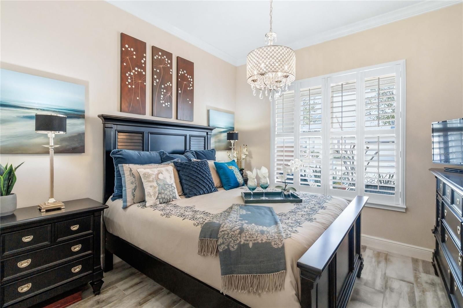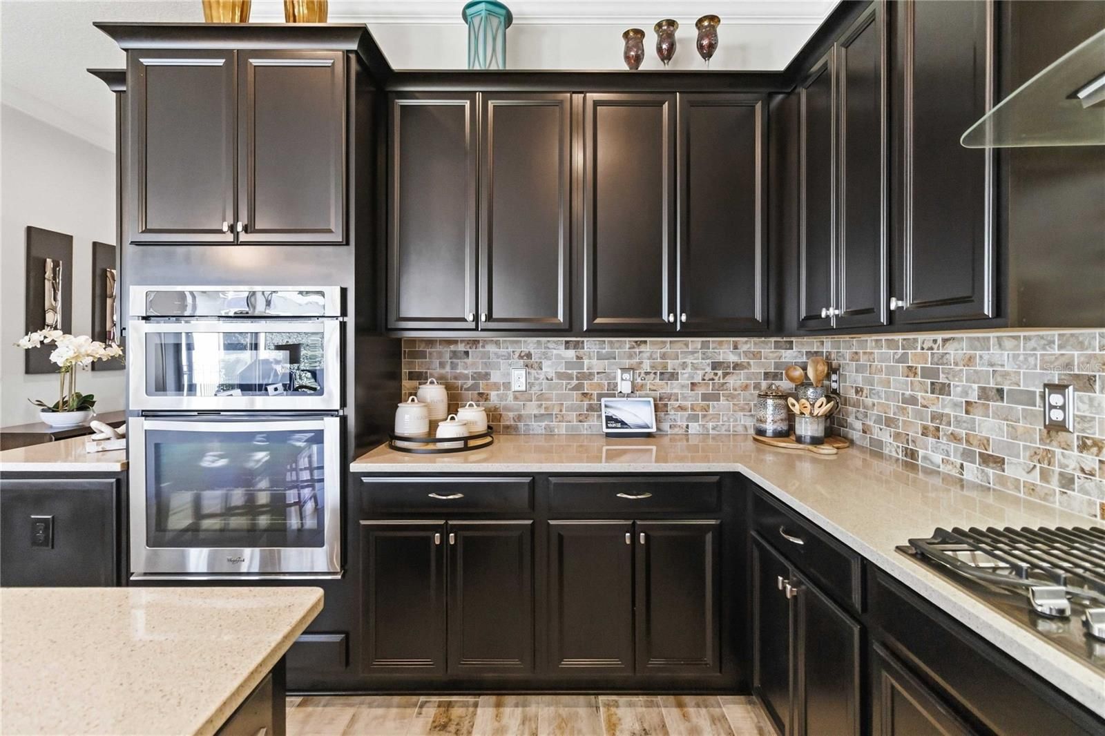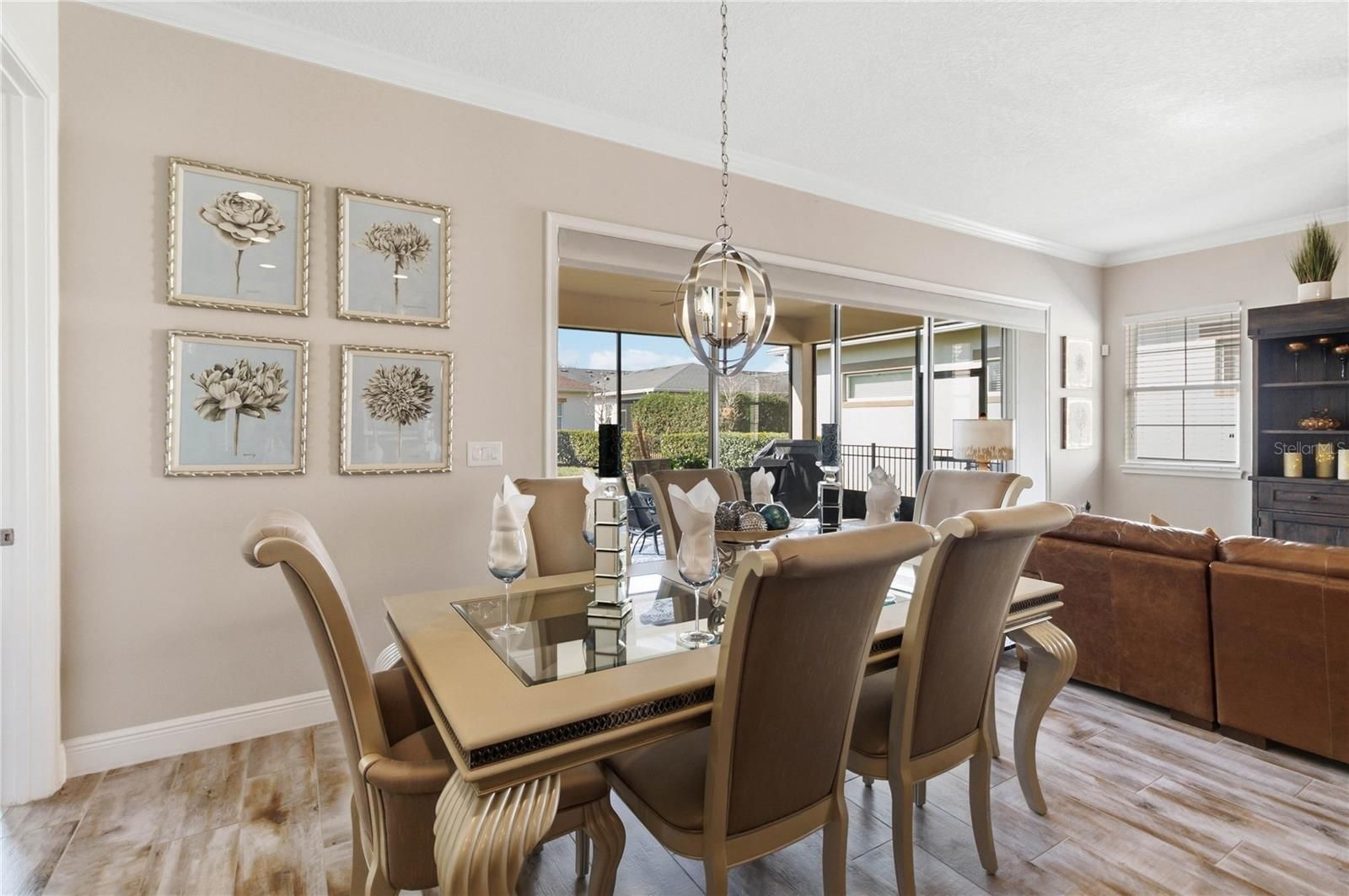 Welcome to this Absolutely stunning Captiva floor plan 3 bedrooms, 2 bathrooms, located on a premium lot in the desirable Del Webb Twin Lakes 55+ community. New Roof, A/C and Exterior paint. All come with warranty. Front porch features two ceiling fans. Step inside to the 10’ Ceiling with the flexible layout for gatherings. Foyer with custom glass insert front door. Hallway with custom wood trim. Plank Porcelain Tile flooring throughout home. Plantation shutters in front bedroom. Crown Molding throughout entire home. Custom gourmet Kitchen is well equipped with 42” cabinets, pendant lights, and a very large kitchen upgraded quartz extended island that accommodates setting for a quick bite. Large pantry, Stainless steel appliances, and beautiful tile backsplash. Gas stove top with 5 burners. Custom hood fan. Separate drop zone area with tile back splash. Large sliding glass panel doors with battery operated power blinds lead to inviting Lanai with 2 stone walls, outside ceiling fans and fenced in back yard with palm trees and landscaping for your spectacular view to enjoy your morning coffee or evening gatherings. Master bedroom with tray ceiling, Crown molding and nice lighting. Large walk-in closet with Custom shelving from closets by design. Frameless shower doors to master luxurious two separate shower heads, custom tiling & Custom granite double vanity. Laundry room with custom upper 42" cabinets. Whole house water softener/purifying system. Epoxy garage flooring. Pull-down stairs and attic storage. Sealed front pavers. Amenities include a Resort style pool and Lap Pool, and 3rd pool on the carriage house side, 20,000 square foot Clubhouse, State of the art Fitness Center, Tennis Courts, Putting Green, Walking Trails, Pickle Ball Court, Fishing, and Pontoon Boats and Jon boat to use on Live Oak Lake! The community has many active and socializing activities to keep you VERY busy!! All of this in a GREAT gated community located in Central Florida close to Lake Nona Medical City, Orlando, Orlando International Airport, Theme Parks, and Brevard Beaches! Do not delay making your appointment to view this home today!!