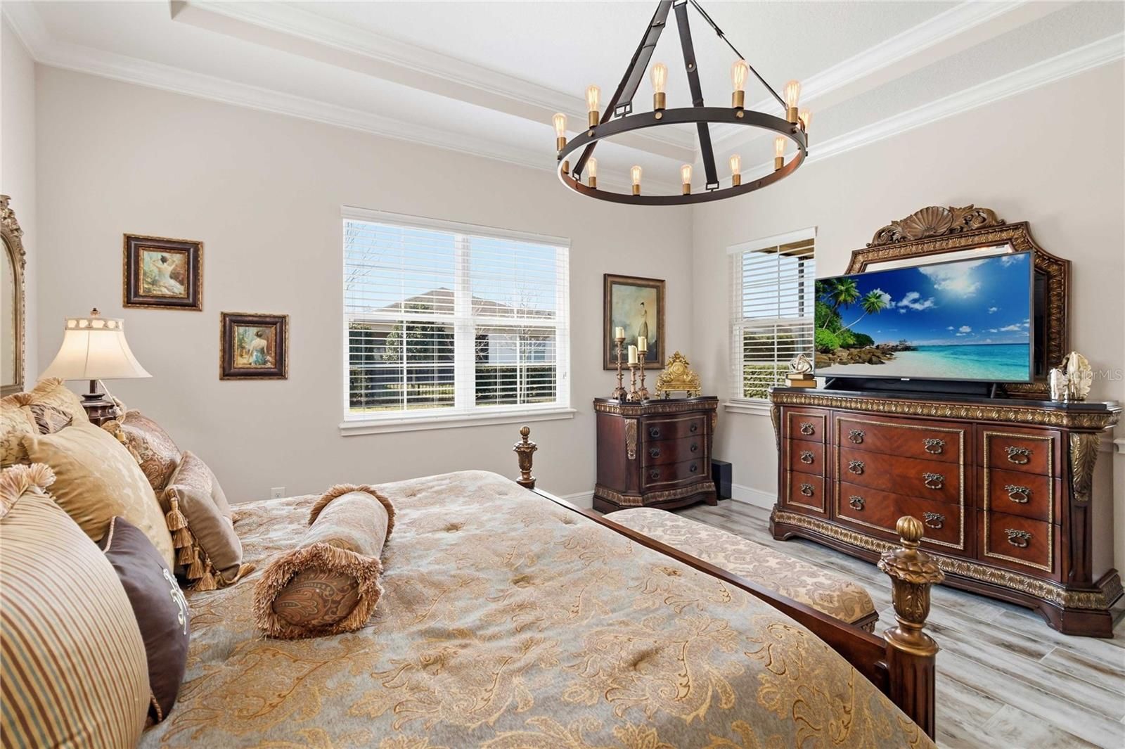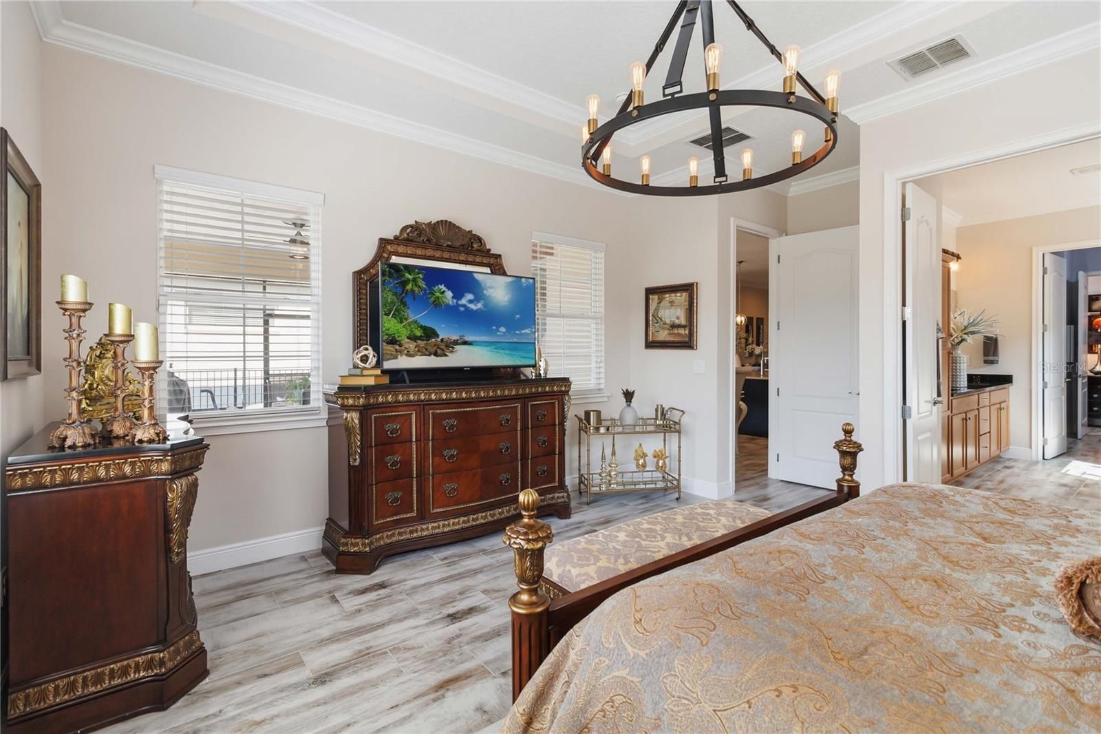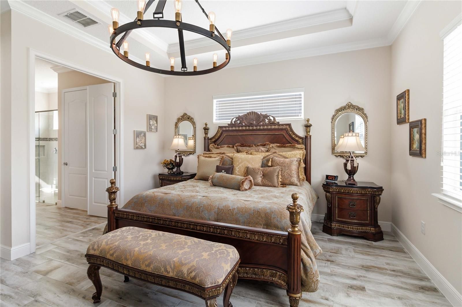 - Ceiling Fan(s), Crown Molding, Eat-in Kitchen, High Ceilings, Main Level Primary, Solid-Wood Cabinets, Split Bedrooms, Stone Counters, Thermostat, Tray Ceiling(s), Walk-In Closet(s), Window Treatments