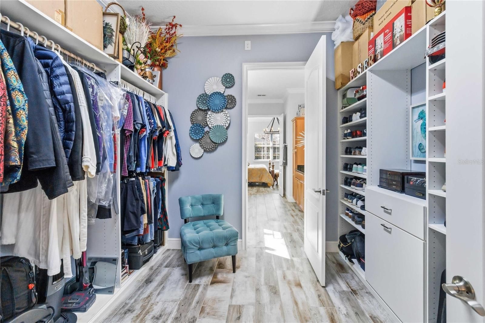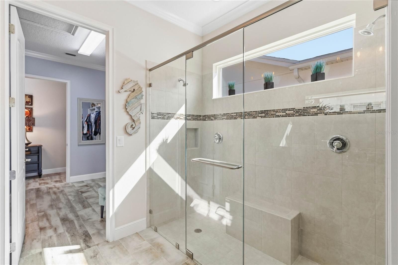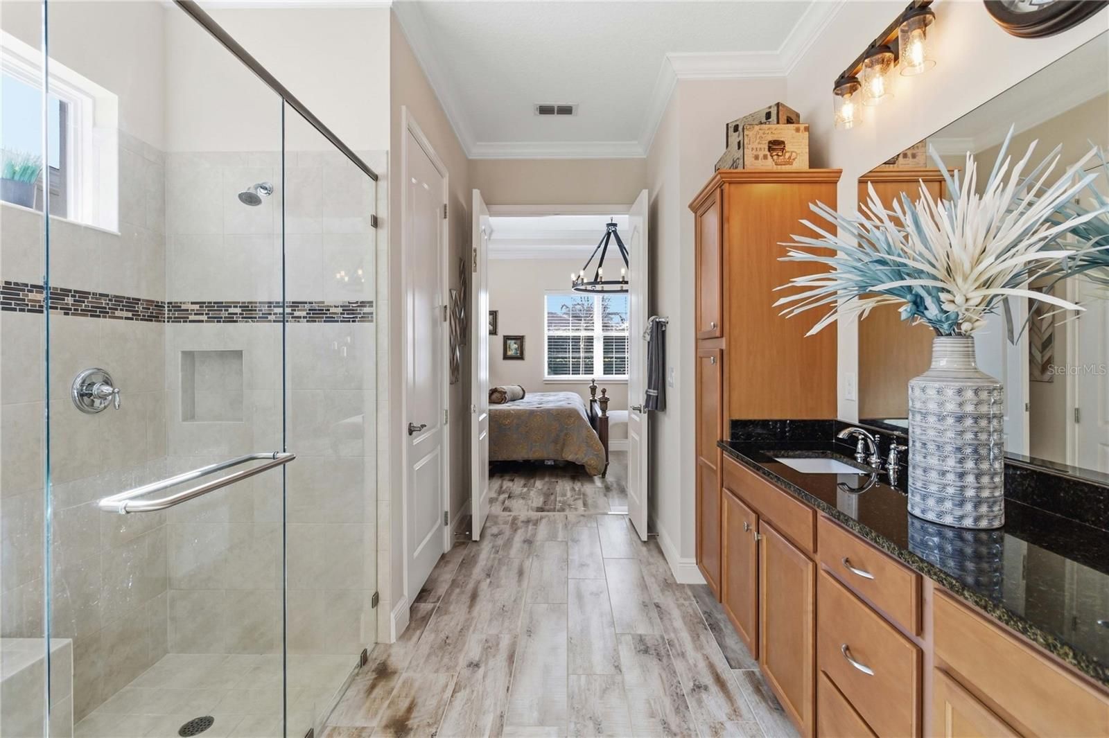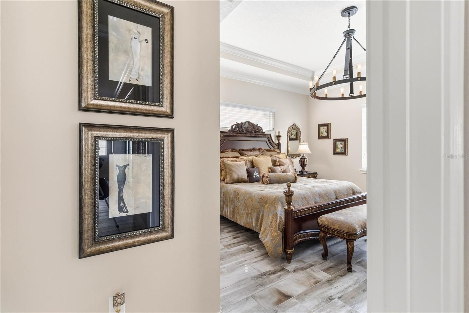 - Ceiling Fan(s), Crown Molding, Eat-in Kitchen, High Ceilings, Main Level Primary, Solid-Wood Cabinets, Split Bedrooms, Stone Counters, Thermostat, Tray Ceiling(s), Walk-In Closet(s), Window Treatments