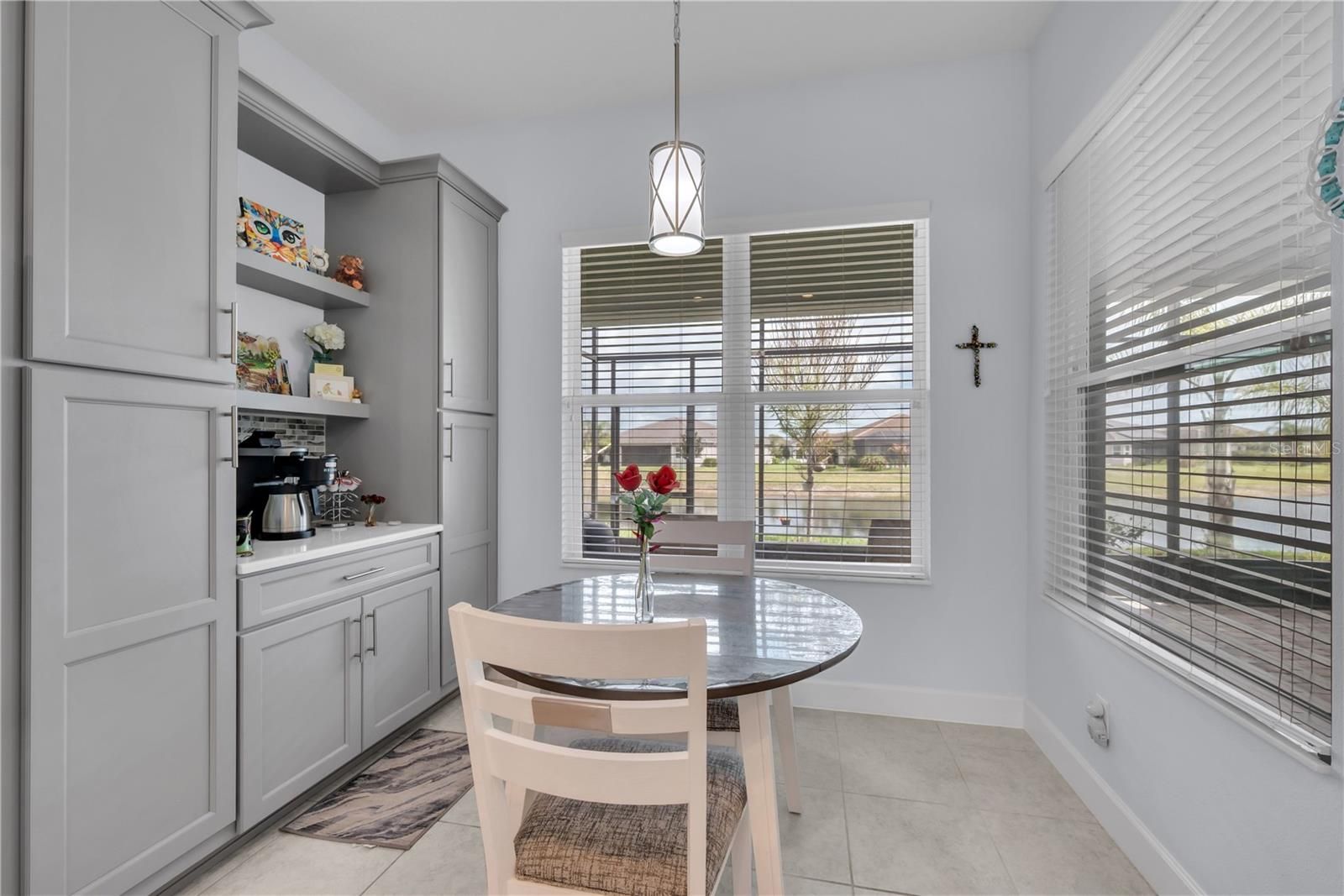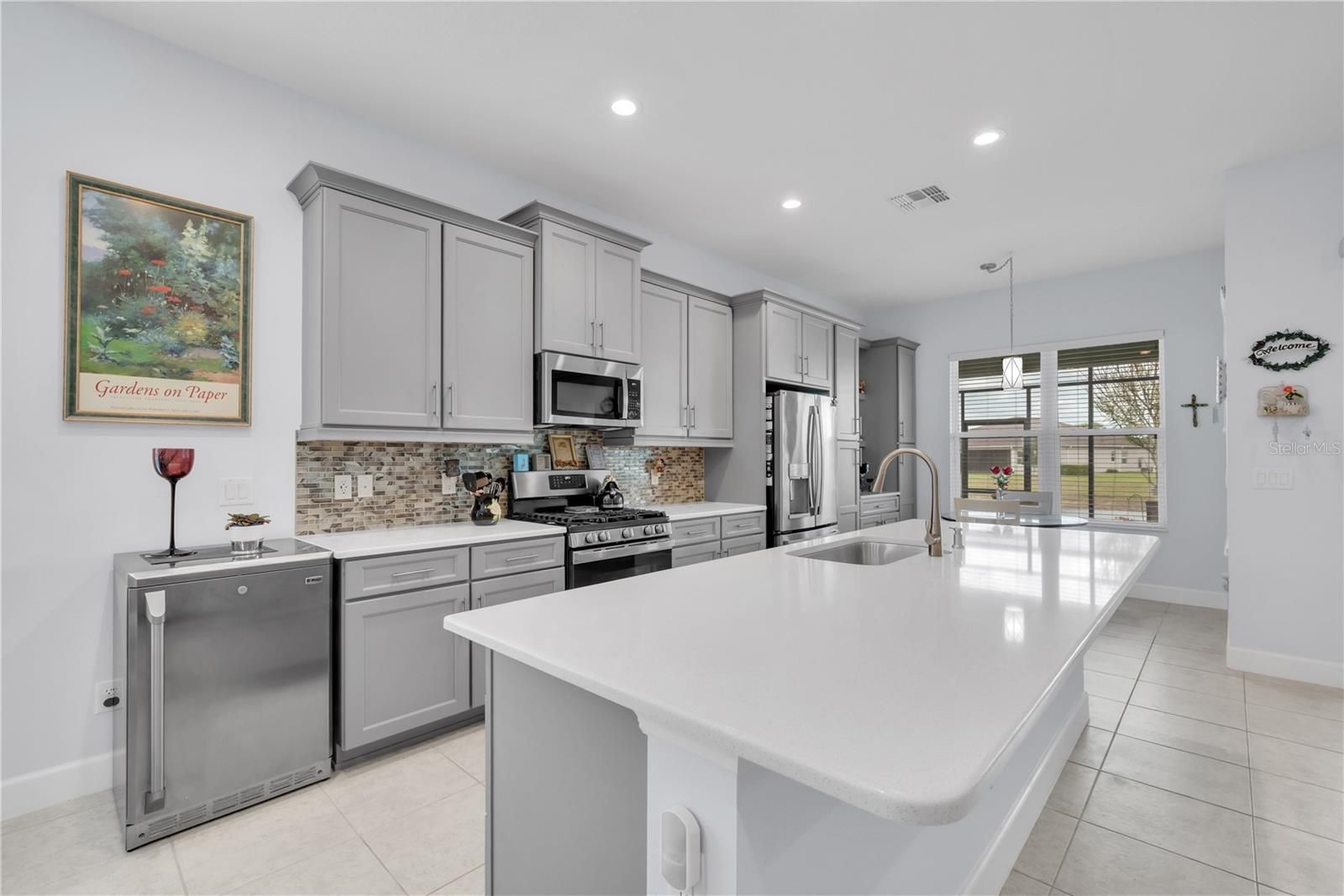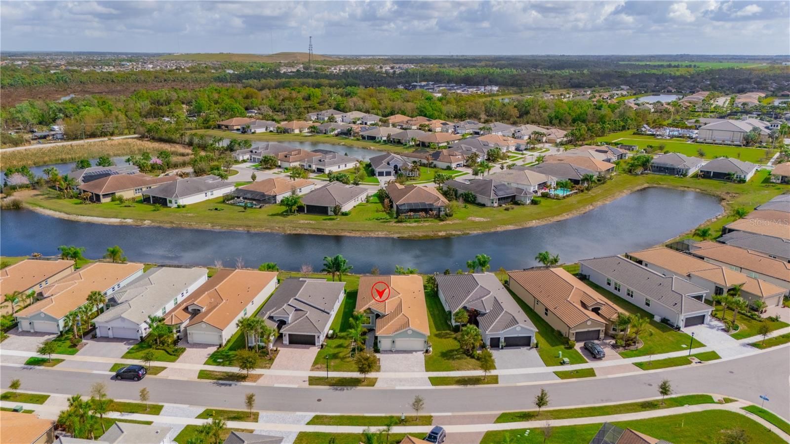 Experience luxury living in this highly sought-after Palazzo model, perfectly positioned to capture a breathtaking water view. Enjoy peaceful mornings and relaxing evenings from the extended covered and screened lanai, designed to embrace Florida’s indoor-outdoor lifestyle. The home’s exceptional curb appeal features a brick paver driveway and walkway, barrel tile roof, and lush tropical landscaping with custom curbing. Located on a quiet street in the premier 55+ resort-style community of Valencia Del Sol, this immaculate residence offers three bedrooms, a large den, two-and-a-half bathrooms, and a 2.5-car garage. Enter through the screened covered entry and double 8-foot impact glass doors into a grand foyer with an 11-foot coffered ceiling and tile flooring throughout. The open-concept design connects the great room, casual dining area, gourmet kitchen, and formal dining room, creating a bright and inviting space for entertaining. Triple 8-foot impact sliding glass doors frame the stunning water view and open to the expansive lanai. The gourmet kitchen features upgraded quartz countertops, over-sized island with an undermount sink, 42-inch soft-close gray shaker cabinetry, under and over cabinet lighting, a designer backsplash, a double built-in pantry with additional upgraded cabinets and counter space ideal for a coffee station or dry bar. Upgraded GE Profile stainless steel appliances include a gas range and counter-depth refrigerator. The formal dining room provides the perfect setting for hosting special occasions. The luxurious primary suite features a coffered ceiling, two large walk-in closets, and a bay window sitting area overlooking the water. The spa-inspired primary bath includes dual vanities with white cabinets and quartz countertops, a walk-in shower with built-in seat and tile to the ceiling, and a built-in linen cabinet. The oversized den with double doors offers flexible space for a home office or media room. Two guest bedrooms are thoughtfully positioned away from the primary suite for added privacy. The secondary bath features a tub/shower combination, quartz countertops, and white cabinetry, while the powder room includes a custom built-in linen closet. A separate laundry room offers additional cabinetry, a utility sink, and GE washer and dryer. This meticulously maintained home also includes designer lighting and ceiling fans, eggshell interior paint, blinds, floor outlets, water softener system, 15 SEER Trane HVAC, rain gutters, impact windows and doors, insulated garage door with upgraded opener, 300-amp electrical service, pull-down attic stairs, tankless water heater, outdoor kitchen pre-plumb, kitchen vented to exterior, epoxy garage floor, 20 Amp golf cart outlet and a 40-amp/240 volt electric vehicle outlet. The golf cart can be included with the right offer. Residents of Valencia Del Sol enjoy a natural gas community with NO CDD and resort-style amenities including a grand clubhouse with ballroom and theater, fitness center, yoga studio, sports lounge, resort pool, lap pool, pickleball and tennis courts, bocce ball, dog park, an on-site restaurant, and an active social calendar. Conveniently located near shopping, dining, medical facilities, and major roadways with easy access to Tampa, Sarasota, St. Petersburg, airports, and award-winning Gulf beaches, this home offers the perfect blend of luxury, comfort, and active Florida living.