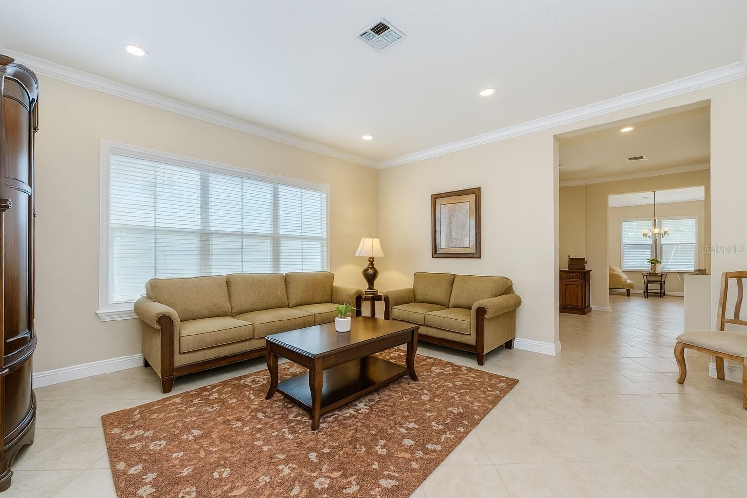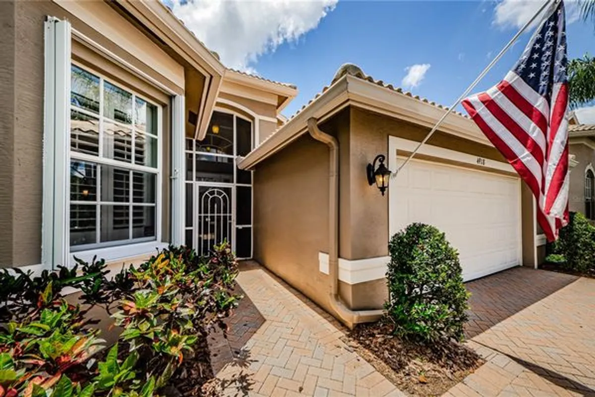 One or more photo(s) has been virtually staged. Nestled in the heart of the vibrant Valencia Lakes community, this elegant Roma floorplan by GL Homes offers the perfect blend of sophistication and functionality. Featuring 3 bedrooms plus a dedicated office, the spacious layout seamlessly integrates both formal and family living areas with an open-concept design. The chef’s kitchen is a culinary dream, boasting granite countertops, abundant cabinetry, and stylish tile flooring that complements the high-end appliances. The primary suite is a serene retreat, highlighted by a refined ceiling design and rich hardwood flooring. Its en-suite bathroom exudes spa-like luxury with generous vanity space and elegant lighting. Throughout the home, meticulous craftsmanship is evident—from crown molding to premium finishes. Lush landscaping and striking curb appeal welcome you to the expansive covered patio, which overlooks a tranquil pond, creating a peaceful outdoor living experience. Versatility is key, with a dedicated office, a flexible third bedroom or craft room, and a spacious two-car garage to accommodate a variety of lifestyle needs. Valencia Lakes, a premier 55+ resort-style community, offers residents access to an array of world-class amenities, ensuring an exceptional and enriching living experience.