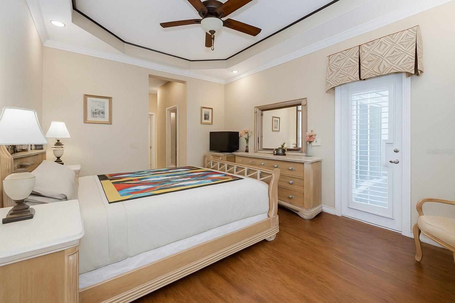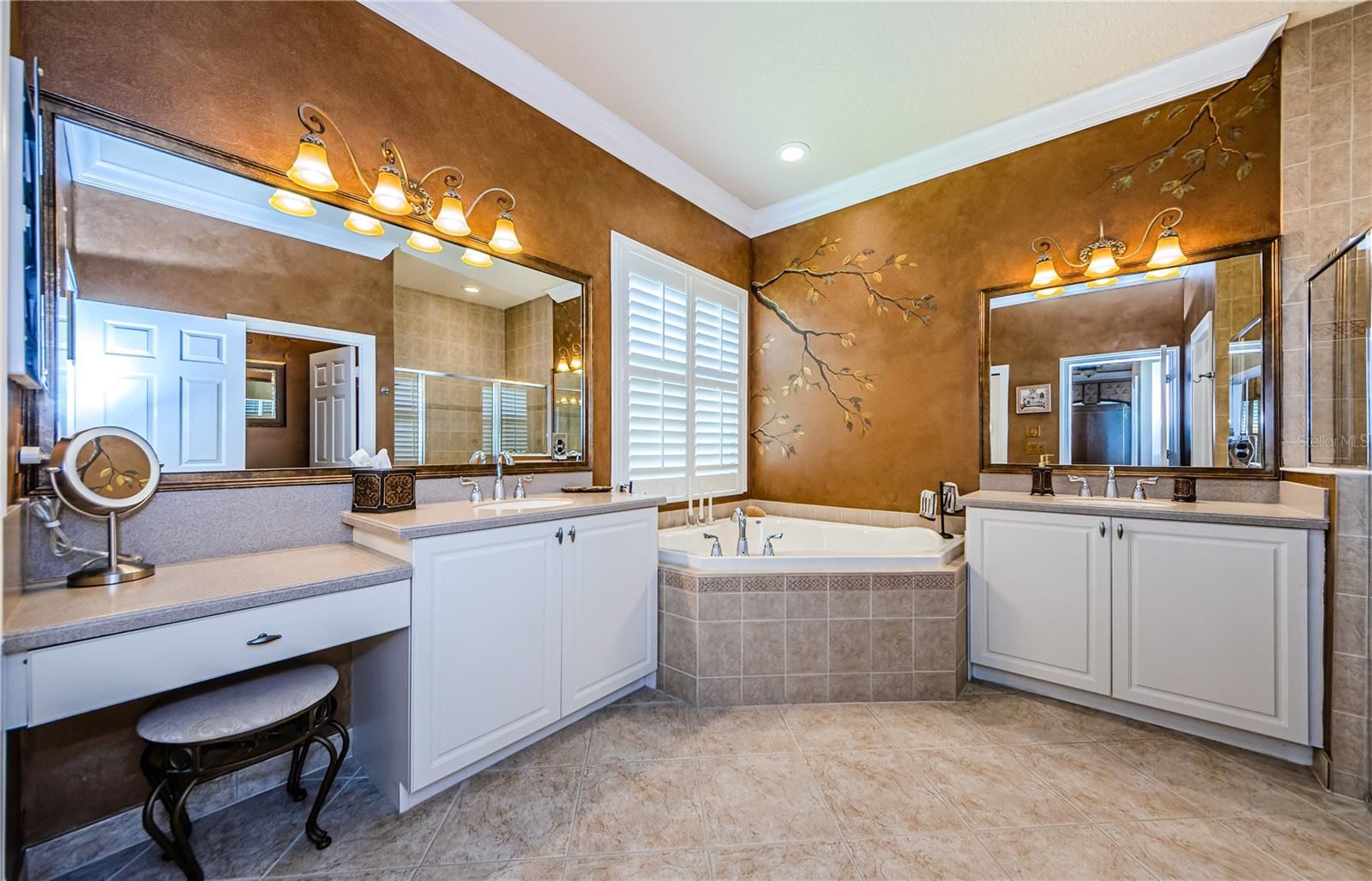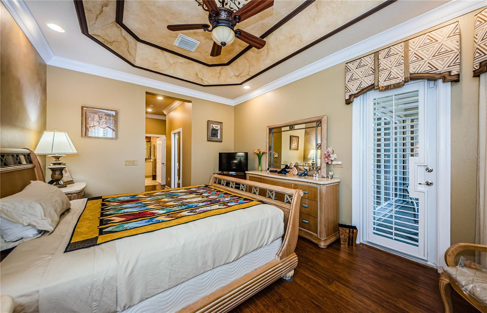 - Ceiling Fan(s), Coffered Ceiling(s), Crown Molding, Eat-in Kitchen, High Ceilings, Kitchen/Family Room Combo, Living/Dining Room, Open Floorplan, Main Level Primary, Solid Surface Counters, Solid-Wood Cabinets, Split Bedrooms, Tray Ceiling(s), Walk-In Closet(s)