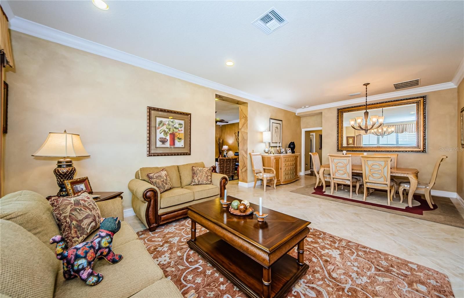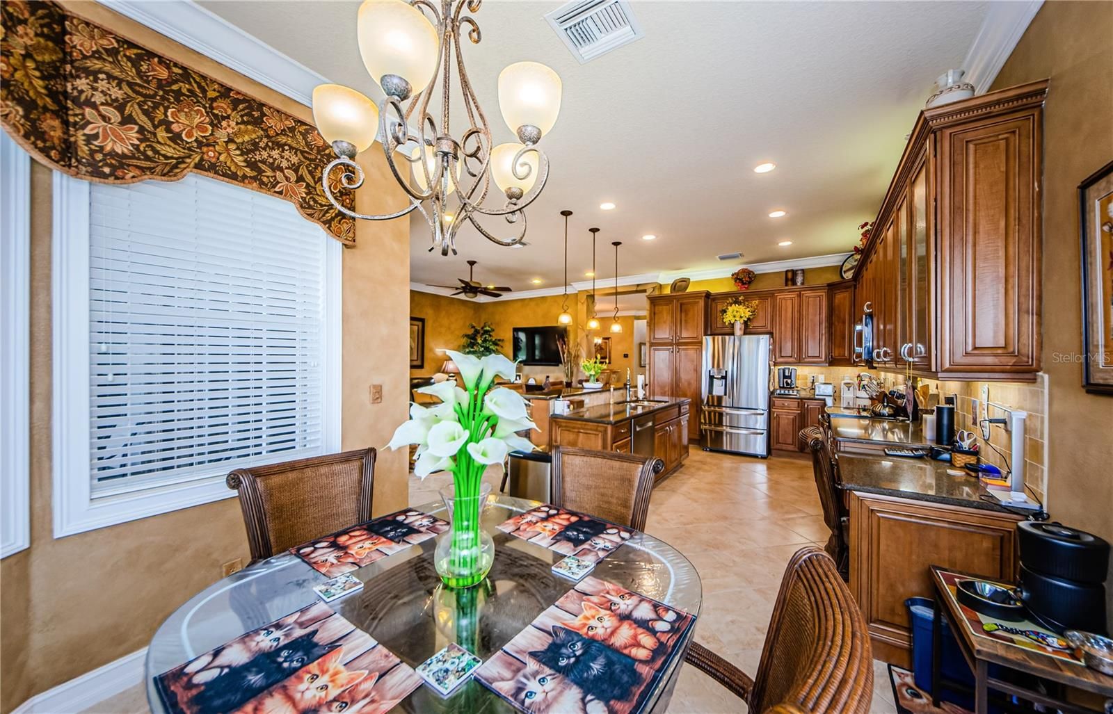 Nestled in the heart of the vibrant Valencia Lakes community, this elegant Roma floorplan by GL Homes offers the perfect blend of sophistication and functionality. Featuring 3 bedrooms plus a dedicated office, the spacious layout seamlessly integrates both formal and family living areas with an open-concept design. The chef’s kitchen is a culinary dream, boasting granite countertops, abundant cabinetry, and stylish tile flooring that complements the high-end appliances. The primary suite is a serene retreat, highlighted by a refined ceiling design and rich hardwood flooring. Its en-suite bathroom exudes spa-like luxury with generous vanity space and elegant lighting. Throughout the home, meticulous craftsmanship is evident—from crown molding to premium finishes. Lush landscaping and striking curb appeal welcome you to the expansive covered patio, which overlooks a tranquil pond, creating a peaceful outdoor living experience. Versatility is key, with a dedicated office, a flexible third bedroom or craft room, and a spacious two-car garage to accommodate a variety of lifestyle needs. Valencia Lakes, a premier 55+ resort-style community, offers residents access to an array of world-class amenities, ensuring an exceptional and enriching living experience.