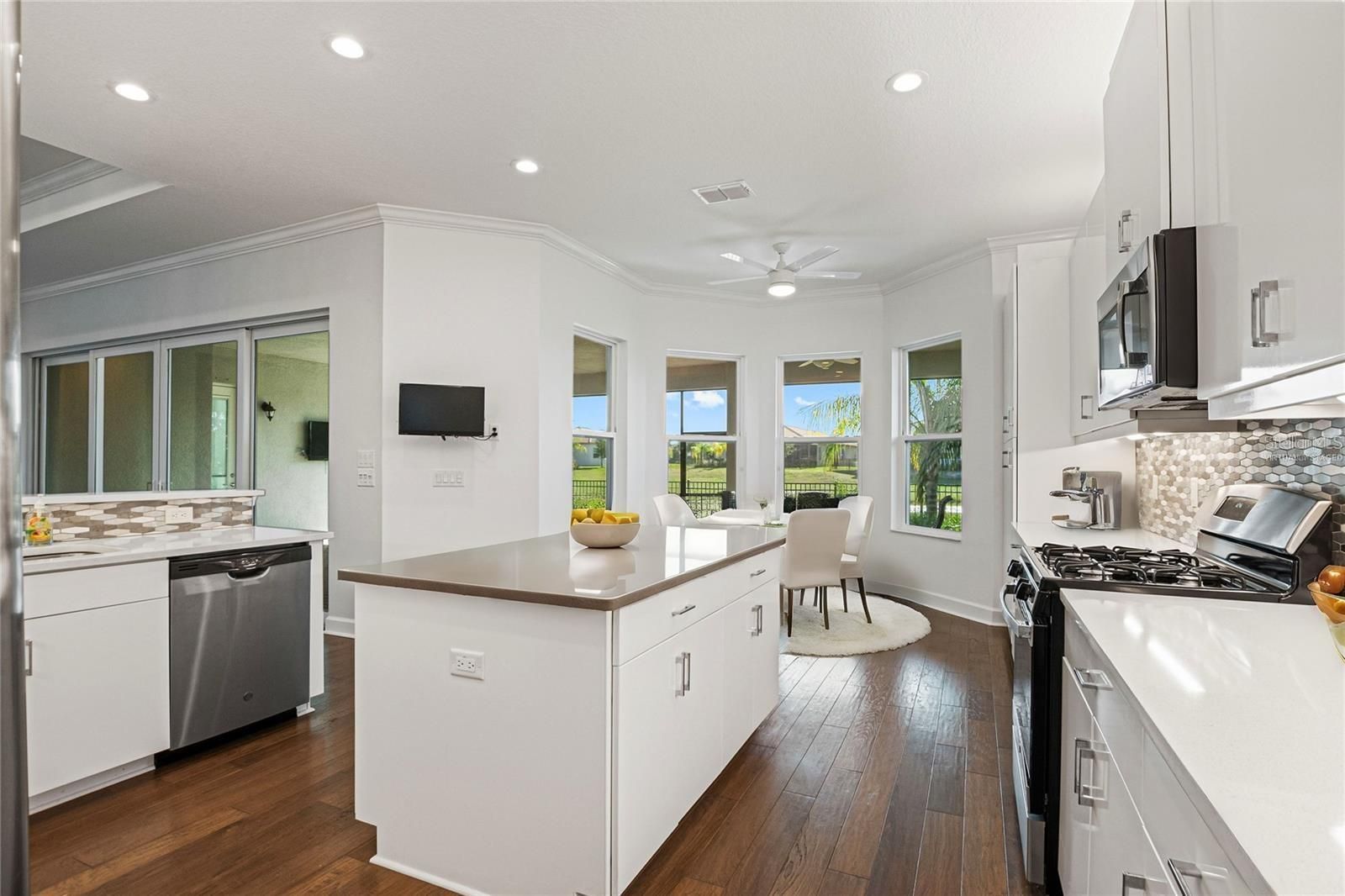 One or more photo(s) has been virtually staged. This luxurious Carlyle model home in the prestigious Valencia Del Sol 55+ resort-style community offers an exceptional blend of comfort, elegance, and thoughtful design. Spanning 3,072 square feet, the residence features three spacious bedrooms, a generous club room, three-and-a-half bathrooms, and a three-car garage, all ideally situated within walking distance of the community’s impressive 25,000-square-foot clubhouse and amenities. Upon entering through decorative double impact glass doors, you are welcomed by dramatic 16-foot coffered ceilings, a designer chandelier, crown molding, and engineered hardwood flooring throughout the main living areas. The open-concept layout seamlessly connects the great room with the gourmet kitchen, casual dining, and formal dining spaces, creating an inviting setting for both everyday living and entertaining. The great room is highlighted by a double-coffered ceiling and expansive 8-foot impact glass sliders that open to an extended, covered, screened lanai featuring serene water views, ceiling fans, and lighting. Designed into the roofline for maximum indoor-outdoor living, the lanai also includes an outlet for a future spa, making it a truly unique and functional space. The chef-inspired kitchen showcases a large center island, quartz countertops with an 18-inch serving bar, 42-inch high-gloss cabinetry, a designer backsplash, and stainless steel appliances. Adjacent to the kitchen, the formal dining room is ideal for hosting special occasions and is accented by a stunning crystal chandelier. The primary suite serves as a private retreat with a coffered ceiling, two walk-in closets, a sitting bay, and an exterior door that opens to peaceful water views. The spa-like ensuite bathroom features separate vanities with quartz countertops, a walk-in shower with a built-in seat and frameless glass, and a Roman tub with a panel surround. Designed with privacy in mind, the second and third bedrooms each have their own bathrooms, while the spacious club room offers additional living space and direct access to the third-car garage. The well-appointed laundry room includes abundant storage, a utility sink, and a folding counter with cabinetry. Additional highlights include solar panels that keep the average monthly electric bill around $25, impact glass windows and doors, a fenced backyard, tankless gas water heater, central vacuum system, custom window treatments, and an epoxy-finished garage floor. Valencia Del Sol delivers an unparalleled 55+ resort lifestyle with a saltwater pool, state-of-the-art fitness center, tennis and pickleball courts, bocce ball, dog park, arts and crafts studios, live shows, a bistro, and more. A tour of the community clubhouse is a must to fully appreciate the extraordinary amenities and lifestyle this home offers.